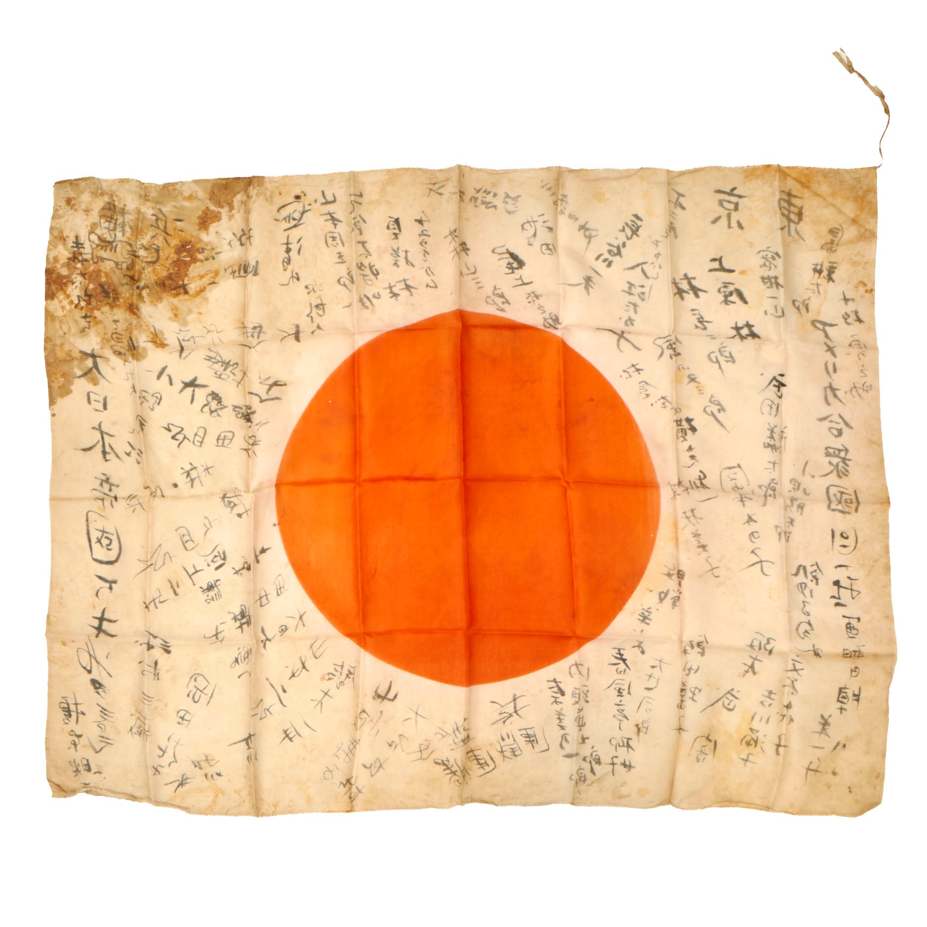 It is also signed with the names of many friends and family, some radiating out from the center. The flag measures approximately 28" x 36", and is made of what appears to be rayon cloth, an early faux silk semi-synthetic material made from wood, with the red "sun" dyed into the middle. This example has no leather tabs and instead has small string coming from two corners, but it is missing on one corner. The flag is in great battlefield pickup condition and is and is the real deal: a genuine USGI "bring back"! The bloodstain on the right top corner definitely makes this a macabre piece, but one very worthy of framing and display to represent the true horrors of war.