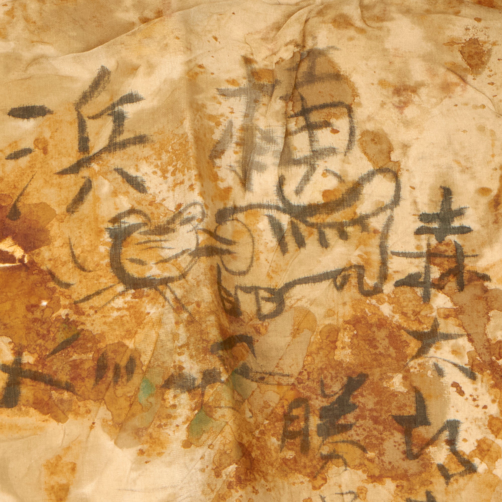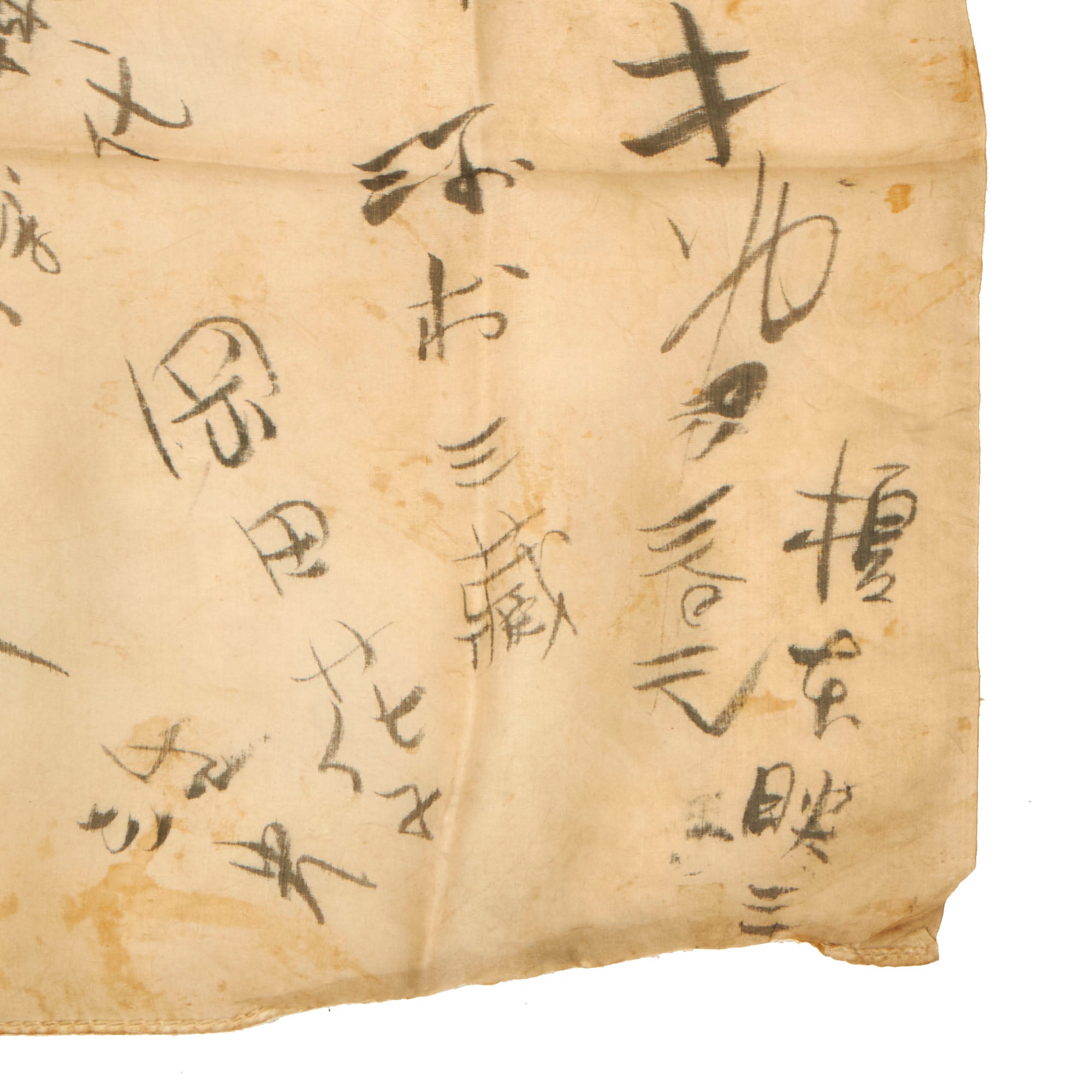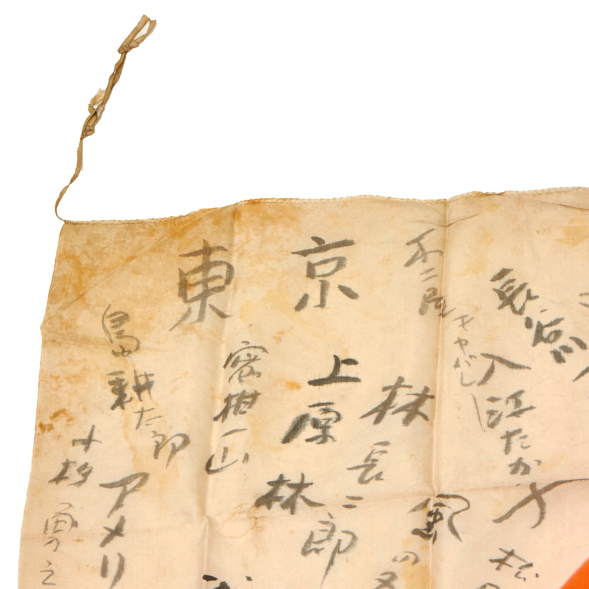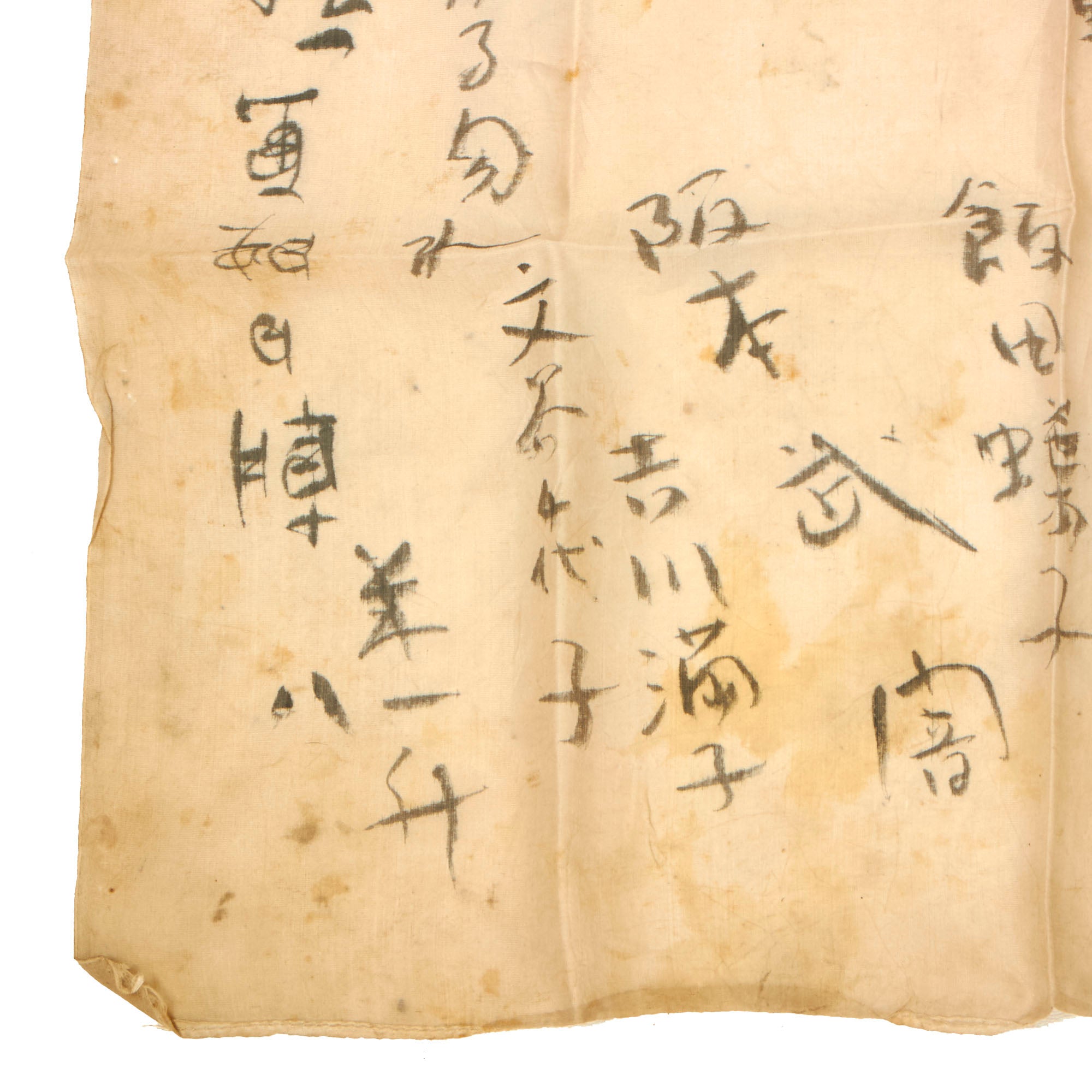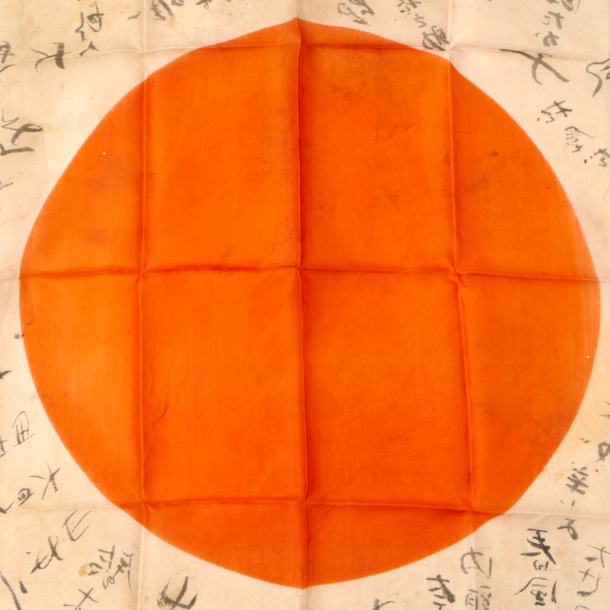 The Japanese call their country's flag hinomaru, which translates literally to "sun-round", referencing the red circle on a white field. When the hinomaru was signed, the Japanese characters were usually written vertically, and radiated outward from the edge of the red circle. This practice is referenced in the second term, yosegaki, meaning "sideways-writing". The phrase hinomaru-yosegaki can be interpreted as "To write sideways around the red sun", describing the appearance of the signed flag. This particular example is completely unique and is written in old KANJI. The writings are mainly Japanese names of this soldier's family and friends with quotes and phrases.