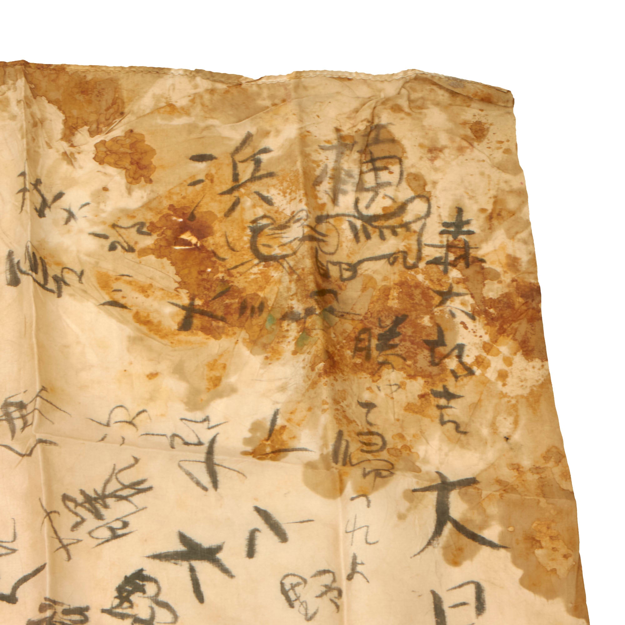 Original Item. One-of-a-Kind. This is a truly gruesome reminder of the horrors of war. This hand painted cloth flag is marked with battle quotes such as "Banzai", and "Good Luck", along with many signatures of friends & family. This example has more signatures and writing than most we have seen. The top right corner of this example is heavily stained with what is very obviously blood, and was likely taken from the body of a Japanese soldier by an American. One very interesting inscription is on the far left, with a mention of the United States of America. We are unsure if this is damning America, or mentioning it for some other reason, but it will certainly make for a fascinating research project.