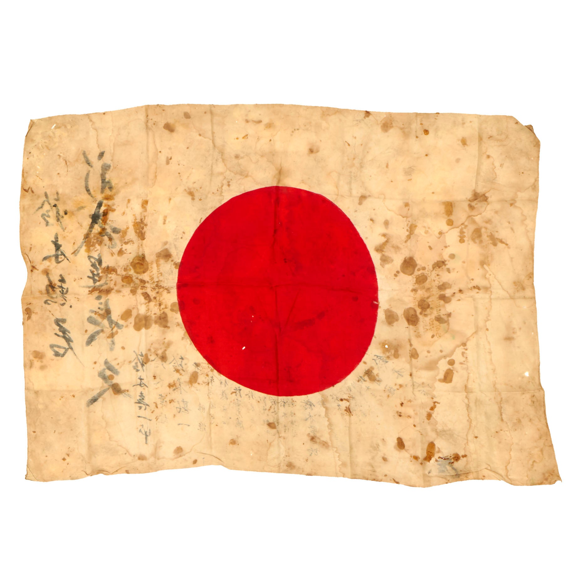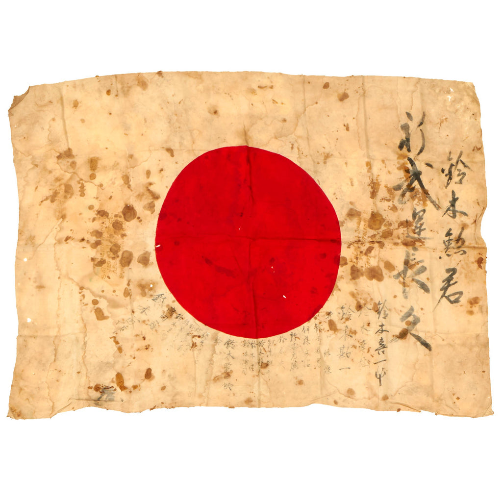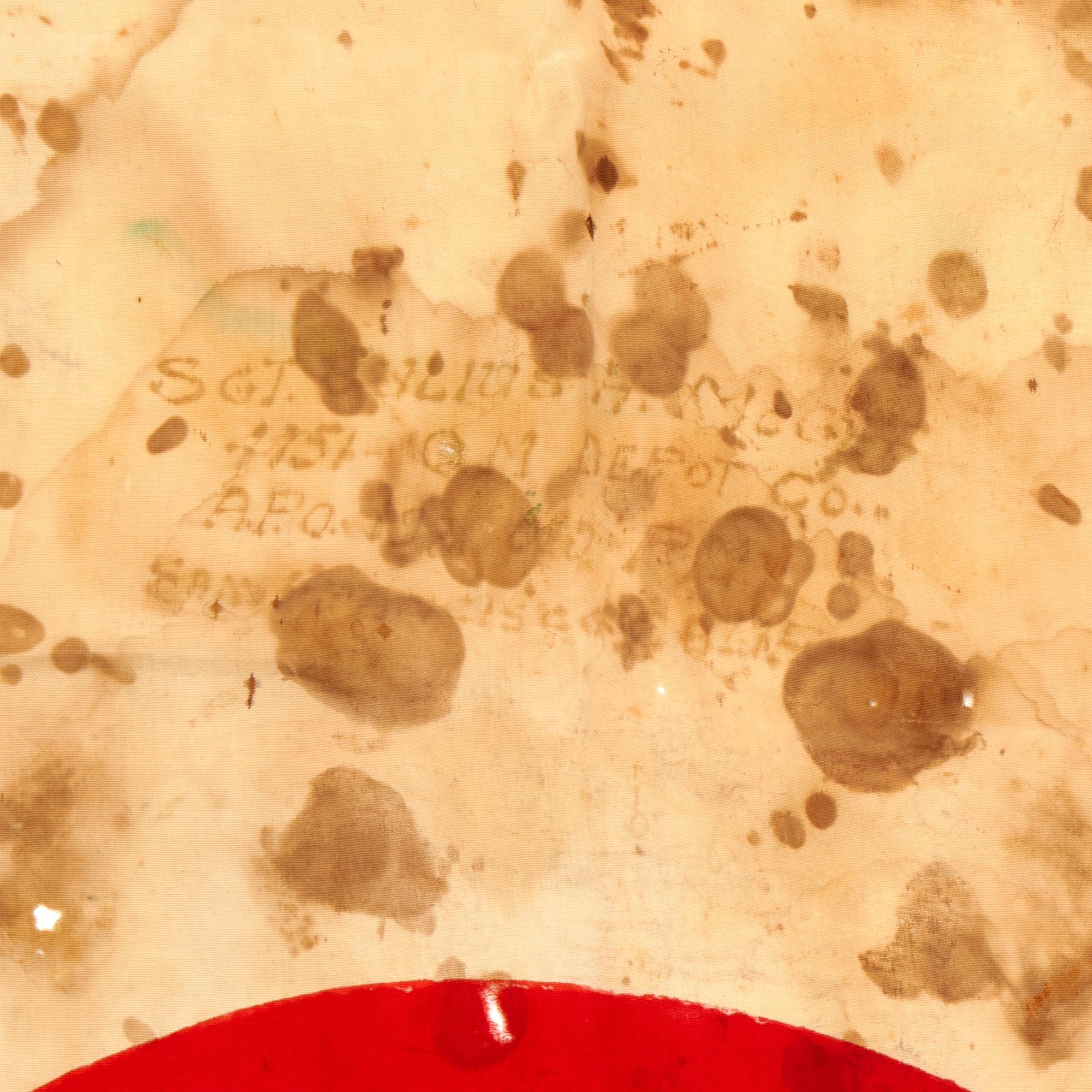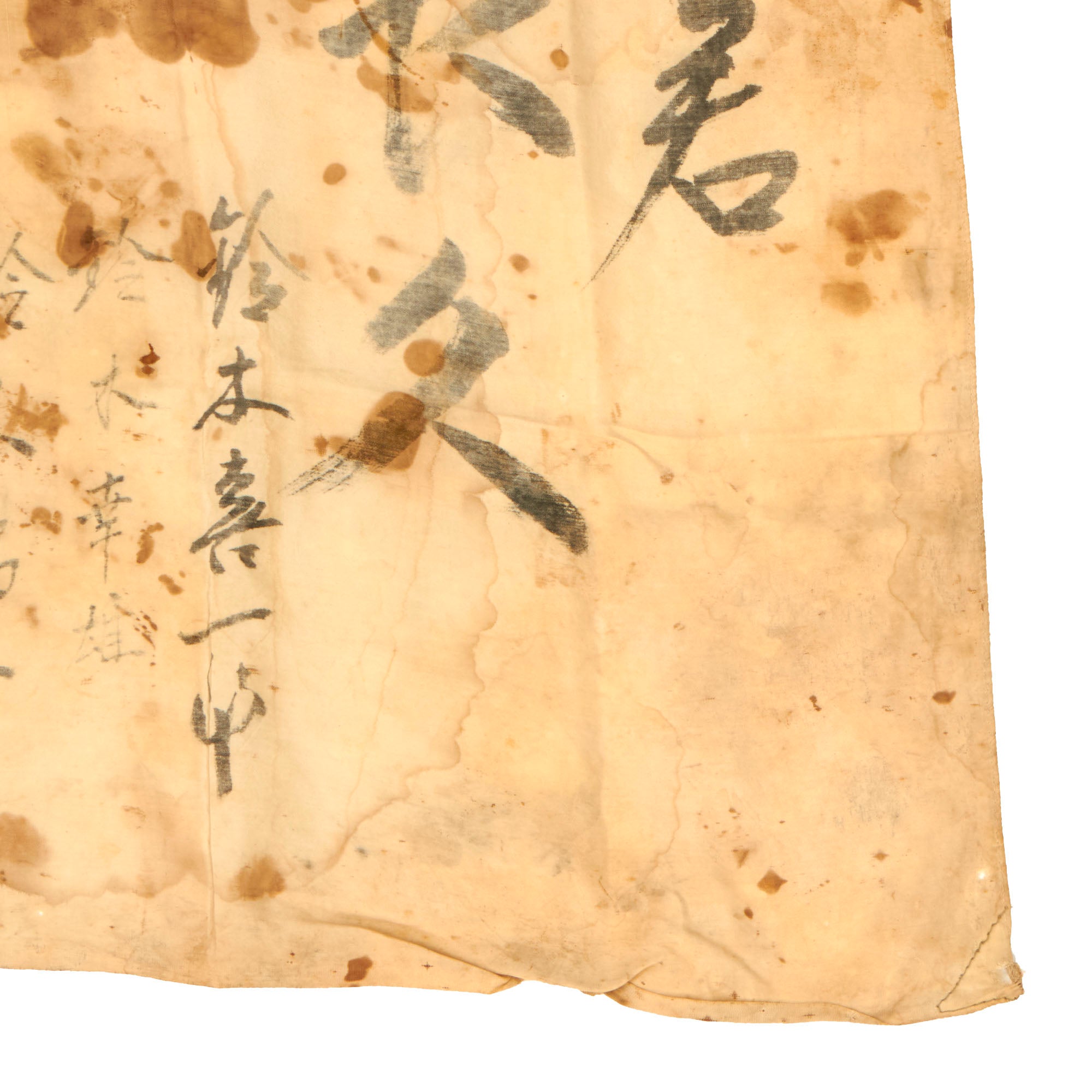 Original Item: One-of-a-kind. This hand painted silk flag has less writing than others we have seen, but it more than makes up for it with its large size and having been captured and signed by American soldiers. As with many good luck flags, the flag is marked (second line from the right) with the Japanese phrase 久 長 運 武 祈, which reads Bu un Chou kyu Inoru ("A prayer that your military fortunes be long lasting.") There are lots of other kanji present, making this a prime candidate for a translation project.