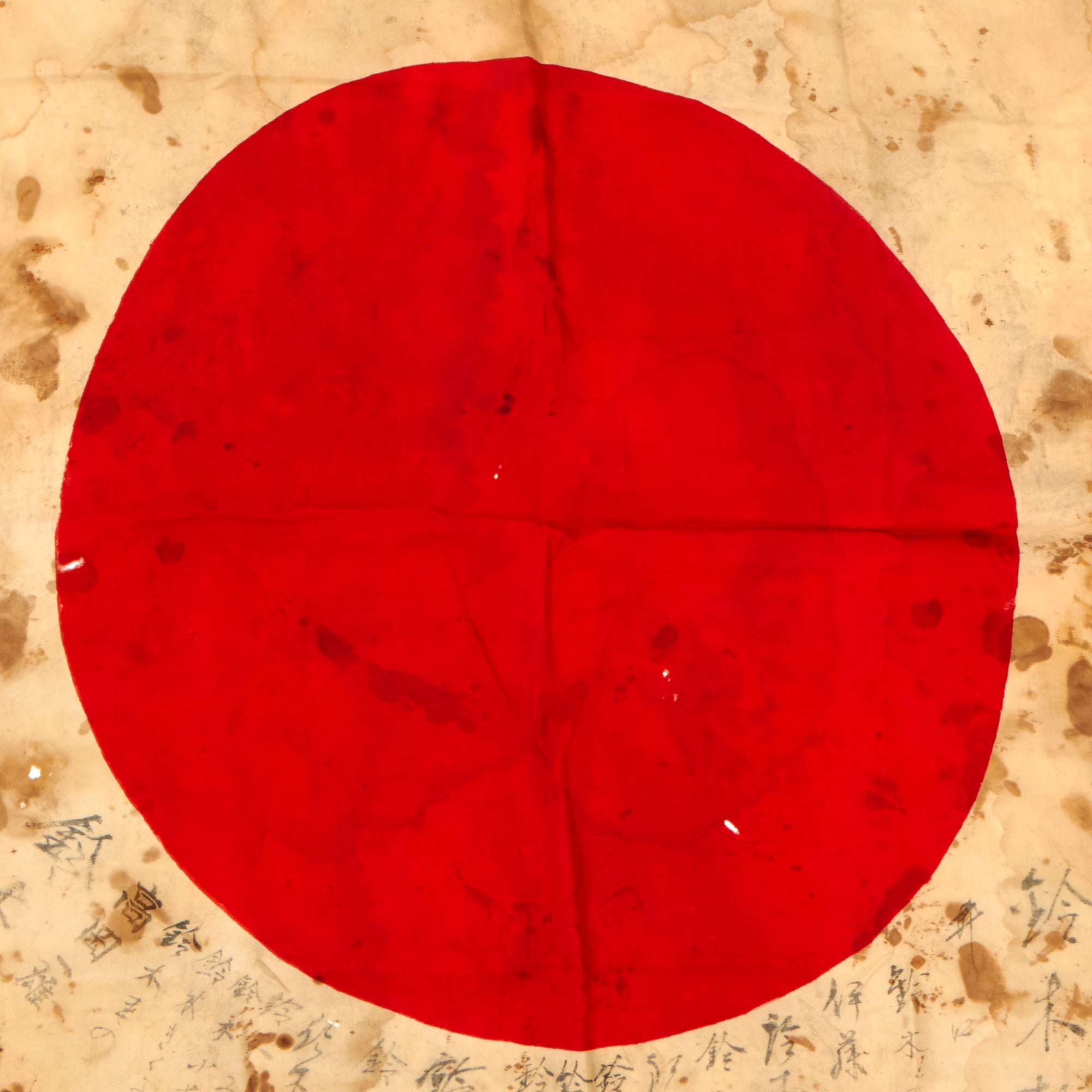 The Japanese call their country's flag hinomaru, which translates literally to "sun-round", referencing the red circle on a white field. When the hinomaru was signed, the Japanese characters were usually written vertically, and radiated outward from the edge of the red circle. This practice is referenced in the second term, yosegaki, meaning "sideways-writing". The phrase hinomaru-yosegaki can be interpreted as "To write sideways around the red sun", describing the appearance of the signed flag. This particular example completely unique is written in old KANJI the writing are mainly Japanese names of this soldier's family and friends with quotes and phrases.