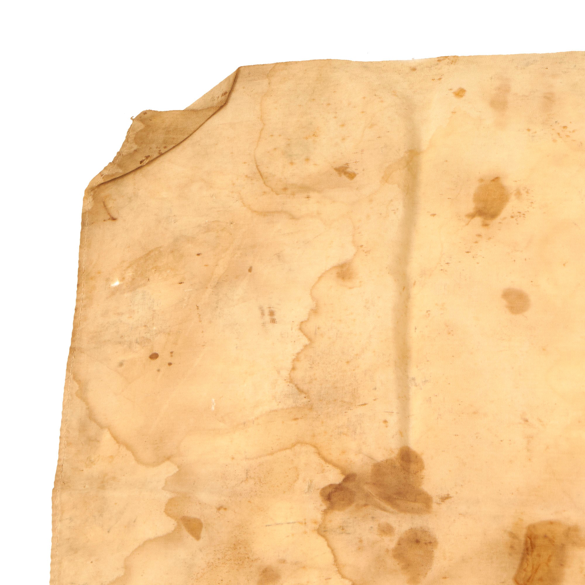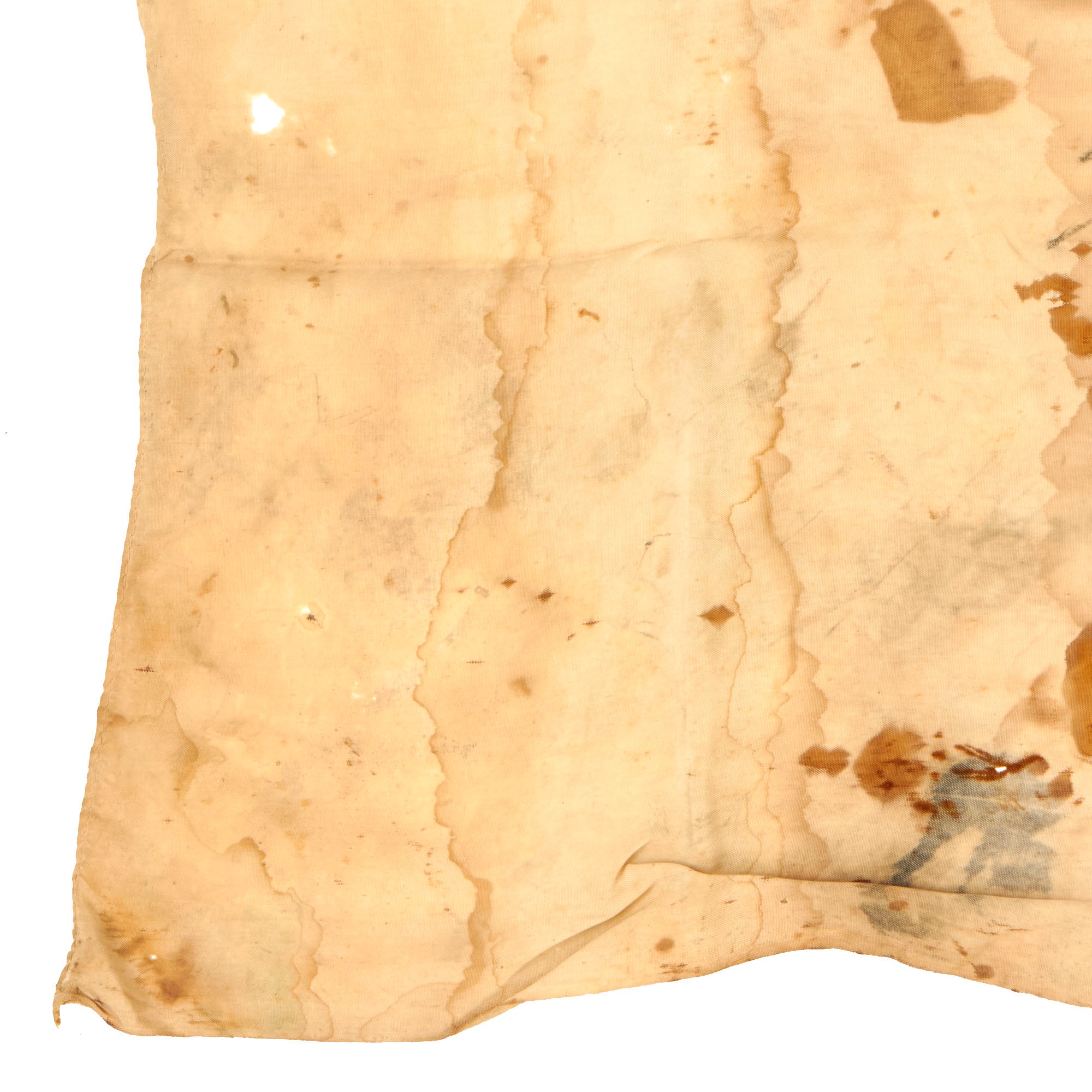 The flag is made of high quality rayon style fabric, with the red "sun" sewn into the middle. Flag is in very good condition and is the real deal: a genuine USGI bring back! This is one of the most service-worn examples we have seen, with heavy staining across the flag, but one that was definitely taken off of a Japanese soldier in the field, making this a fantastic example that would do very well with some proper framing. The original leather tabs at the ends are absent, which makes sense given its condition.