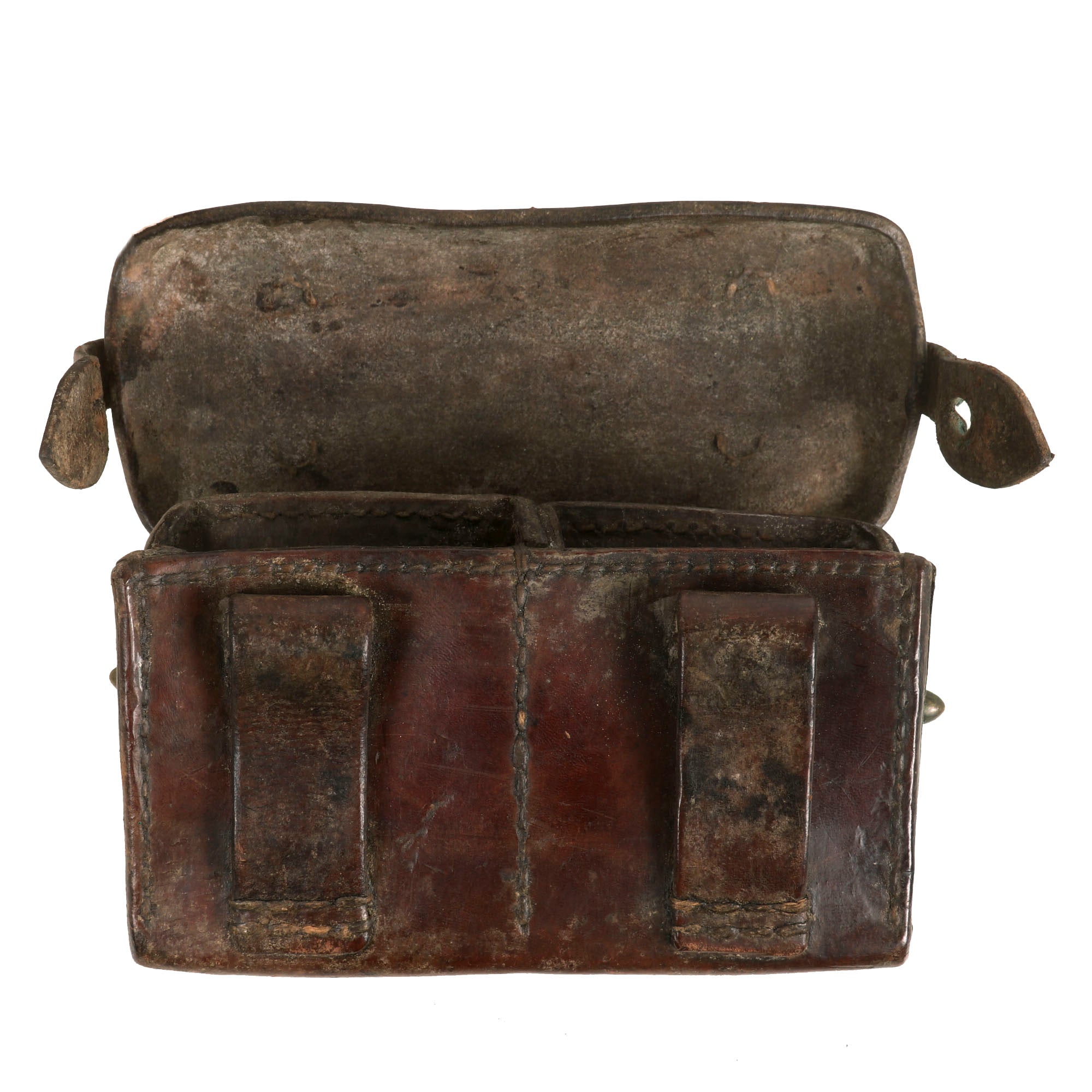 This pouch shows signs of honest period use, and storage wear that has accumulated from decades of storage and handling. It has all components, including the original leather closure tab. The inside retains its original section divider. All stitching is intact and nice and tight.