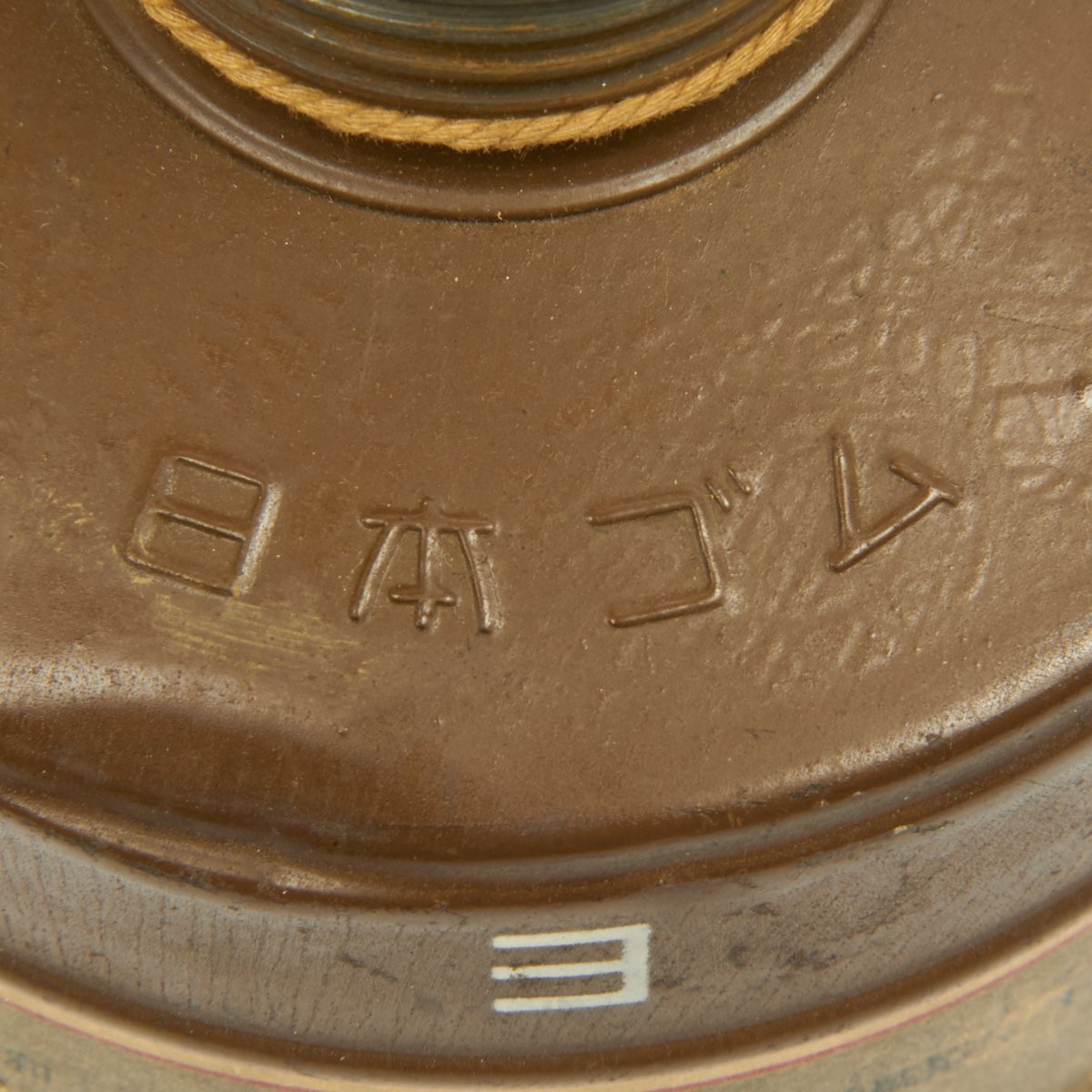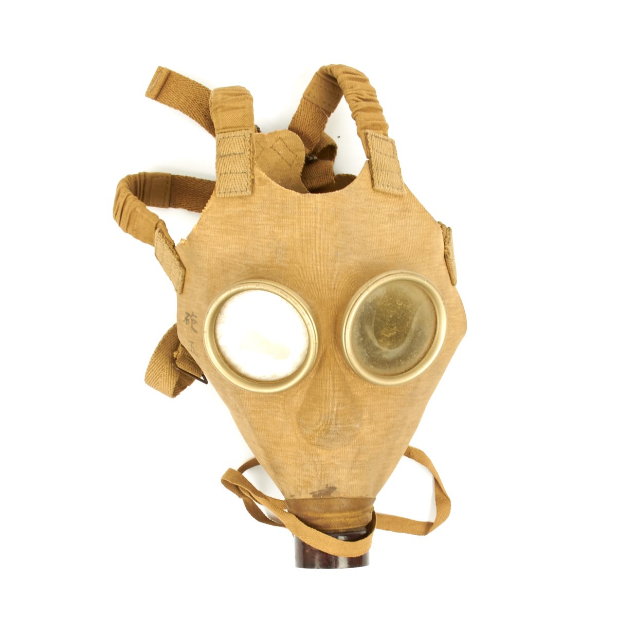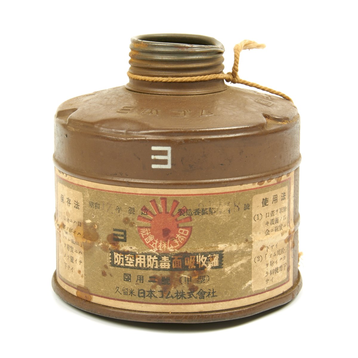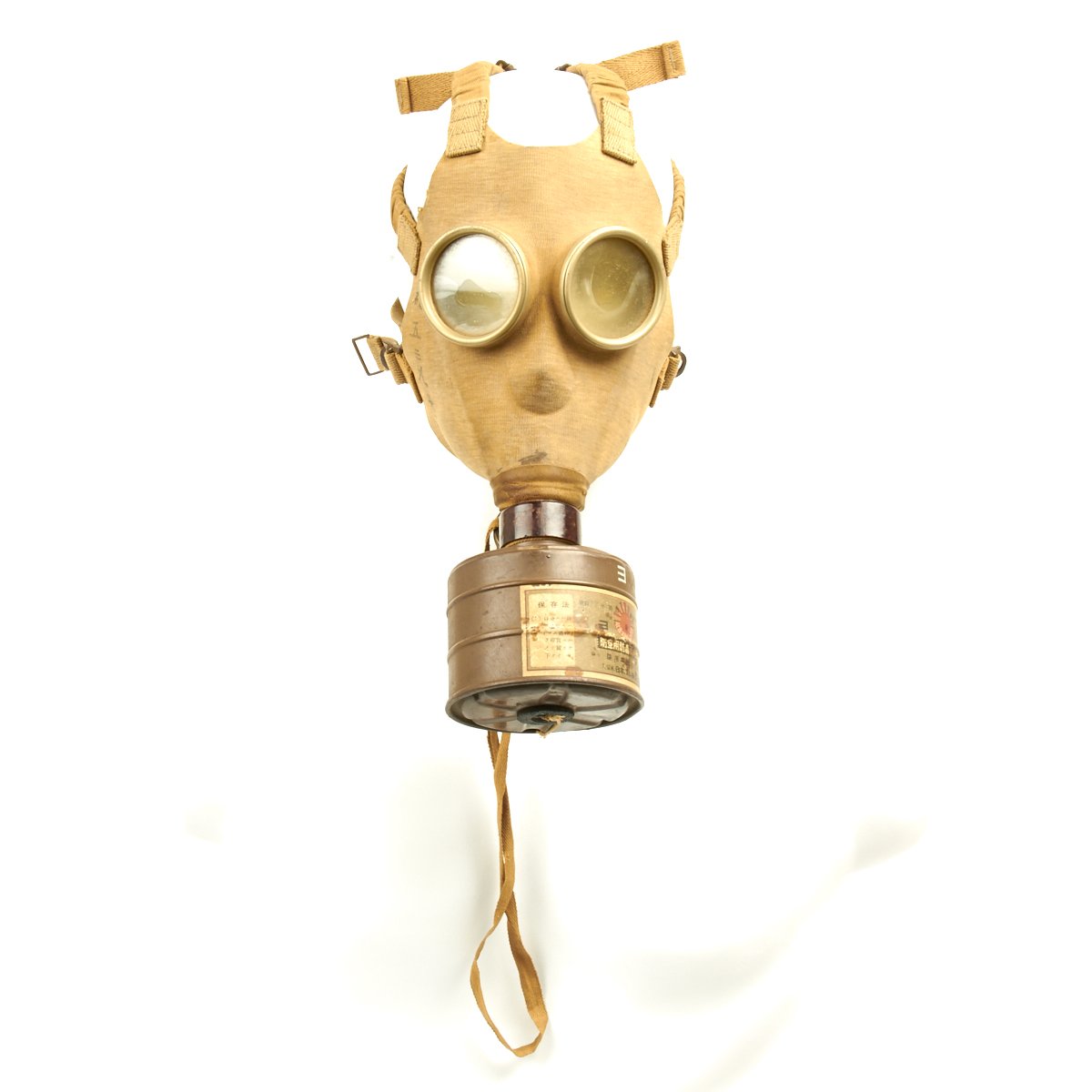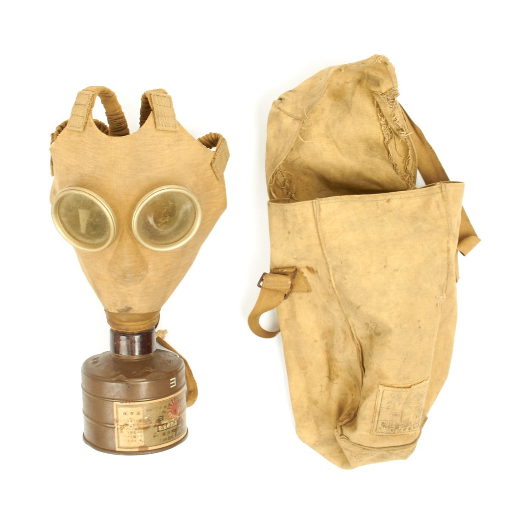 Original Item: Only One Available. Genuine WWII issue Japanese rubberized face mask with metal rimmed lenses. Filter can has never been used with original seal still intact and the can has a wonderful full color paper label with instructions. Lenses are in good condition with no cracks. Rubberized material is soft and pliable, mask is ink stamped, straps are all present and in very good condition. The carry bag is also in very good condition with maker stamps and label. Overall this is one of the best masks we have ever encountered.