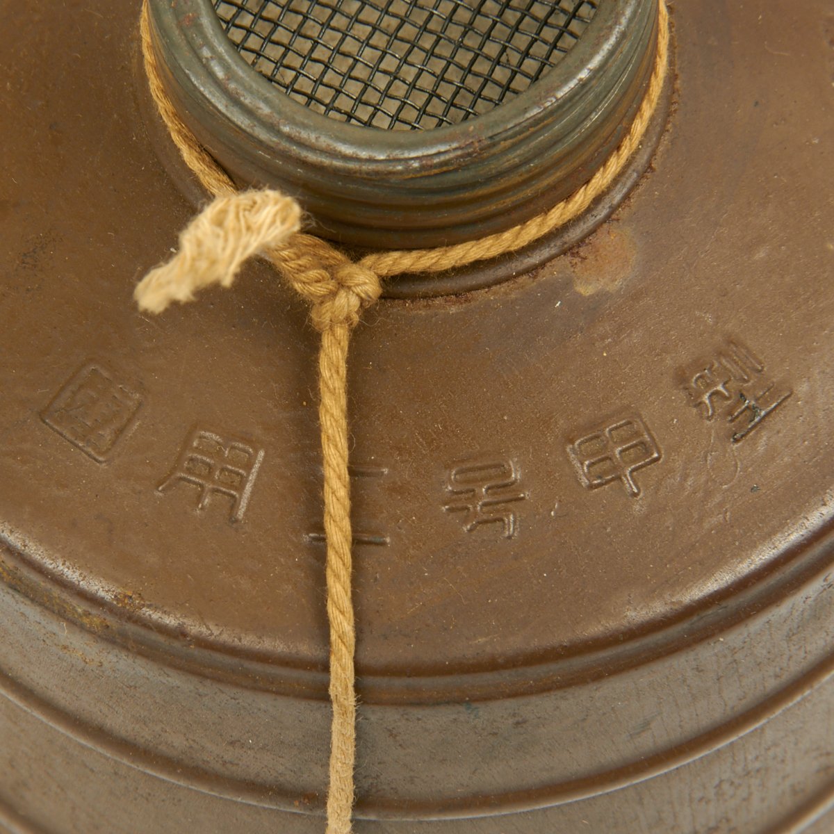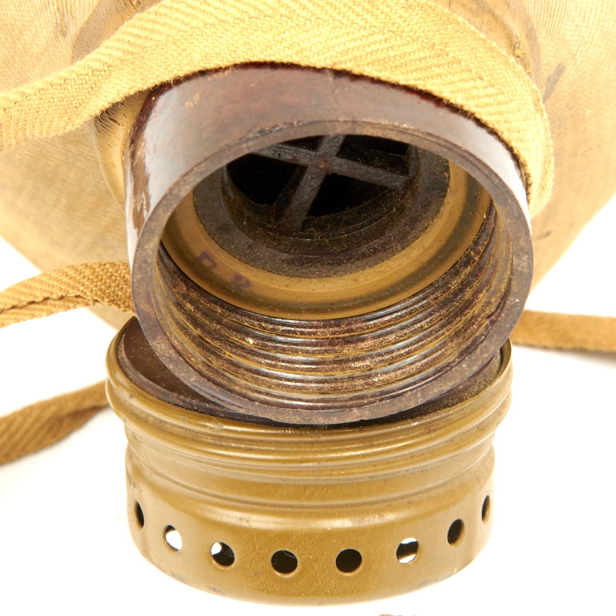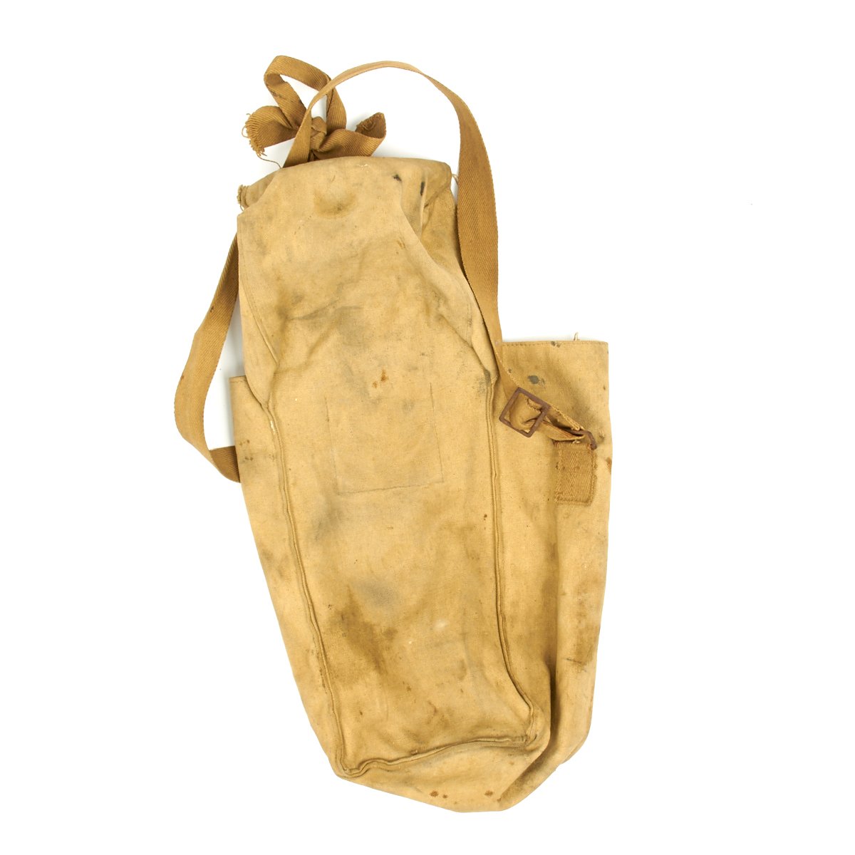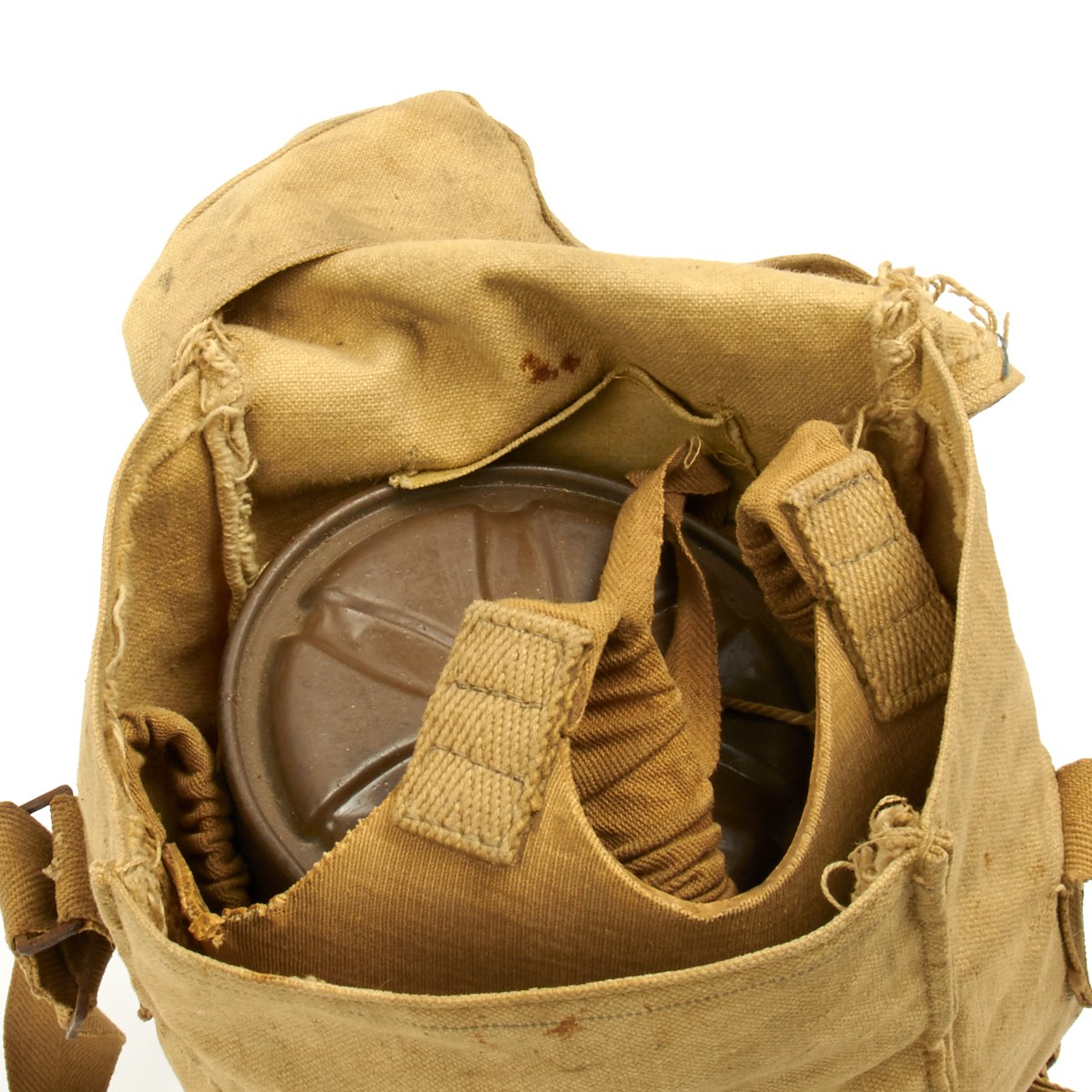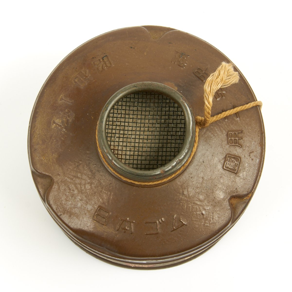 Original Item: Only One Available. Genuine WWII issue Japanese rubberized face mask with metal rimmed lenses. Filter can has never been used with original seal still intact and the can has a wonderful full color paper label with instructions. Lenses are in good condition with no cracks. Rubberized material is soft and pliable, mask is ink stamped, straps are all present and in very good condition. The carry bag is also in very good condition with maker stamps and label. Overall this is one of the best masks we have ever encountered.