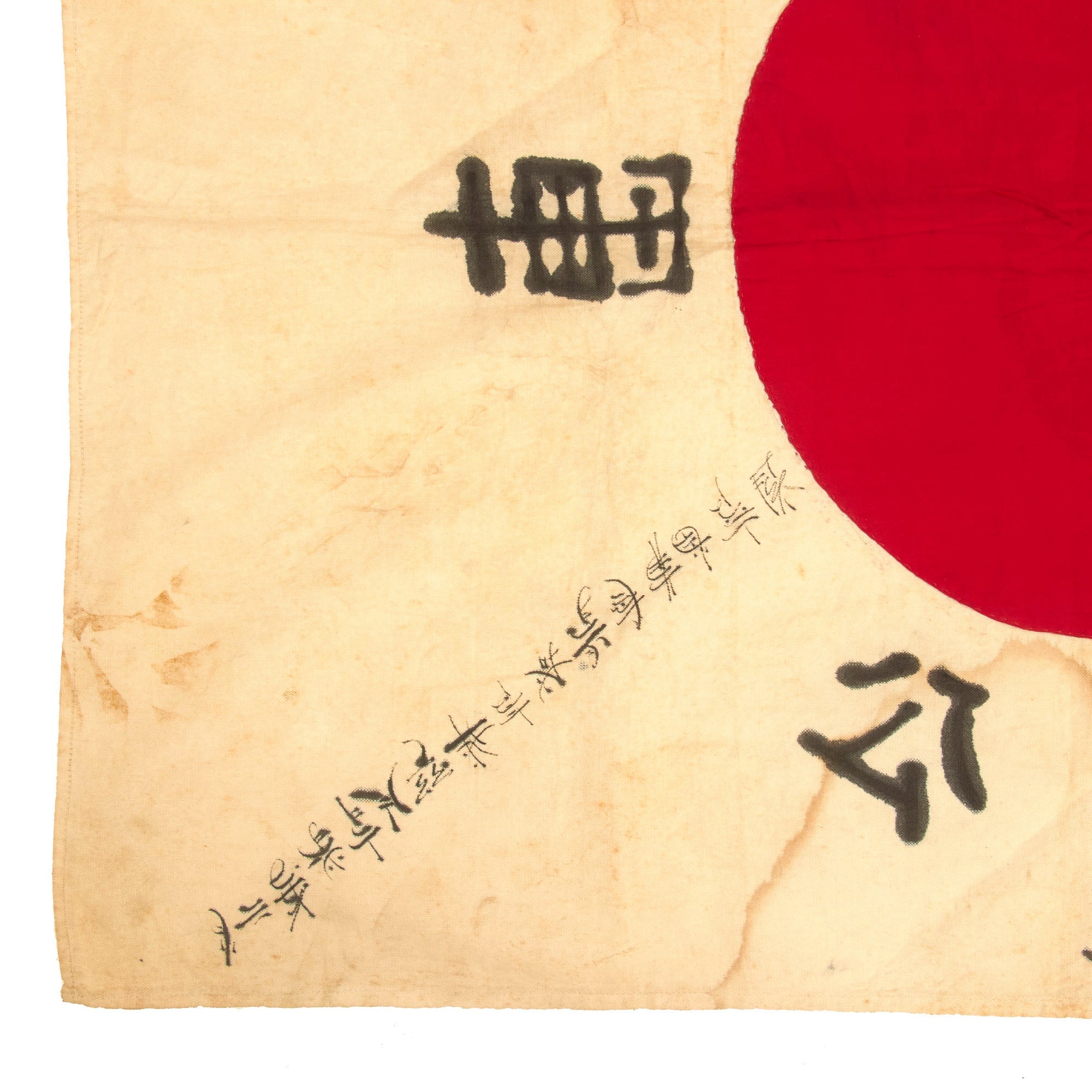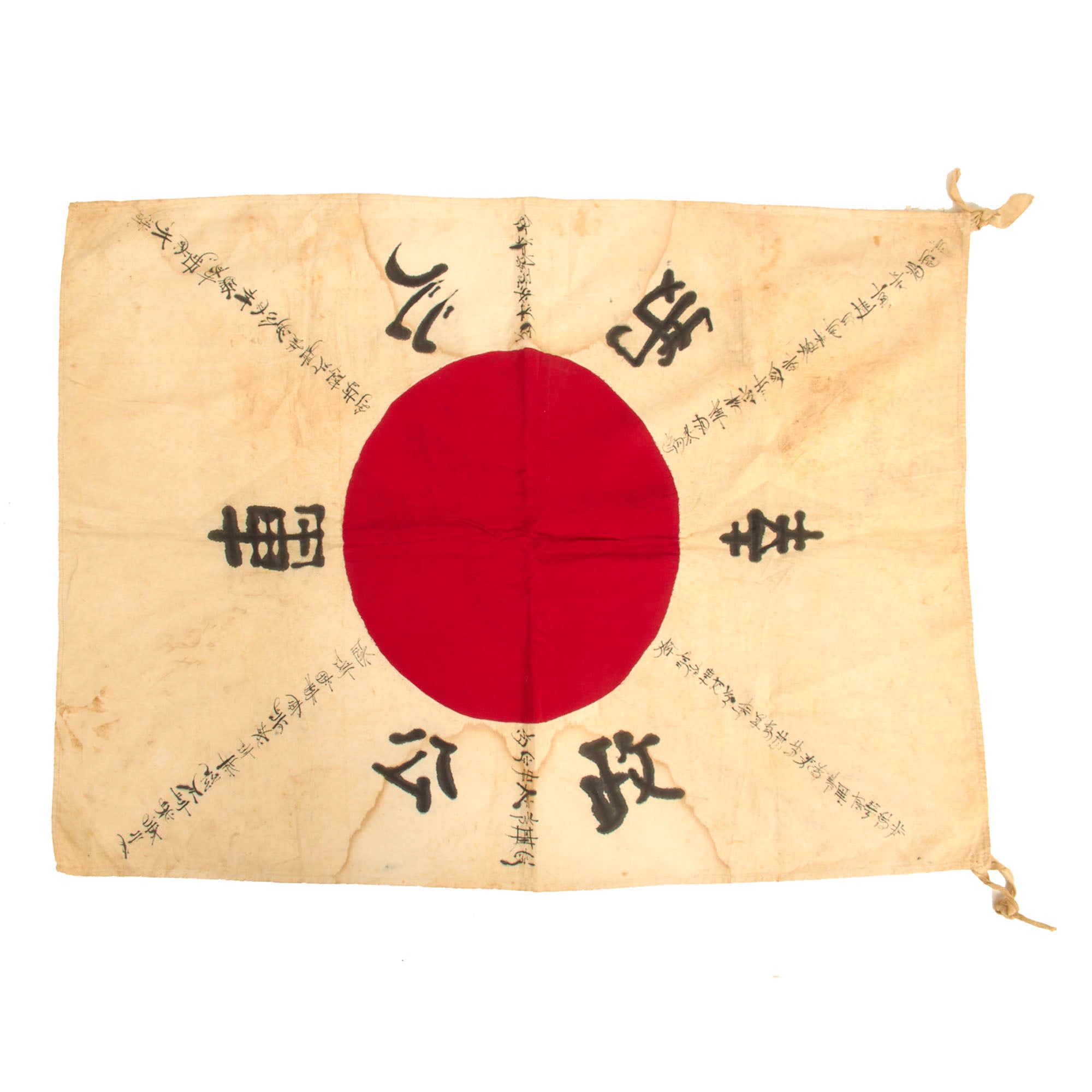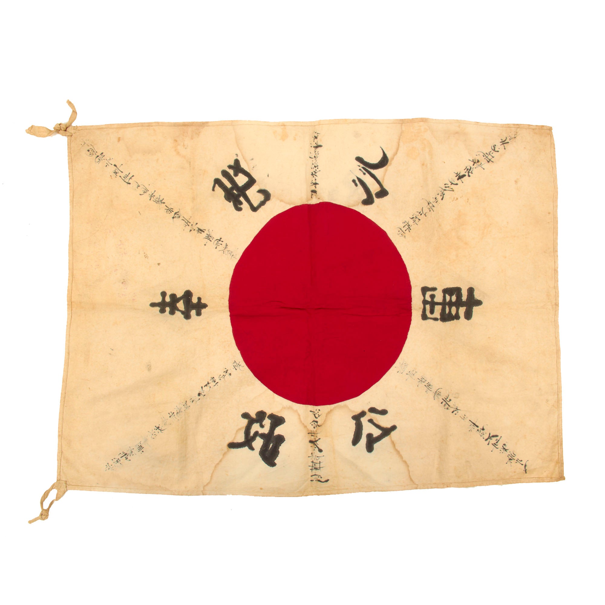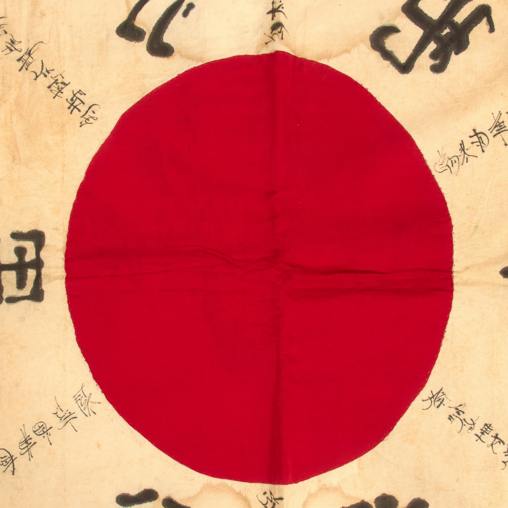 The phrase hinomaru-yosegaki can be interpreted as "To write sideways around the red sun", describing the appearance of the signed flag. This particular example completely unique is written in old KANJI the writing are mainly Japanese names of this soldier's family and friends with quotes and phrases.