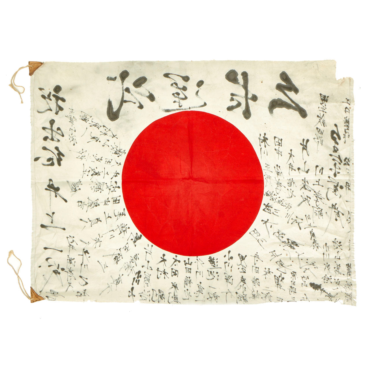 The Japanese call their country's flag hinomaru, which translates literally to "sun-round", referencing the red circle on a white field. When the hinomaru was signed, the Japanese characters were usually written vertically, and radiated outward from the edge of the red circle. This practice is referenced in the second term, yosegaki, meaning "sideways-writing". The phrase hinomaru-yosegaki can be interpreted as "To write sideways around the red sun", describing the appearance of the signed flag. This particular example completely unique is written in old KANJI the writing are mainly Japanese names of this soldier's family and friends with quotes and phrases.