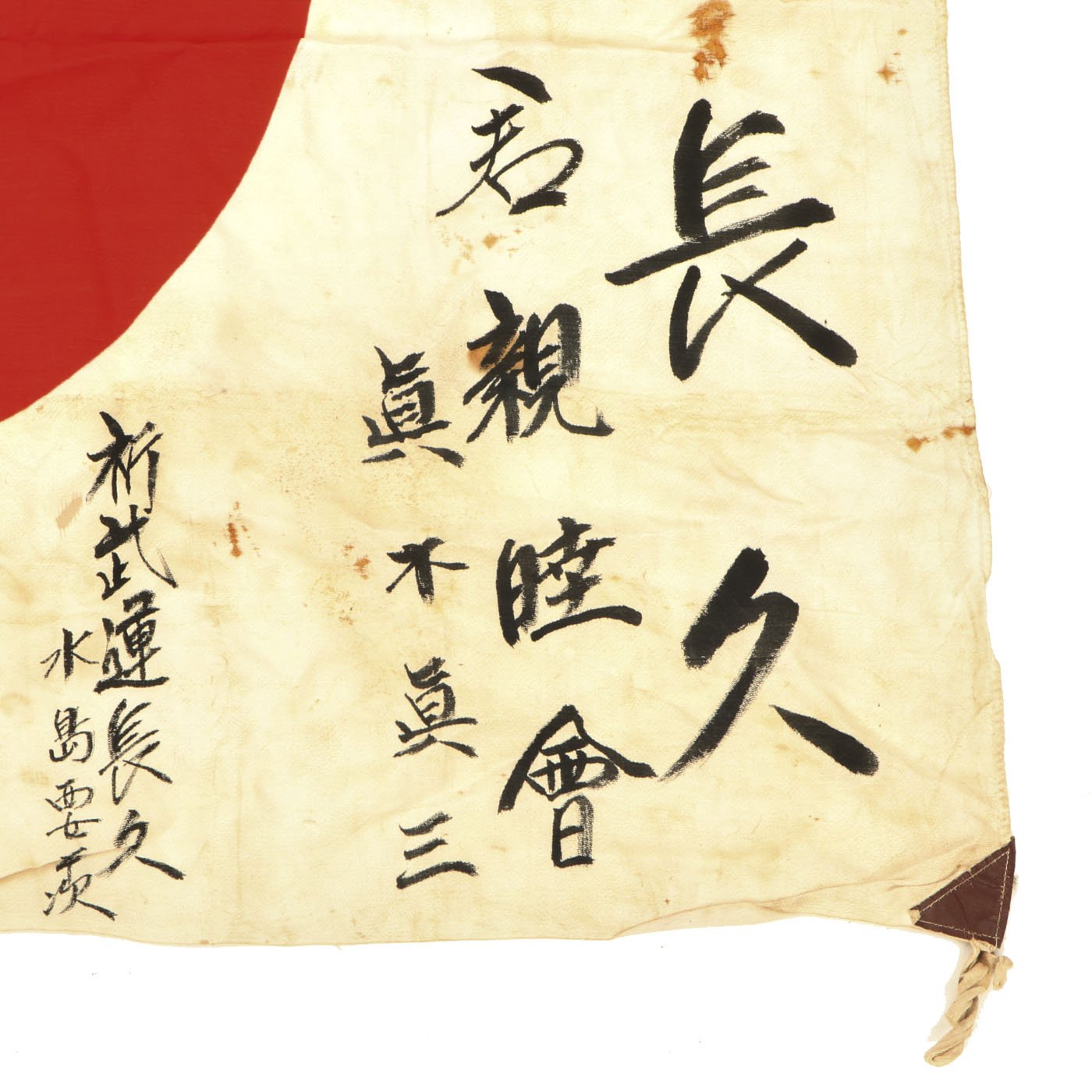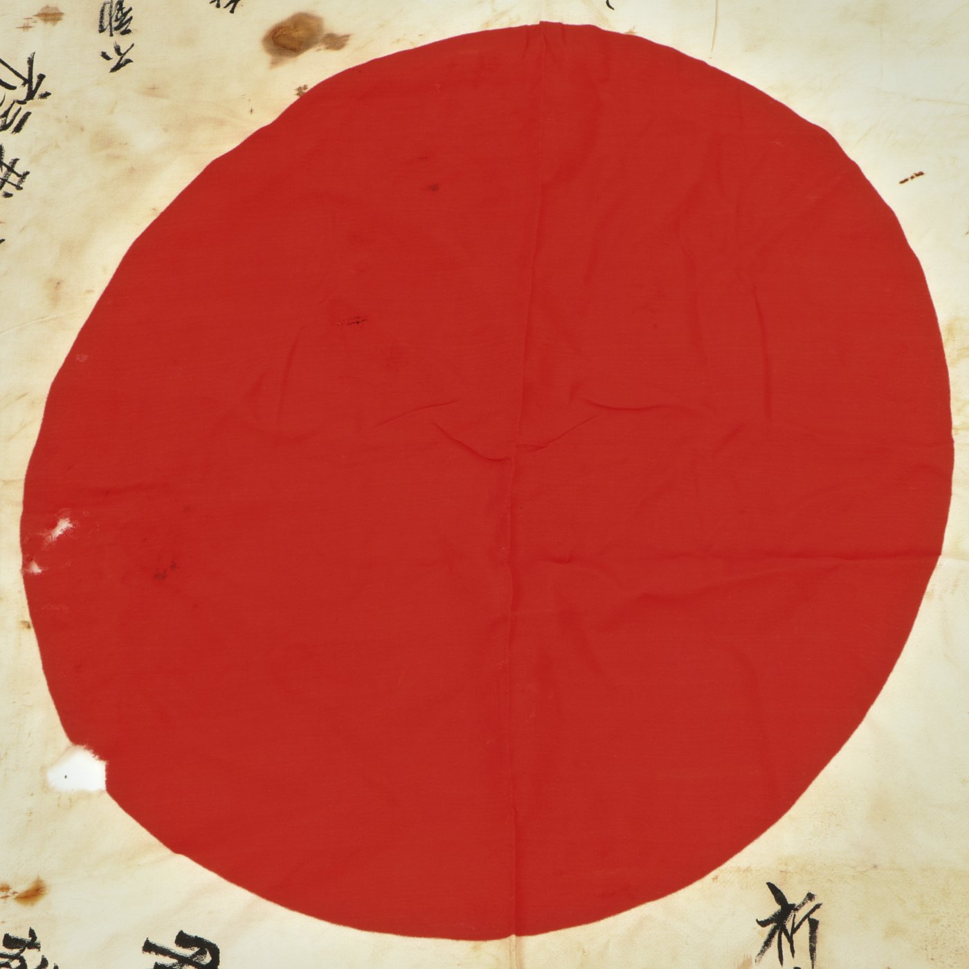 The Japanese call their country's flag hinomaru, which translates literally to "sun-round", referencing the red circle on a white field. When the hinomaru was signed, the Japanese characters were usually written vertically, and radiated outward from the edge of the red circle. This practice is referenced in the second term, yosegaki, meaning "sideways-writing". The phrase hinomaru-yosegaki can be interpreted as "To write sideways around the red sun", describing the appearance of the signed flag. This particular example completely unique is written in old KANJI the writing are mainly Japanese names of this soldier's family and friends with quotes and phrases.