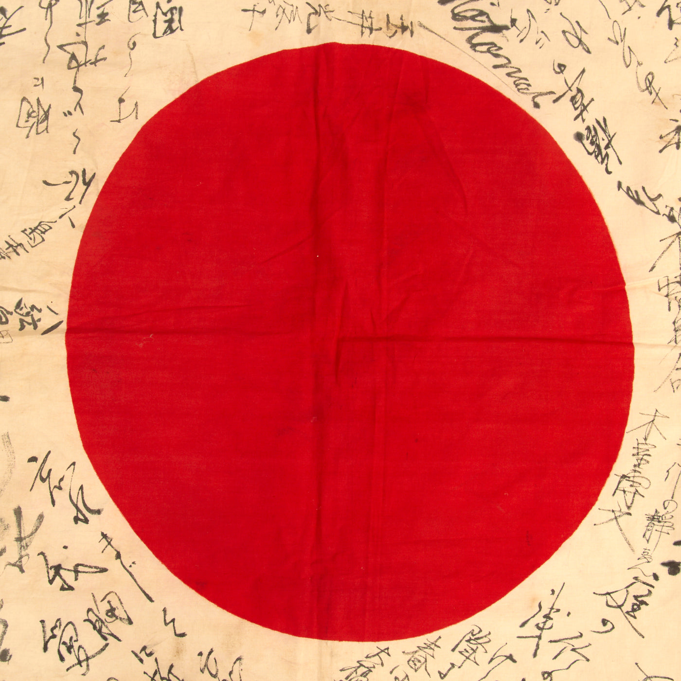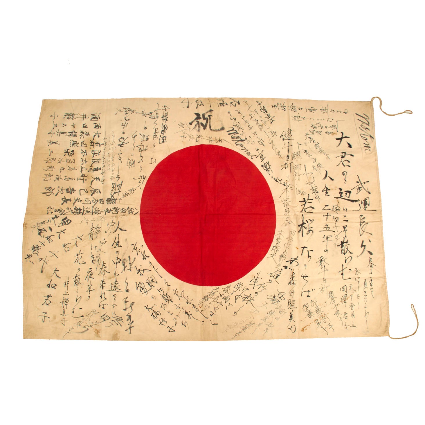 The phrase hinomaru-yosegaki can be interpreted as "To write sideways around the red sun", describing the appearance of the signed flag. This particular example completely unique is written in old KANJI the writing are mainly Japanese names of this soldier's family and friends with quotes and phrases.
