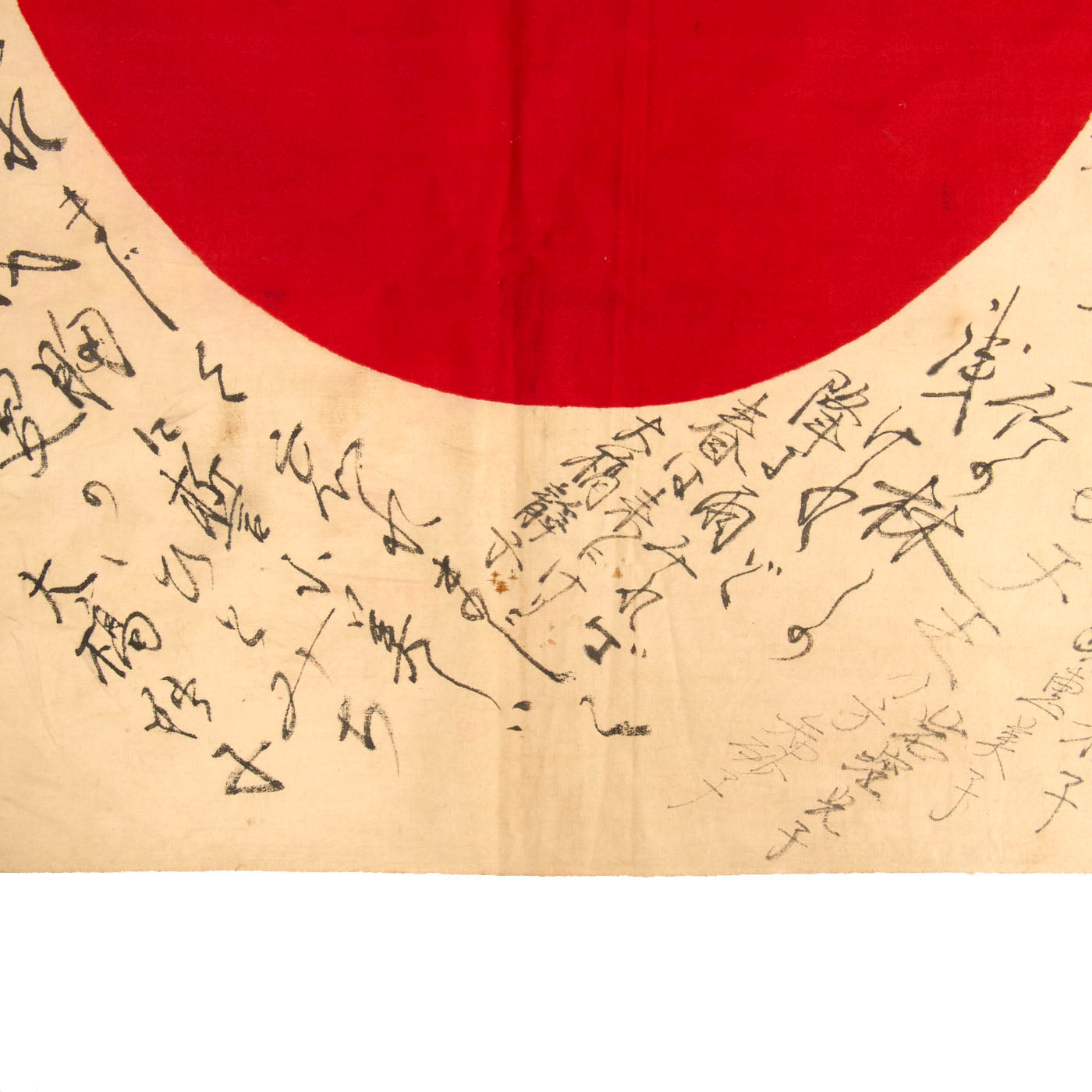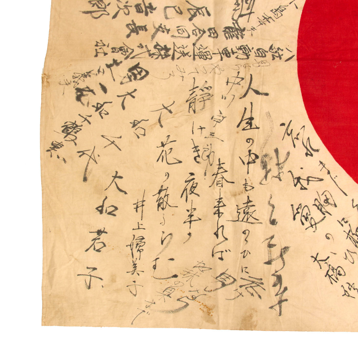 It is also signed with the names of many friends and family. The flag measures approximately 45” x 32”, and is made of what appears to be cotton/canvas, with the red "sun" dyed into the middle. Overall the flag is in good condition with some tearing present and is the real deal: a genuine USGI "bring back"!
