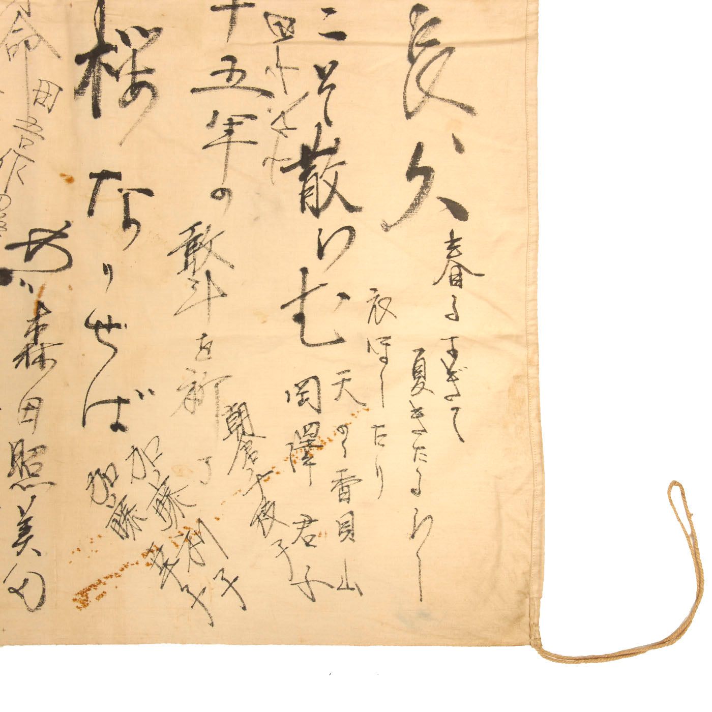Original Item: One-of-a-kind. Just purchased from a large military auction. This hand painted cloth flag is marked with battle quotes such as "Banzai", and "Good Luck for Bravery". As with many good luck flags, the flag is marked on the right side with the Japanese phrase 久 長 運 武 祈, which reads Bu un Chou kyu Inoru ("A prayer that your military fortunes be long lasting.") though it is difficult to read/translate due to most of it being in “grass writing”. Sosho, or 'grass style', is a cursive style of Japanese calligraphy that is thought to reflect wind blowing over grass. Sosho is the most abstract of the three approaches and is, therefore, the most difficult to read and understand.