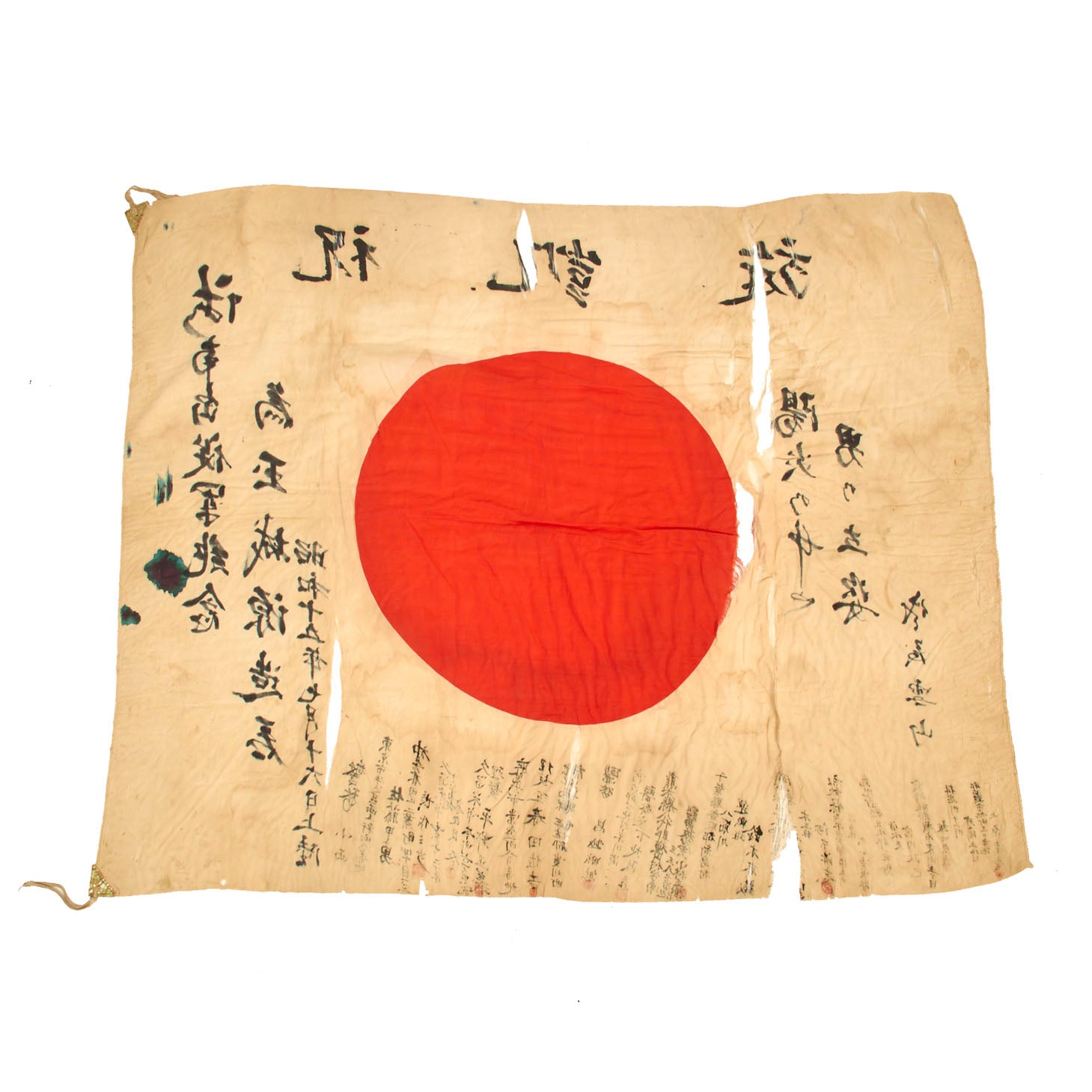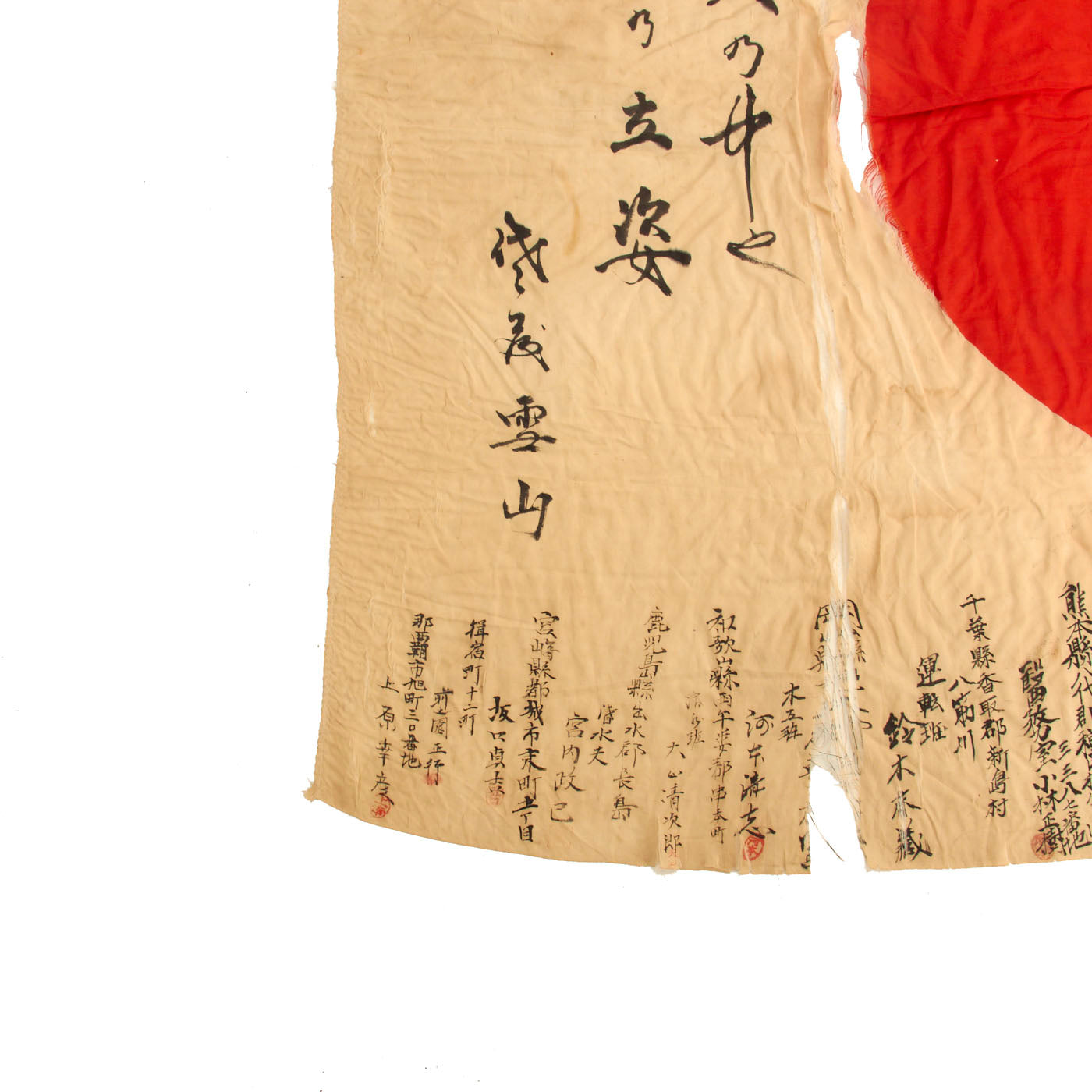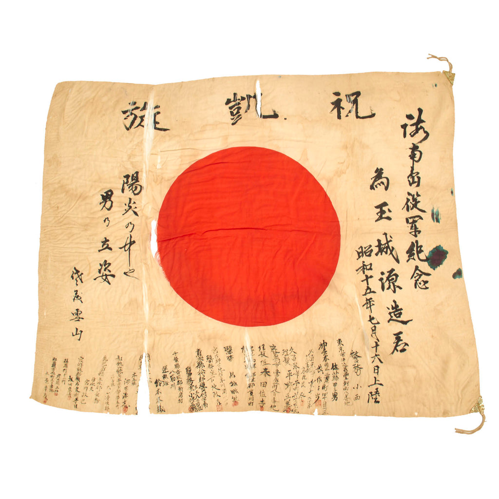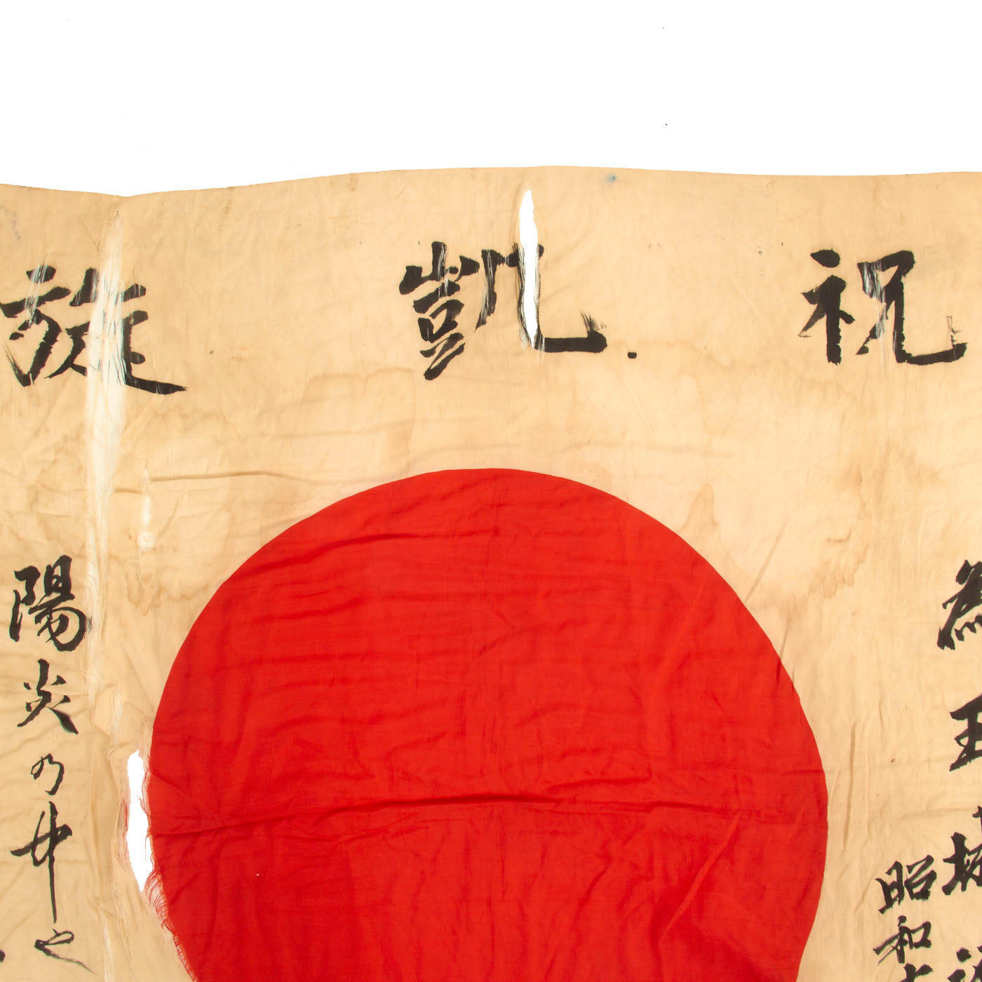 It is also signed with the names of many friends and family. The flag measures approximately 29” x 36” and is made of what appears to be early rayon silk or something similar, with the red "sun" dyed into the middle. Overall the flag is in a well worn condition with a lot of tearing, holes and thread loss. This appears to be a flag that was flown for many years.