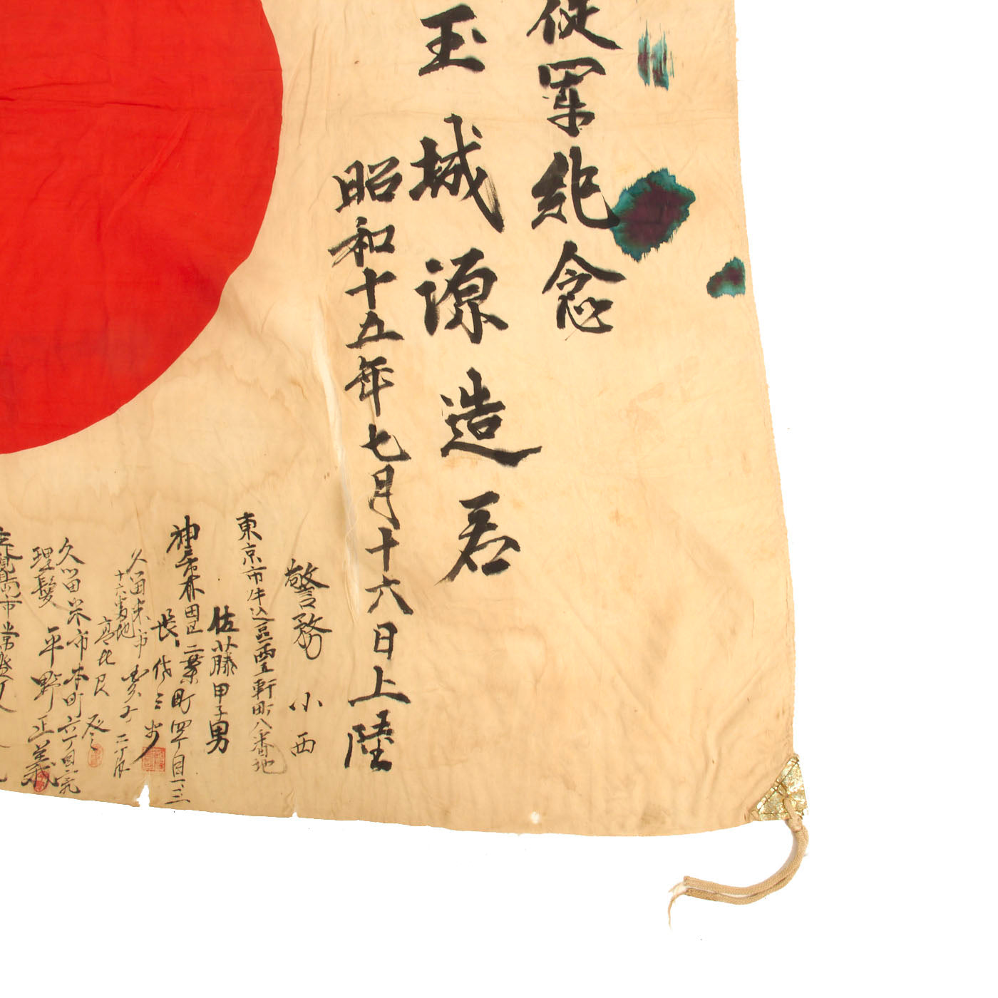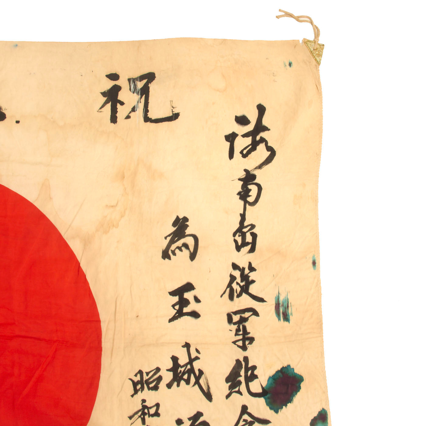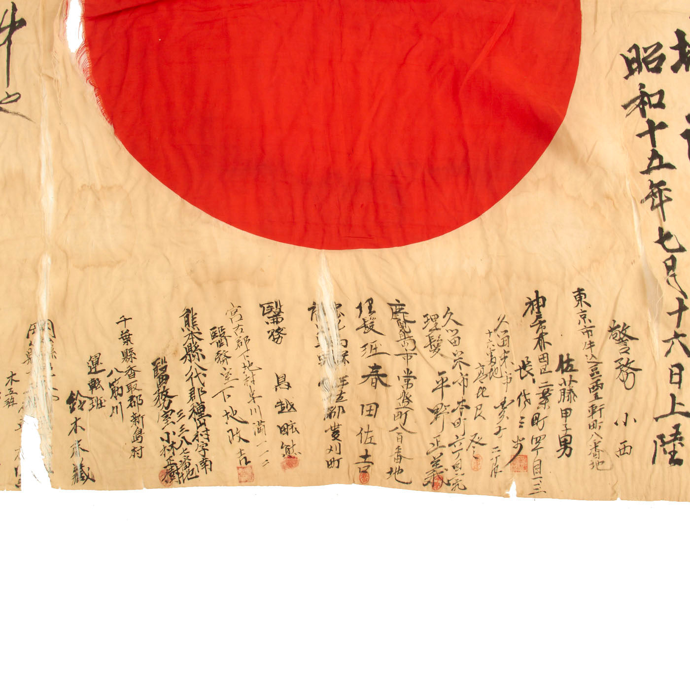 It is also signed with the names of many friends and family. The flag measures approximately 29” x 36” and is made of what appears to be early rayon silk or something similar, with the red "sun" dyed into the middle. Overall the flag is in a well worn condition with a lot of tearing, holes and thread loss. This appears to be a flag that was flown for many years.