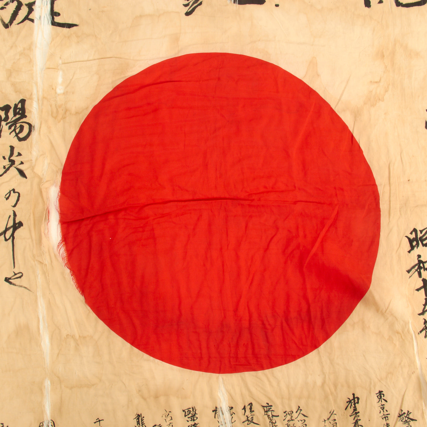 The Japanese call their country's flag hinomaru, which translates literally to "sun-round", referencing the red circle on a white field. When the hinomaru was signed, the Japanese characters were usually written vertically, and radiated outward from the edge of the red circle. This practice is referenced in the second term, yosegaki, meaning "sideways-writing". The phrase hinomaru-yosegaki can be interpreted as "To write sideways around the red sun", describing the appearance of the signed flag. This particular example completely unique is written in old KANJI the writing are mainly Japanese names of this soldier's family and friends with quotes and phrases.