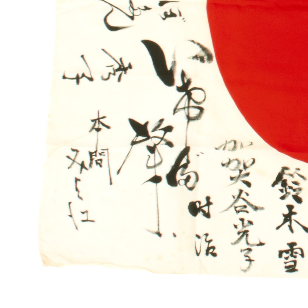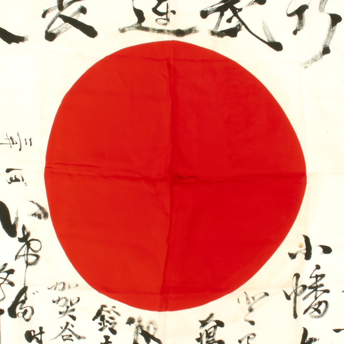 The Japanese call their country's flag hinomaru, which translates literally to "sun-round", referencing the red circle on a white field. When the hinomaru was signed, the Japanese characters were usually written vertically, and radiated outward from the edge of the red circle. This practice is referenced in the second term, yosegaki, meaning "sideways-writing". The phrase hinomaru-yosegaki can be interpreted as "To write sideways around the red sun", describing the appearance of the signed flag. This particular example completely unique is written in old KANJI the writing are mainly Japanese names of this soldier's family and friends with quotes and phrases.