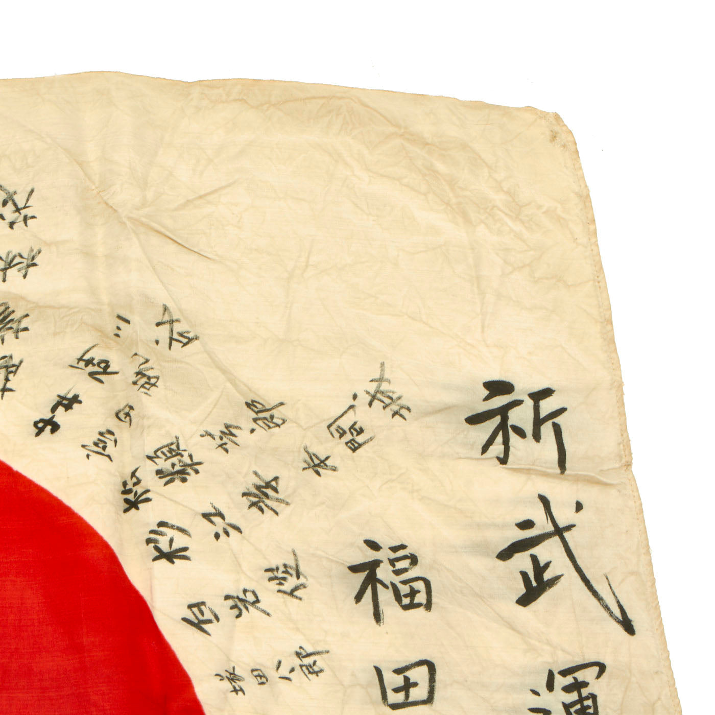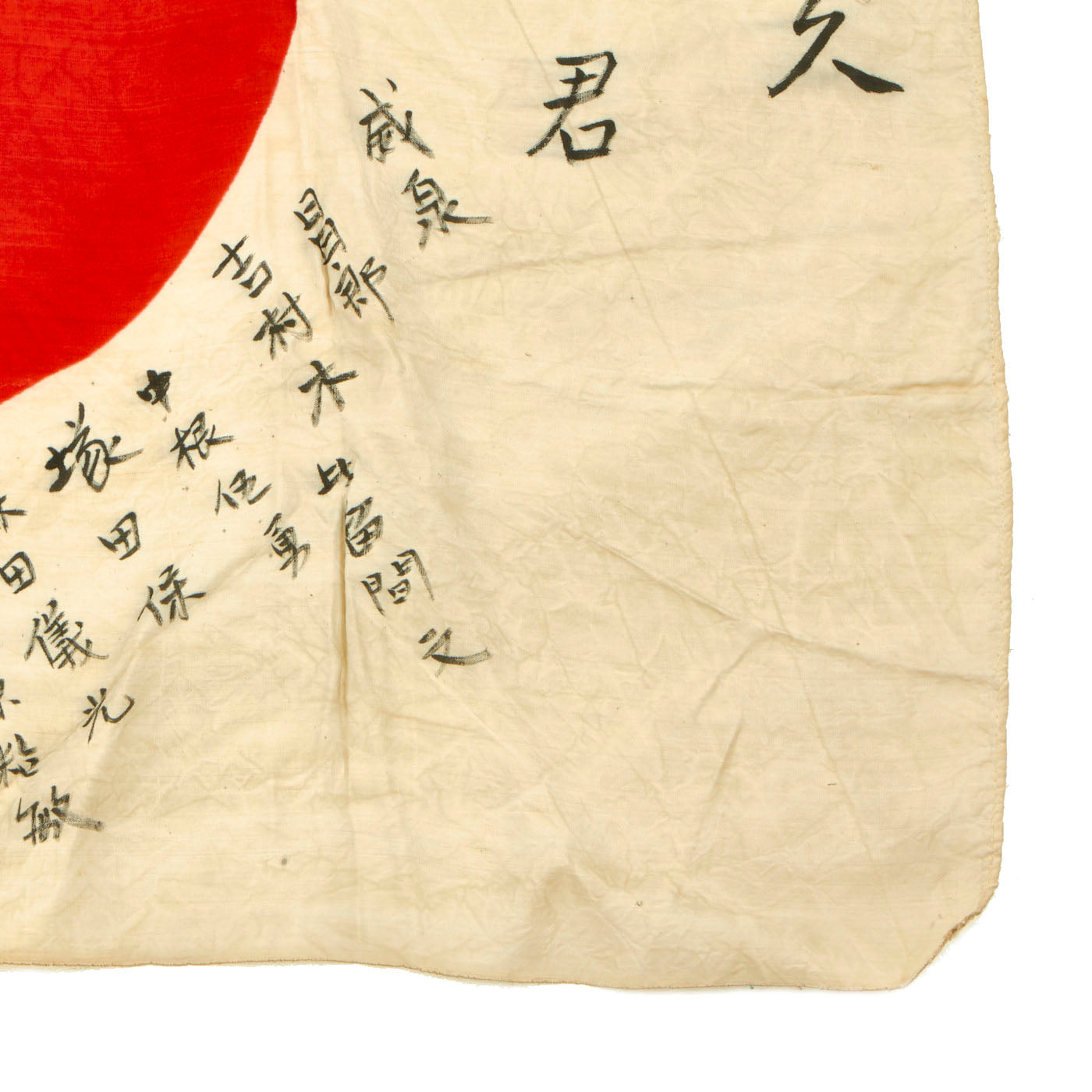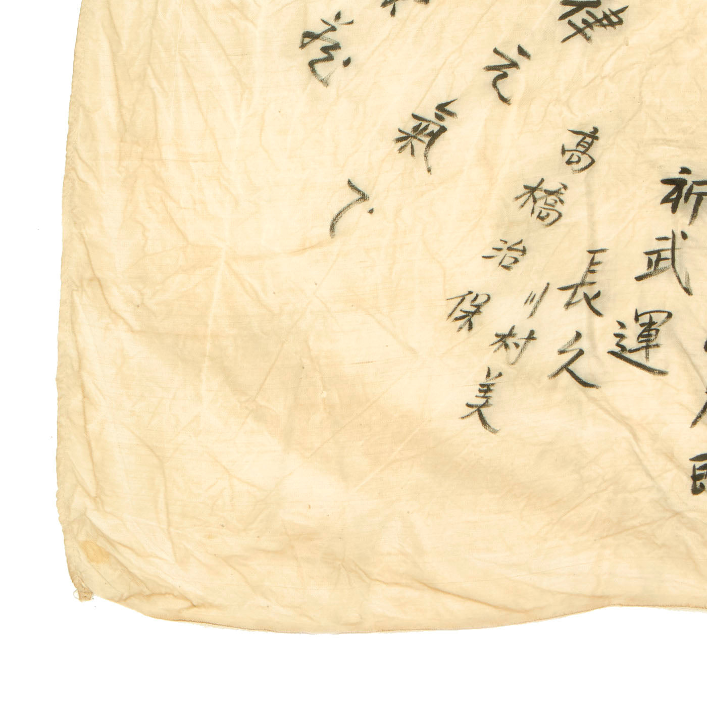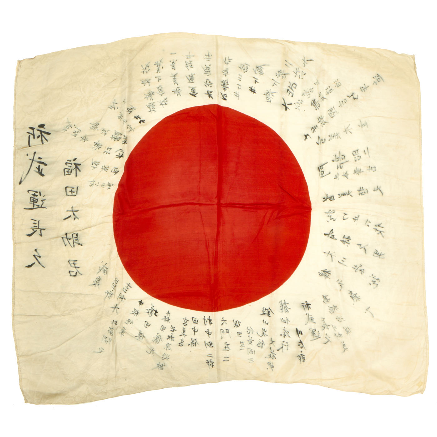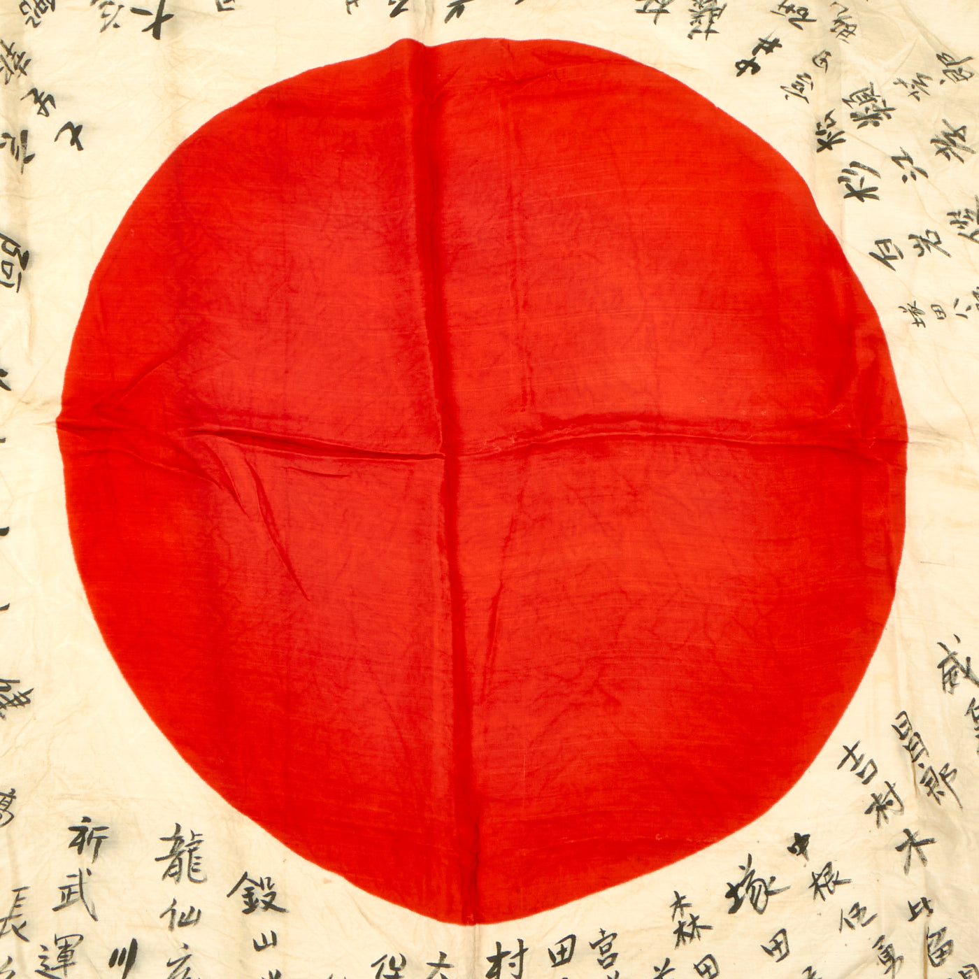 The Japanese call their country's flag hinomaru, which translates literally to "sun-round", referencing the red circle on a white field. When the hinomaru was signed, the Japanese characters were usually written vertically, and radiated outward from the edge of the red circle. This practice is referenced in the second term, yosegaki, meaning "sideways-writing". The phrase hinomaru-yosegaki can be interpreted as "To write sideways around the red sun", describing the appearance of the signed flag. This particular example completely unique is written in old KANJI the writing are mainly Japanese names of this soldier's family and friends with quotes and phrases.