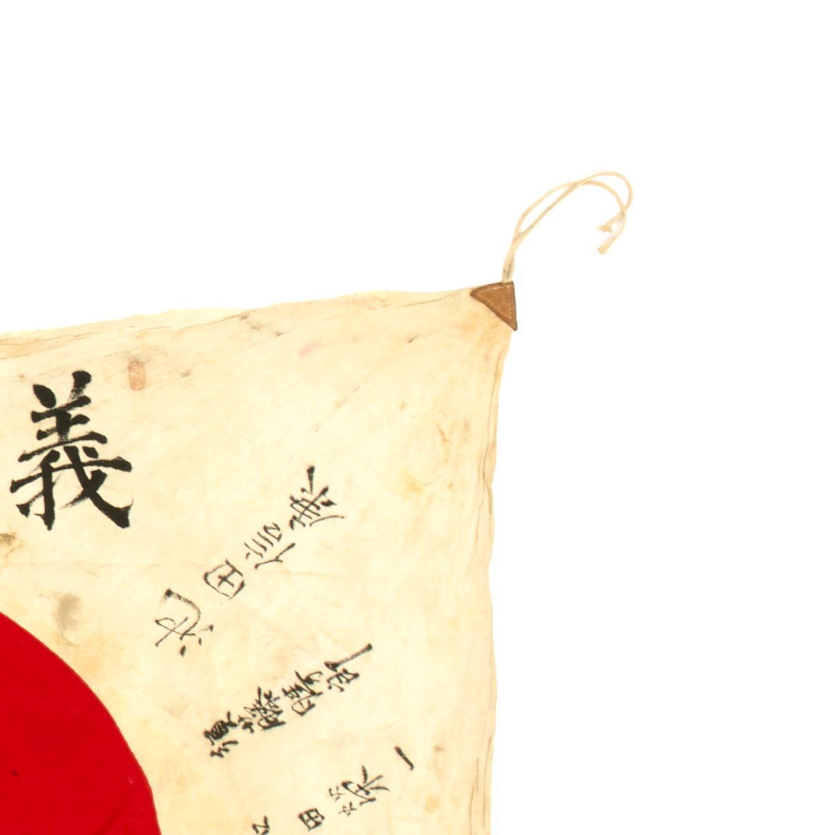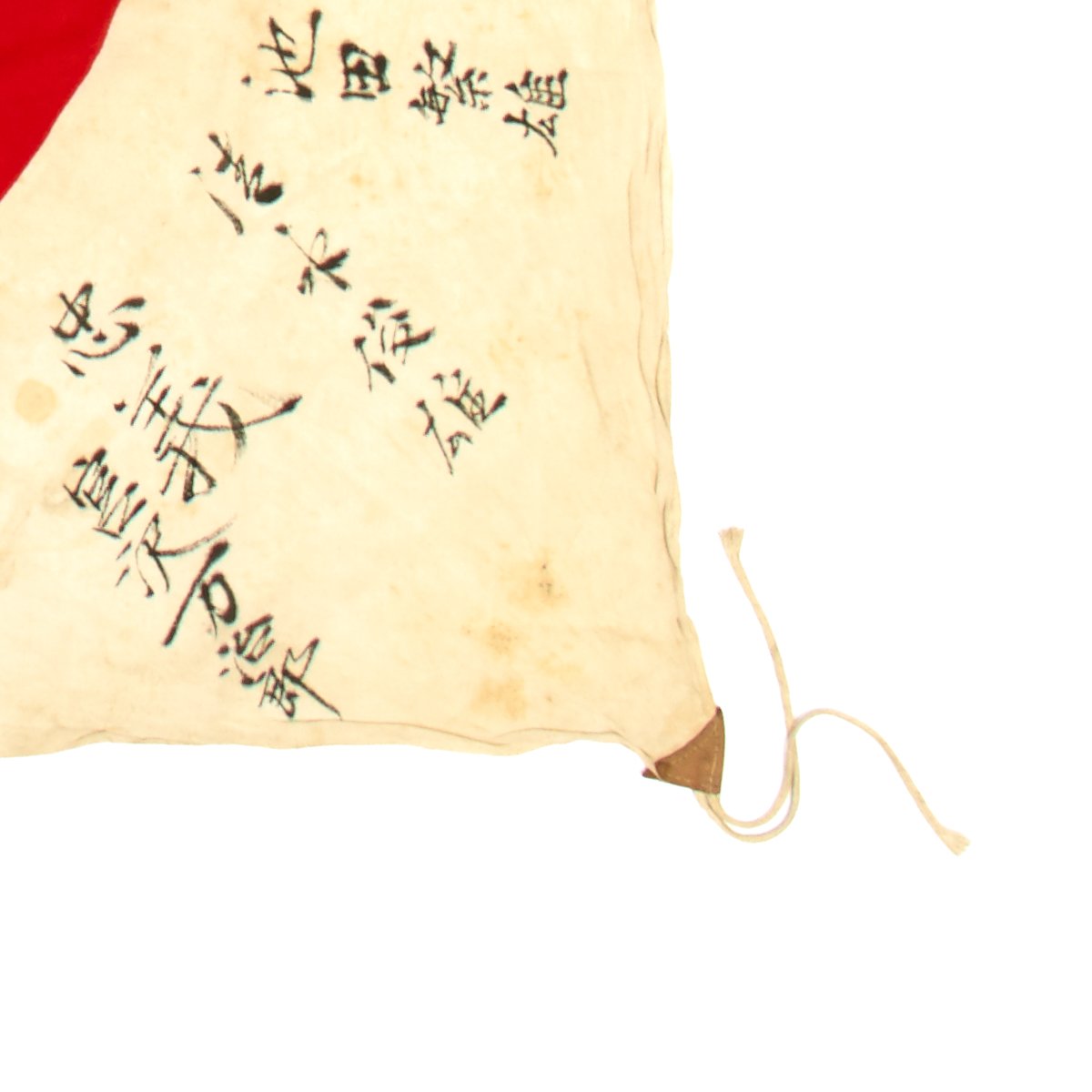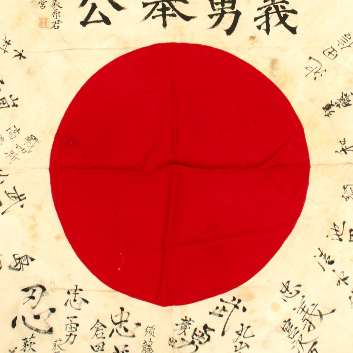 The Japanese call their country's flag hinomaru, which translates literally to "sun-round", referencing the red circle on a white field. When the hinomaru was signed, the Japanese characters were usually written vertically, and radiated outward from the edge of the red circle. This practice is referenced in the second term, yosegaki, meaning "sideways-writing". The phrase hinomaru-yosegaki can be interpreted as "To write sideways around the red sun", describing the appearance of the signed flag. This particular example completely unique is written in old KANJI the writing are mainly Japanese names of this soldier’s family and friends with quotes and phrases.