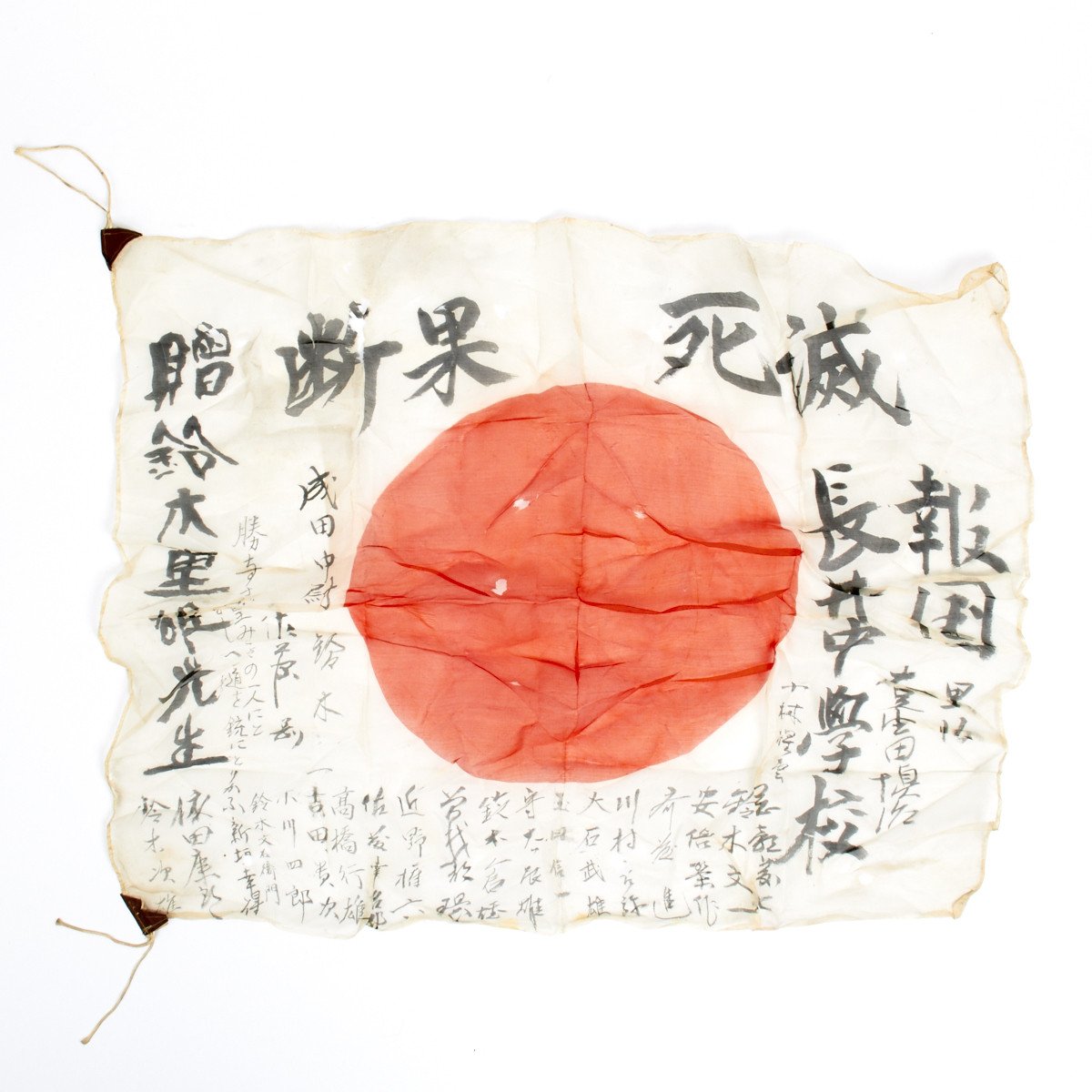 The Japanese call their country's flag hinomaru, which translates literally to "sun-round", referencing the red circle on a white field. When the hinomaru was signed, the Japanese characters were usually written vertically, and radiated outward from the edge of the red circle. This practice is referenced in the second term, yosegaki, meaning "sideways-writing". The phrase hinomaru-yosegaki can be interpreted as "To write sideways around the red sun", describing the appearance of the signed flag. This particular example, written in old KANJI the writing are mainly Japanese names of this soldier’s family and friends Japanese his name is " Named to a "Mr Suzuki the phrases translate to Devastate, kill, eliminate the enemy". "Serve your country", plus a Japanese battle poem.