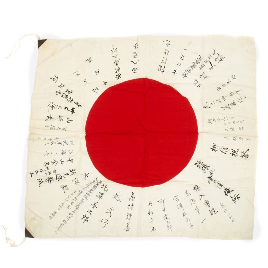 The Japanese call their country's flag hinomaru, which translates literally to "sun-round", referencing the red circle on a white field. When the hinomaru was signed, the Japanese characters were usually written vertically, and radiated outward from the edge of the red circle. This practice is referenced in the second term, yosegaki, meaning "sideways-writing". The phrase hinomaru-yosegaki can be interpreted as "To write sideways around the red sun", describing the appearance of the signed flag. This particular example completely unique is written in old KANJI the writing are mainly Japanese names of this soldier’s family and friends with quotes and phrases.