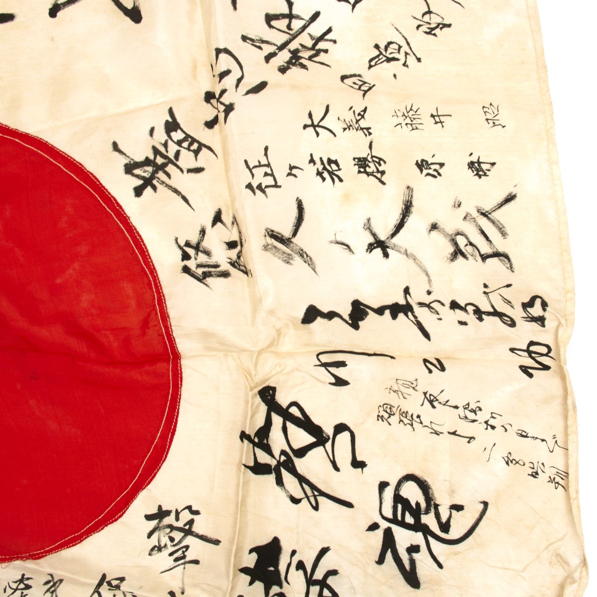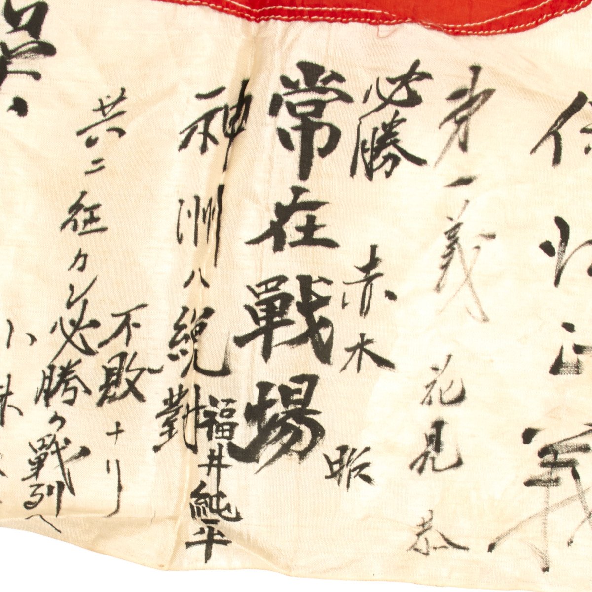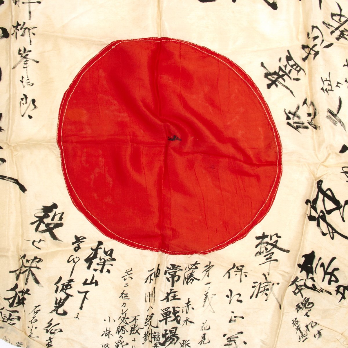 The Japanese call their country's flag hinomaru, which translates literally to "sun-round", referencing the red circle on a white field. When the hinomaru was signed, the Japanese characters were usually written vertically, and radiated outward from the edge of the red circle. This practice is referenced in the second term, yosegaki, meaning "sideways-writing". The phrase hinomaru-yosegaki can be interpreted as "To write sideways around the red sun", describing the appearance of the signed flag. This particular example, written in old KANJI the writing are mainly Japanese names of this soldier’s family and friends Japanese his name is " Named to a "Mr Suzuki the phrases translate to Devastate, kill, eliminate the enemy". "Serve your country", plus a Japanese battle poem.