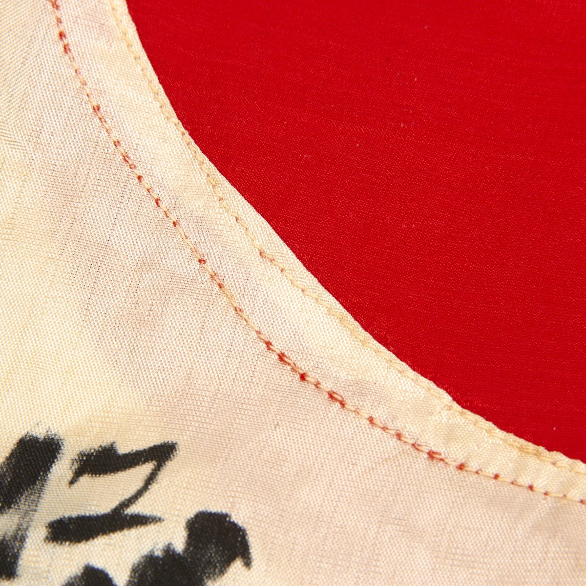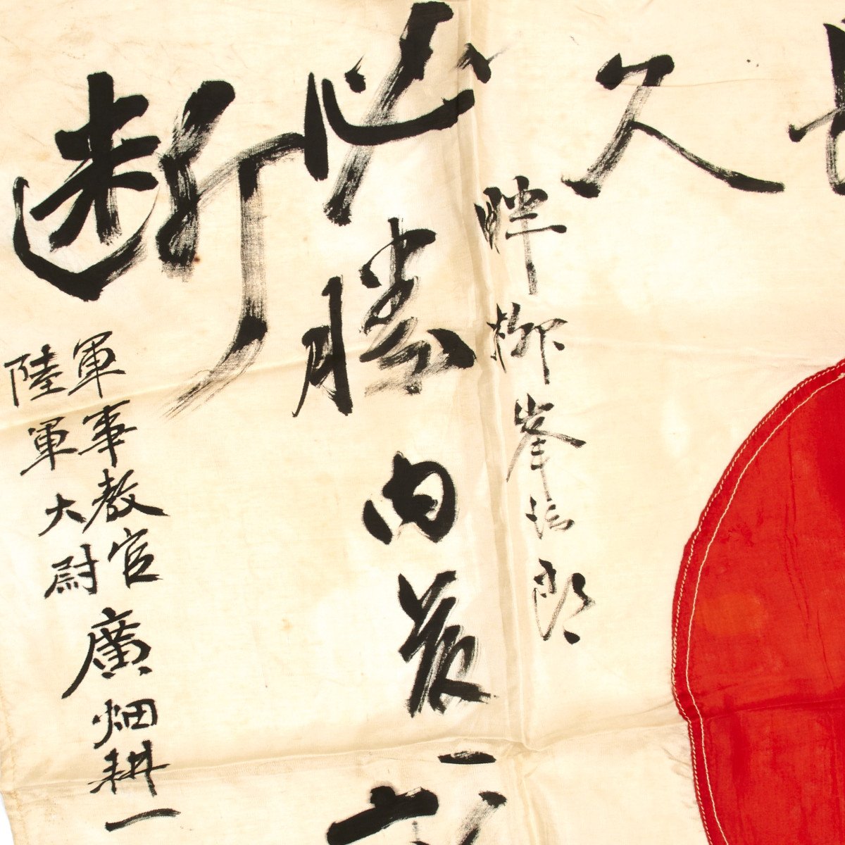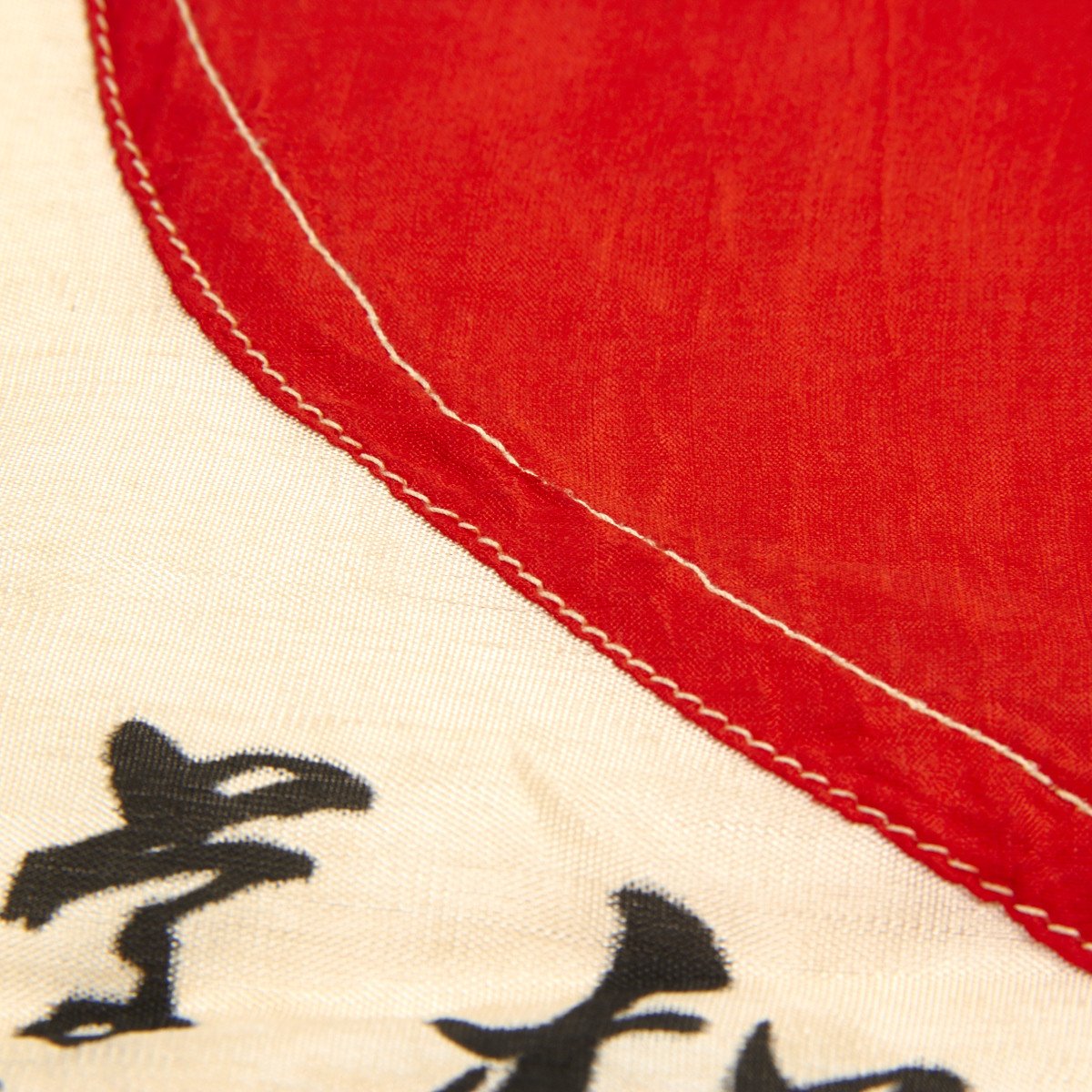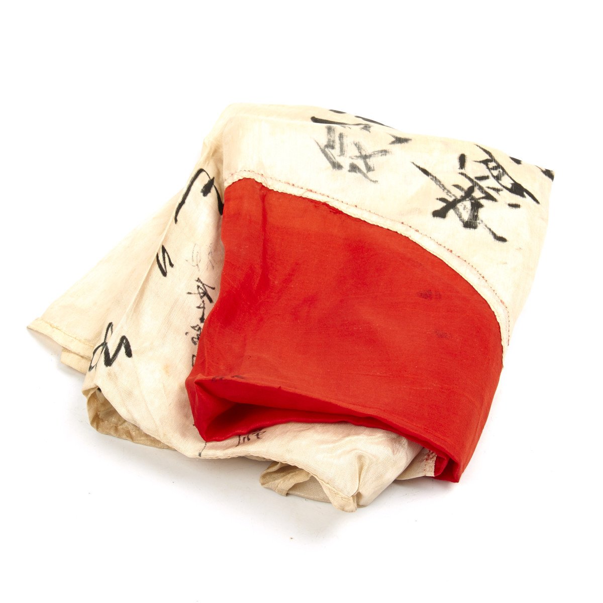 The Japanese call their country's flag hinomaru, which translates literally to "sun-round", referencing the red circle on a white field. When the hinomaru was signed, the Japanese characters were usually written vertically, and radiated outward from the edge of the red circle. This practice is referenced in the second term, yosegaki, meaning "sideways-writing". The phrase hinomaru-yosegaki can be interpreted as "To write sideways around the red sun", describing the appearance of the signed flag. This particular example, written in old KANJI the writing are mainly Japanese names of this soldier’s family and friends Japanese his name is " Named to a "Mr Suzuki the phrases translate to Devastate, kill, eliminate the enemy". "Serve your country", plus a Japanese battle poem.