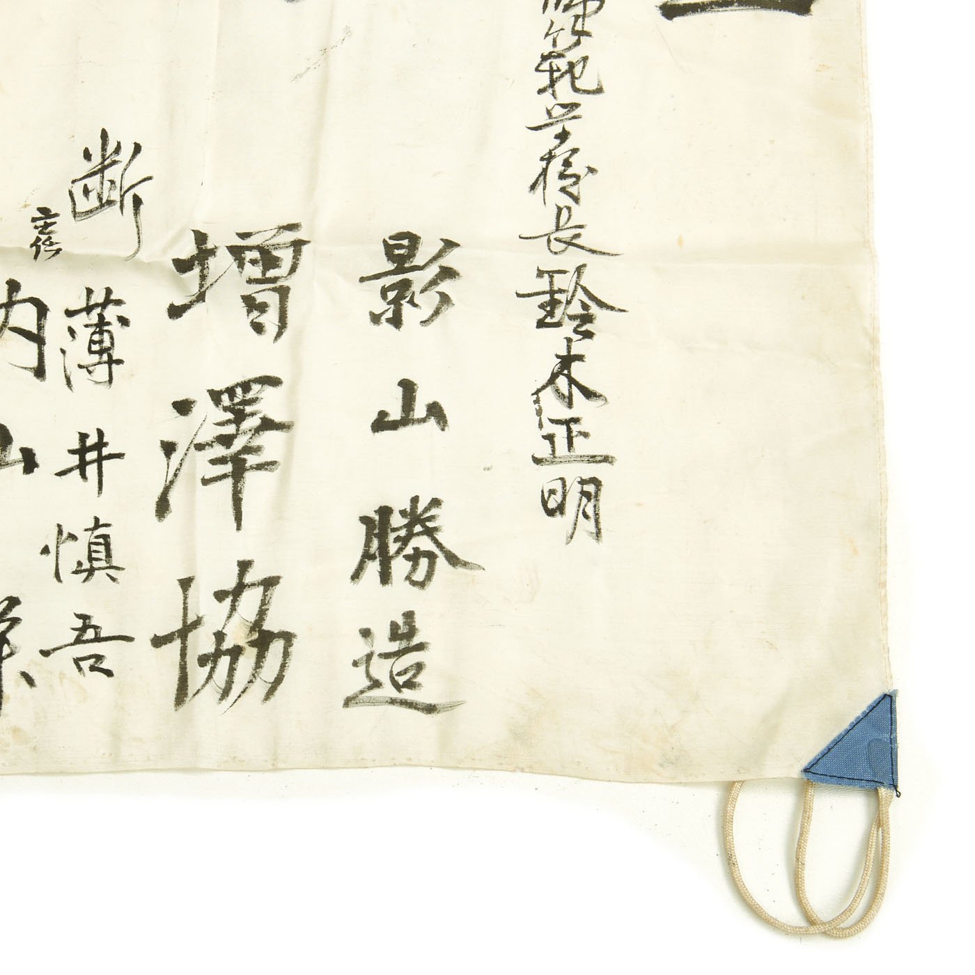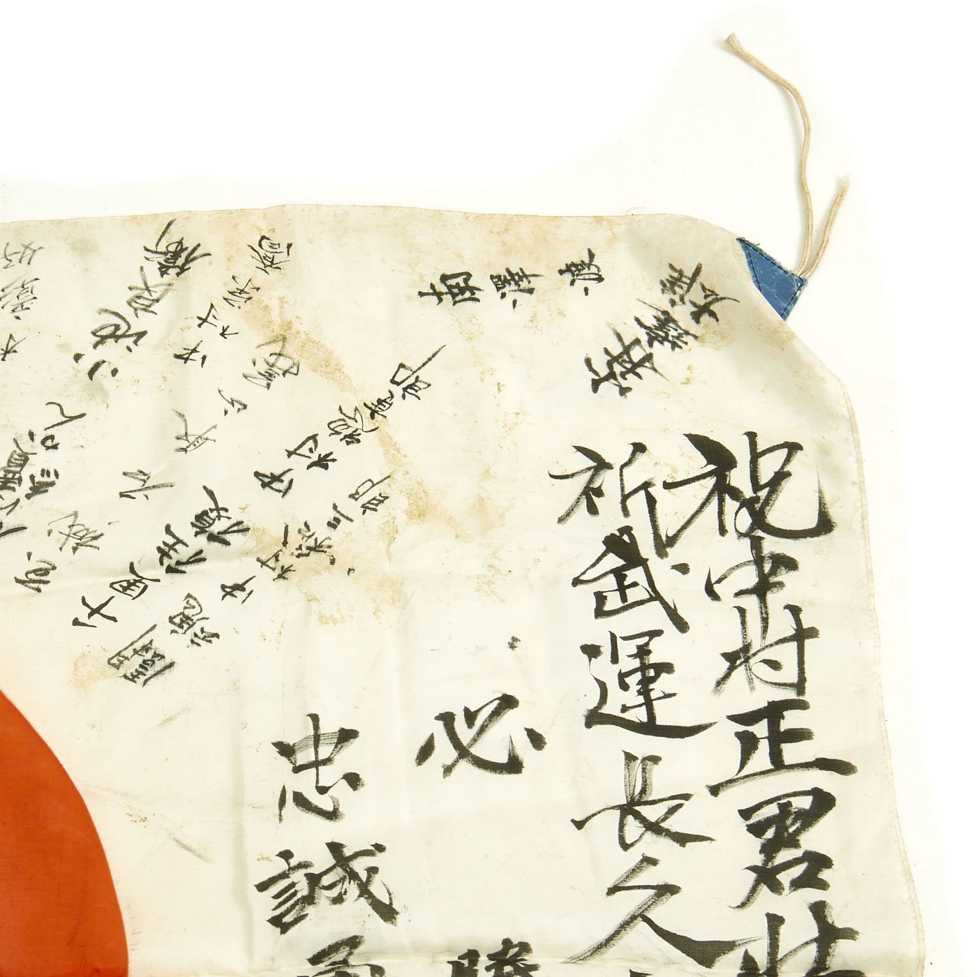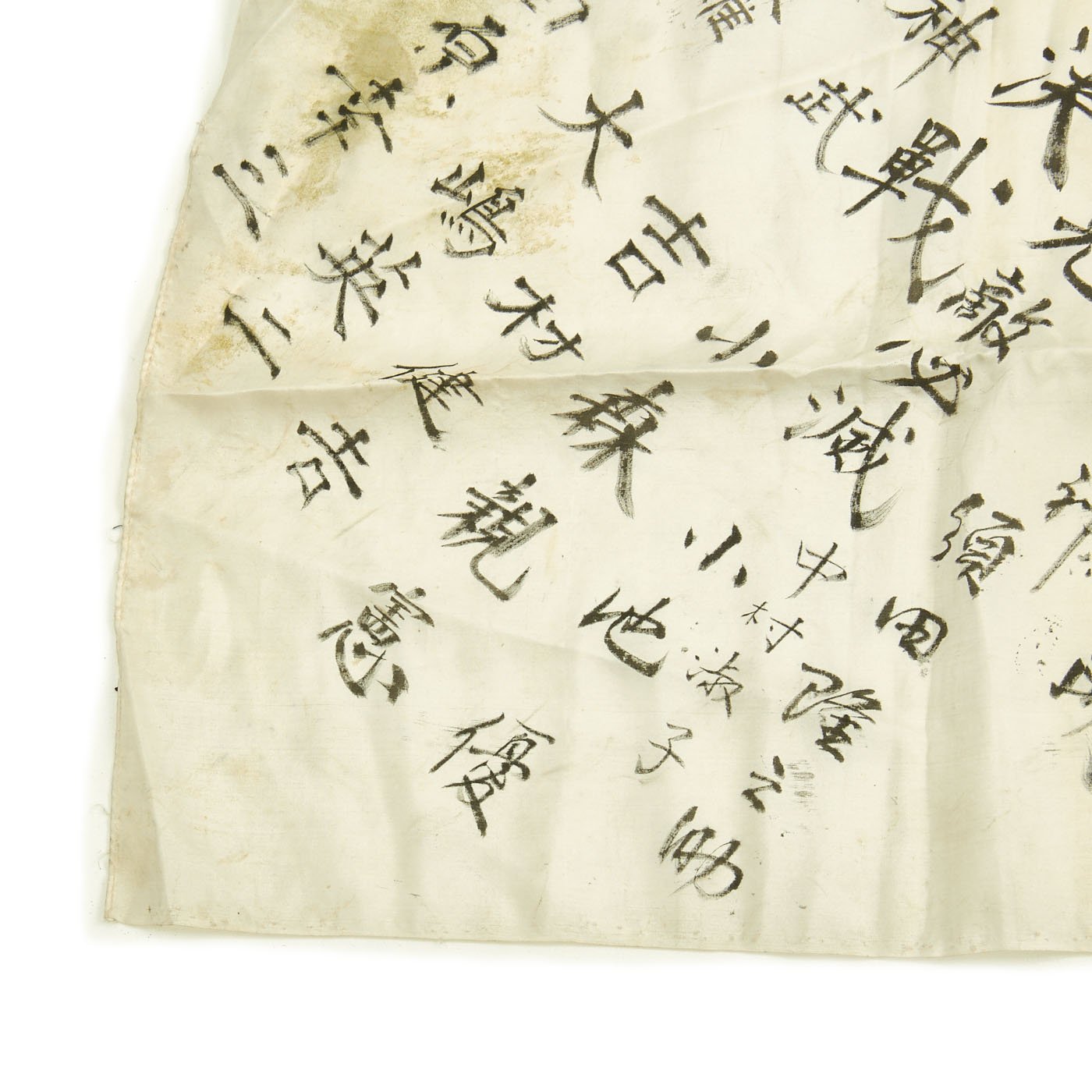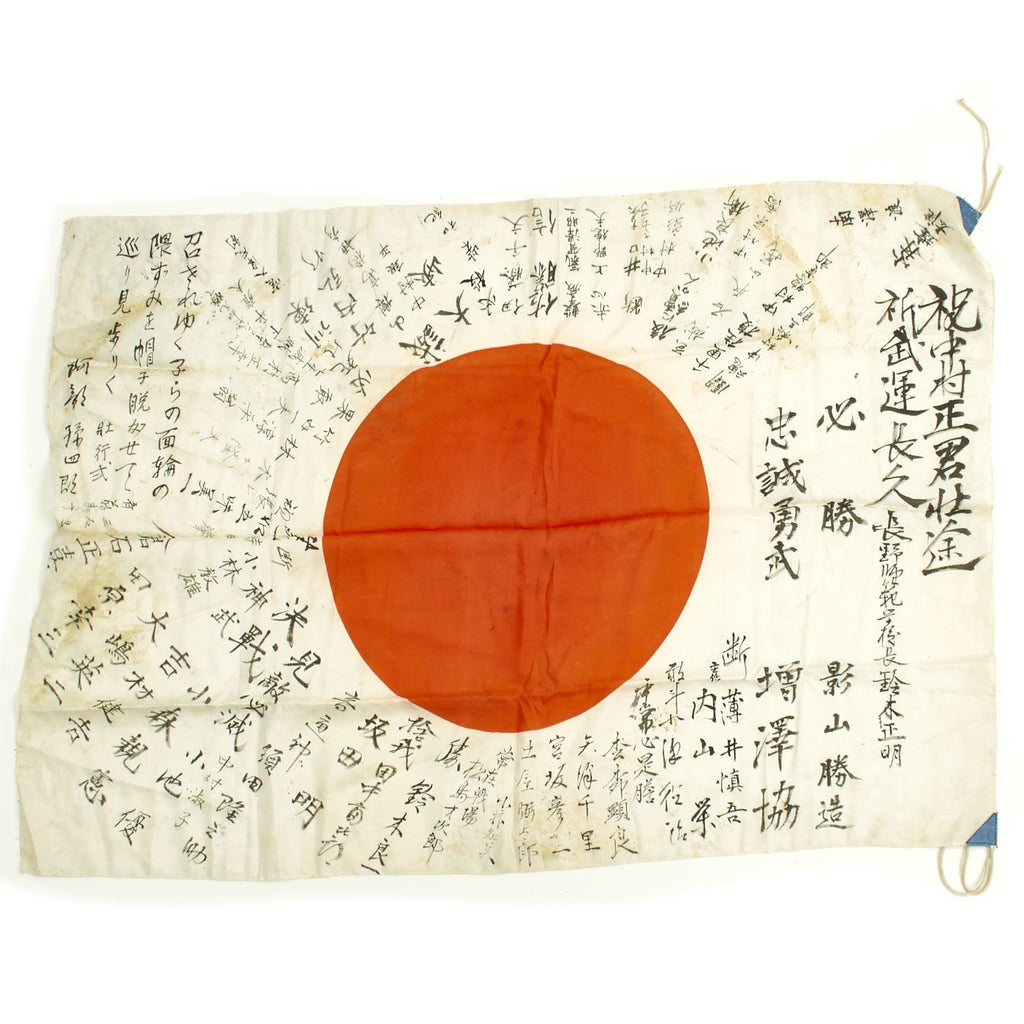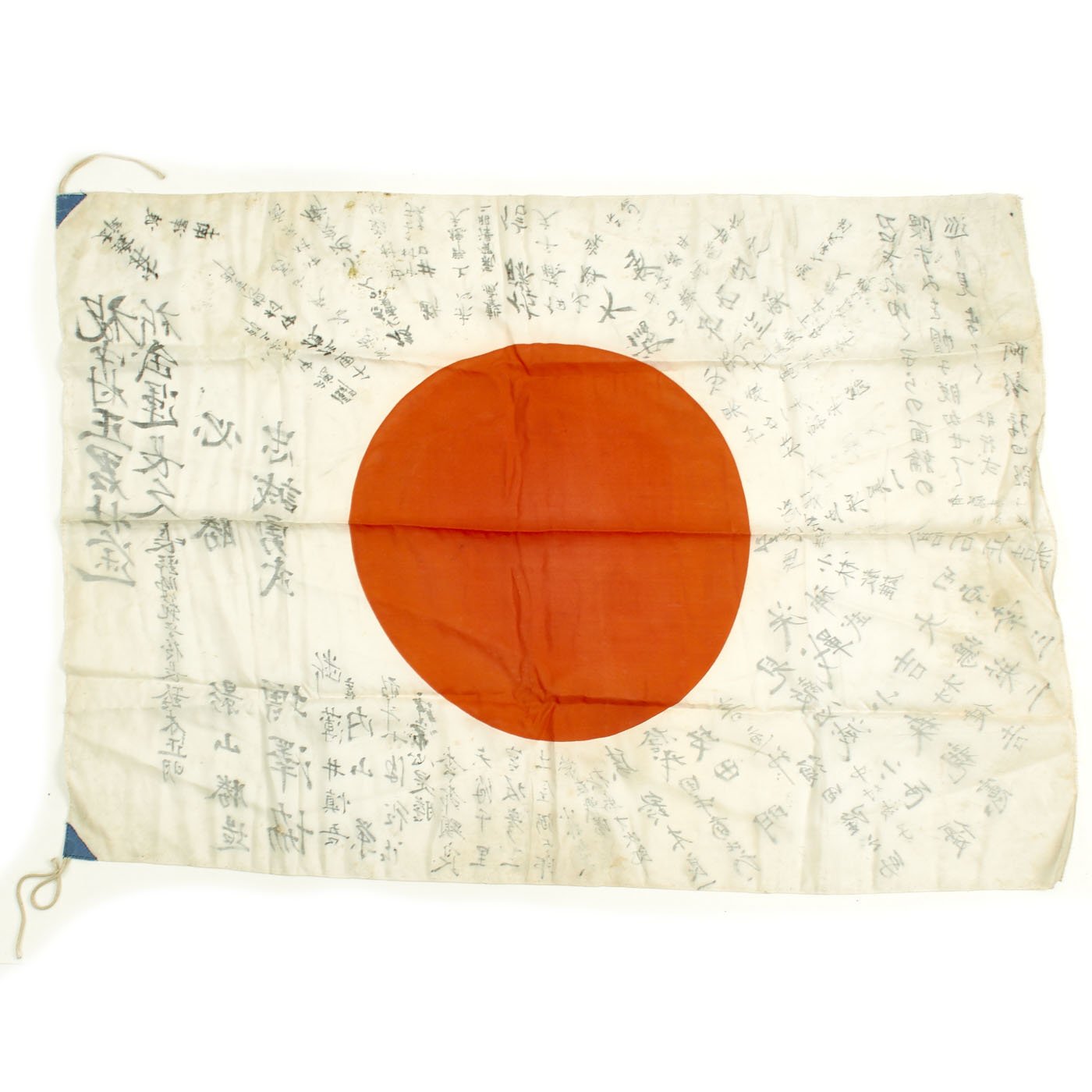 Original Item: One-of-a-kind. Just purchased from a private collector, this is a very nice Japanese WWII "Good Luck Flag". The flag came to us with a complete listed of translations, which were performed by an expert at the request of the previous owner. The flag measures approximately 29" x 42", and is made silk cloth, with the red "sun" dyed into the center. The flag really is in great shape, with little to no deterioration of the silk, nice corner reinforcements, and intact hanging ties. It does have some light staining, but virtually every flag we have seen does.