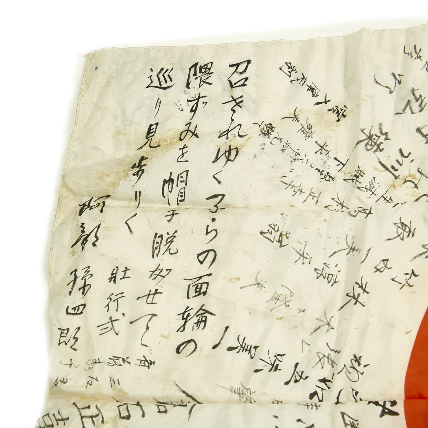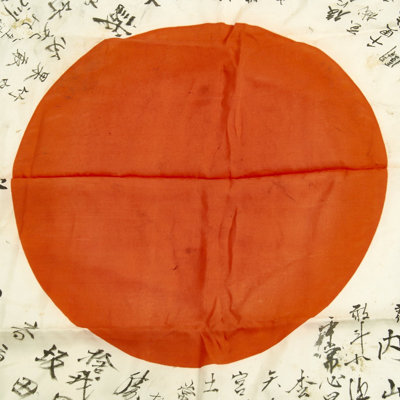 The Japanese call their country's flag hinomaru, which translates literally to "sun-round", referencing the red circle on a white field. When the hinomaru was signed, the Japanese characters were usually written vertically, and radiated outward from the edge of the red circle. This practice is referenced in the second term, yosegaki, meaning "sideways-writing". The phrase hinomaru-yosegaki can be interpreted as "To write sideways around the red sun", describing the appearance of the signed flag. This particular example completely unique is written in old KANJI the writing are mainly Japanese names of this soldier's family and friends with quotes and phrases.