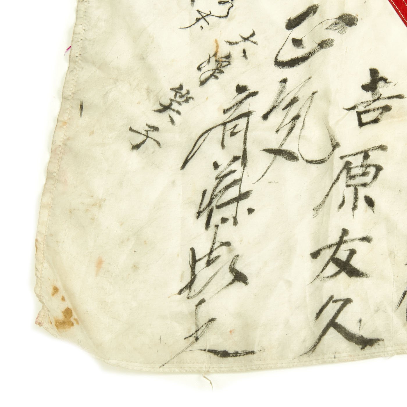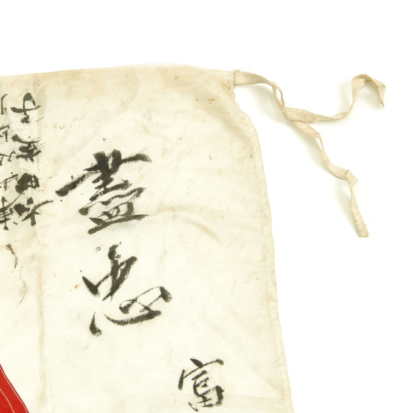 The flag measures approximately 31" x 28", and is made silk cloth, with the red "sun" a separate piece stitched into the middle. The writing is mostly clear, and would make a great research project for someone able to read WWII Era Japanese.