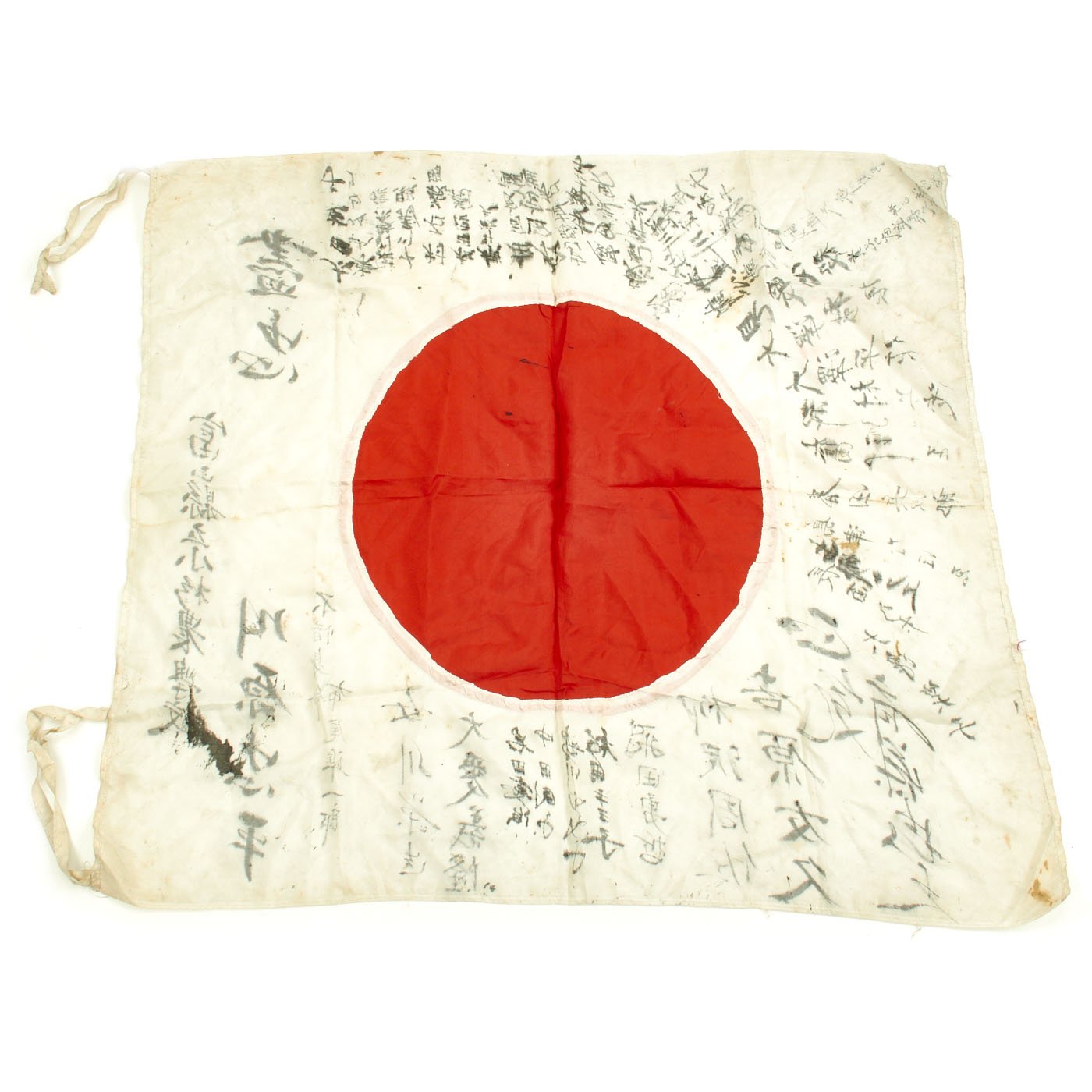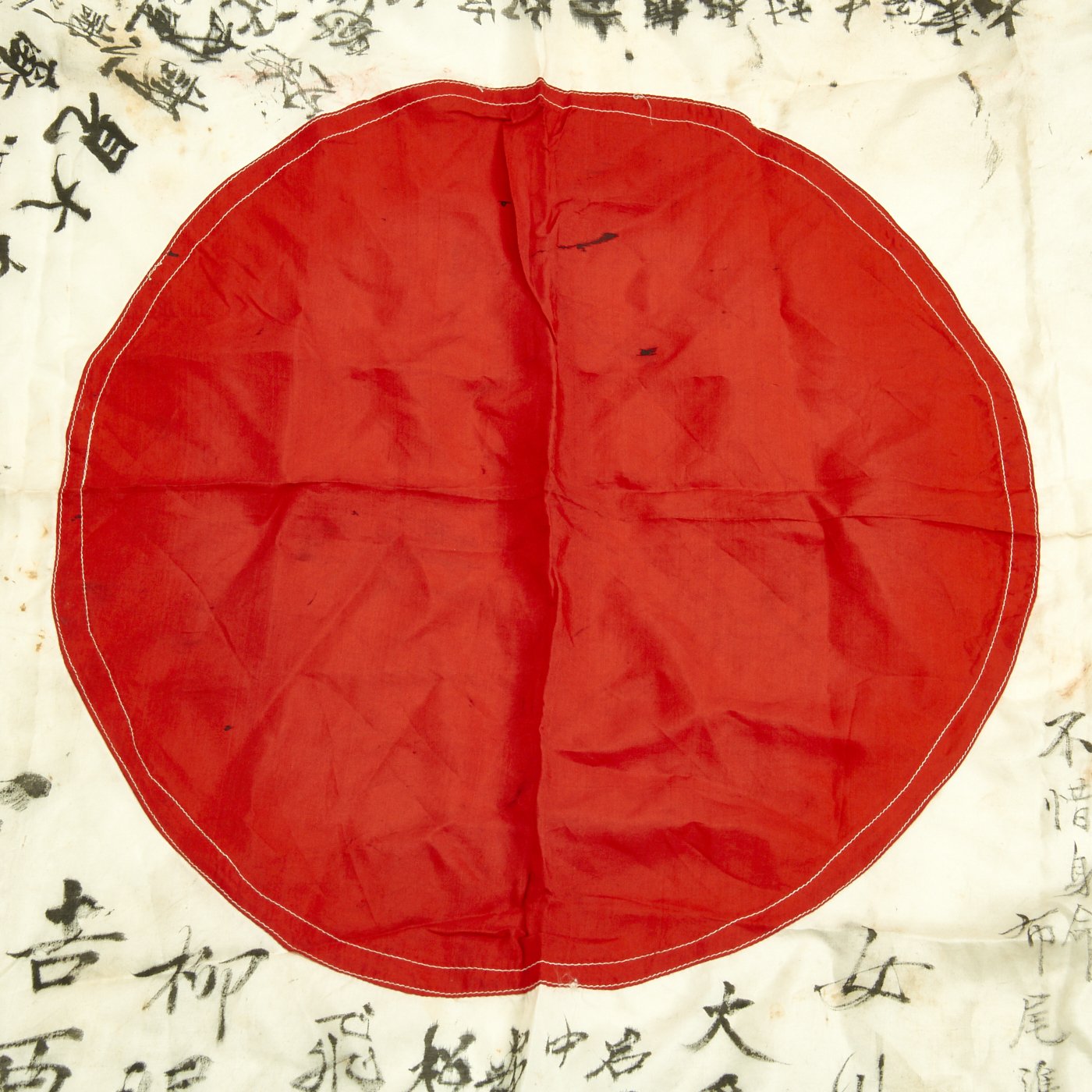 The Japanese call their country's flag hinomaru, which translates literally to "sun-round", referencing the red circle on a white field. When the hinomaru was signed, the Japanese characters were usually written vertically, and radiated outward from the edge of the red circle. This practice is referenced in the second term, yosegaki, meaning "sideways-writing". The phrase hinomaru-yosegaki can be interpreted as "To write sideways around the red sun", describing the appearance of the signed flag. This particular example completely unique is written in old KANJI the writing are mainly Japanese names of this soldier's family and friends with quotes and phrases.