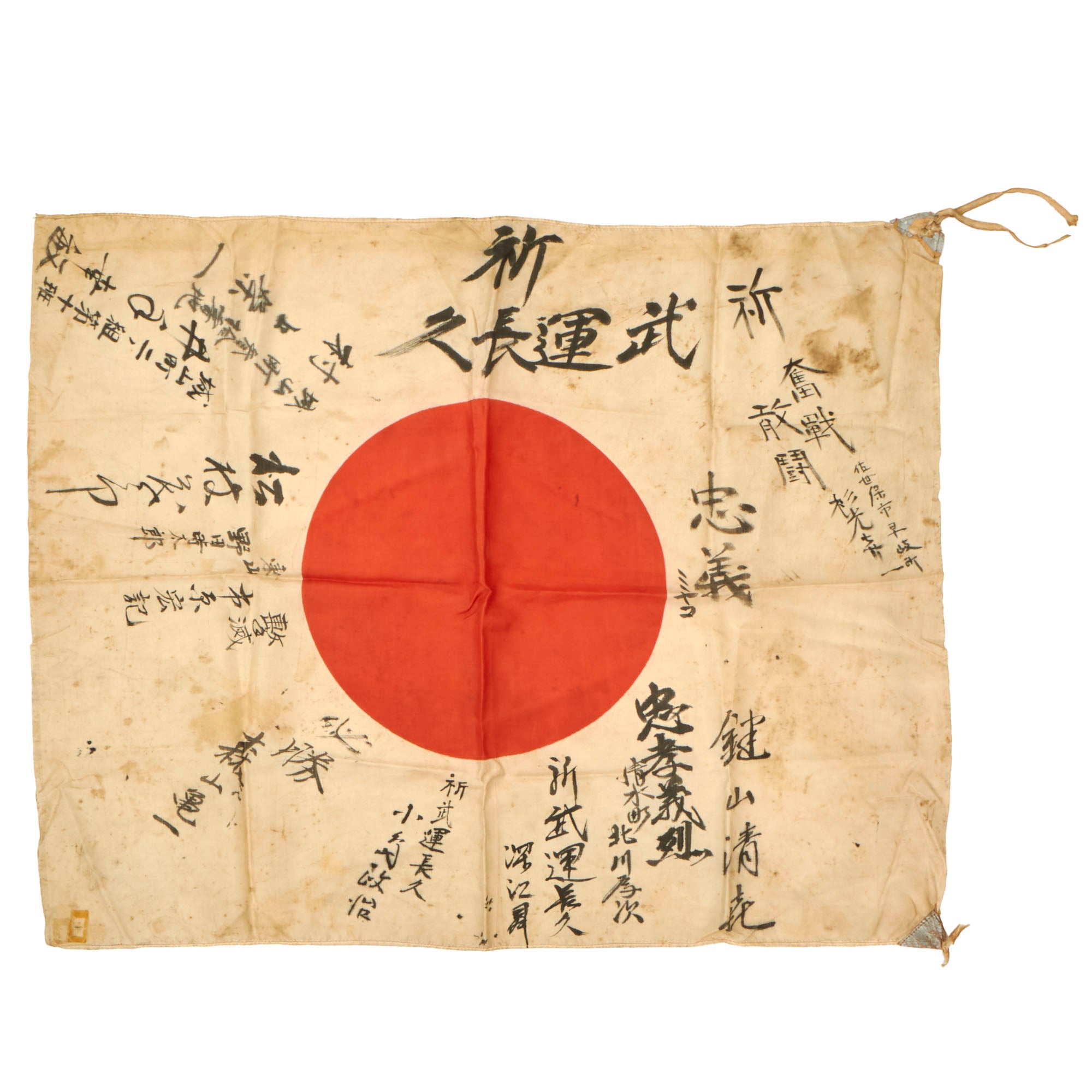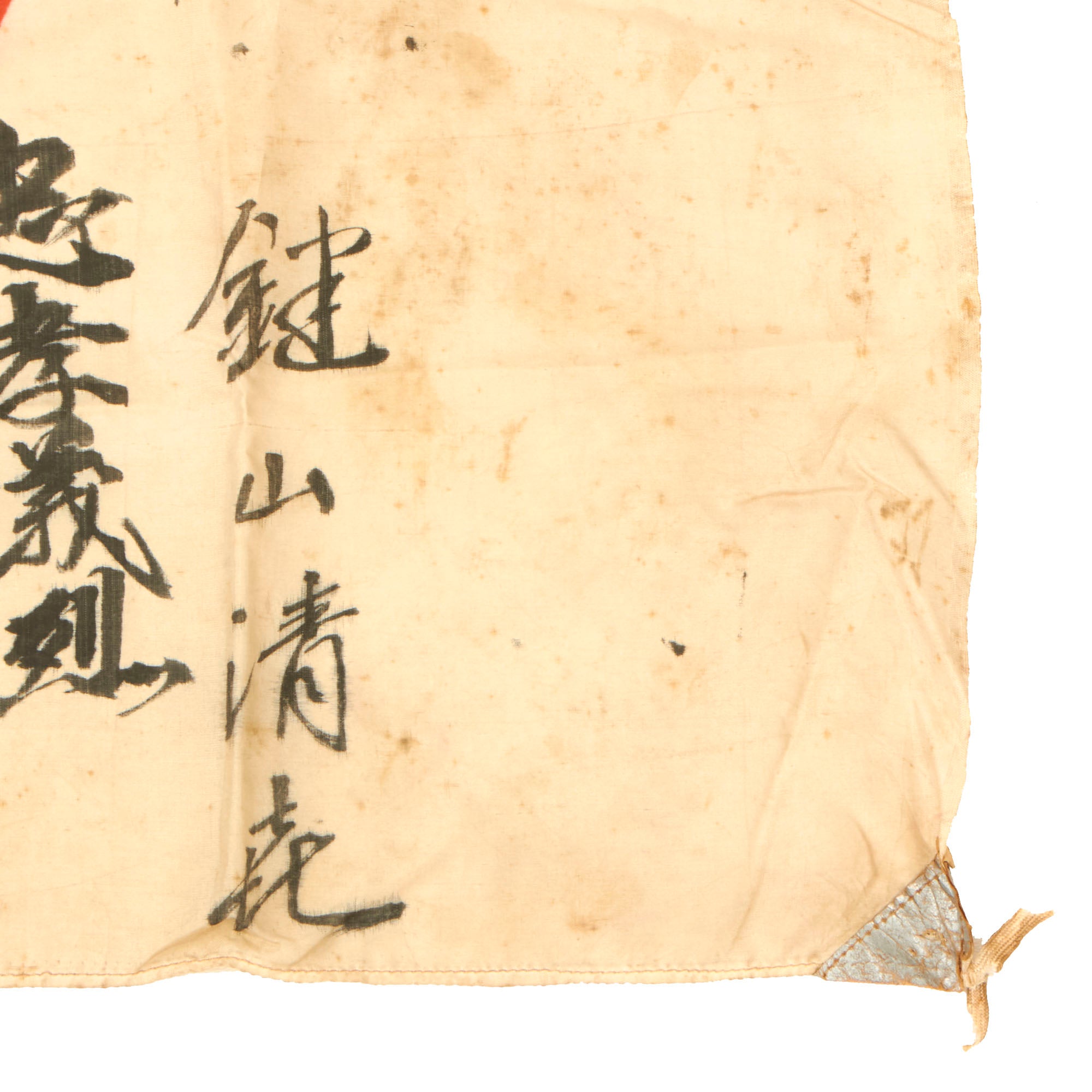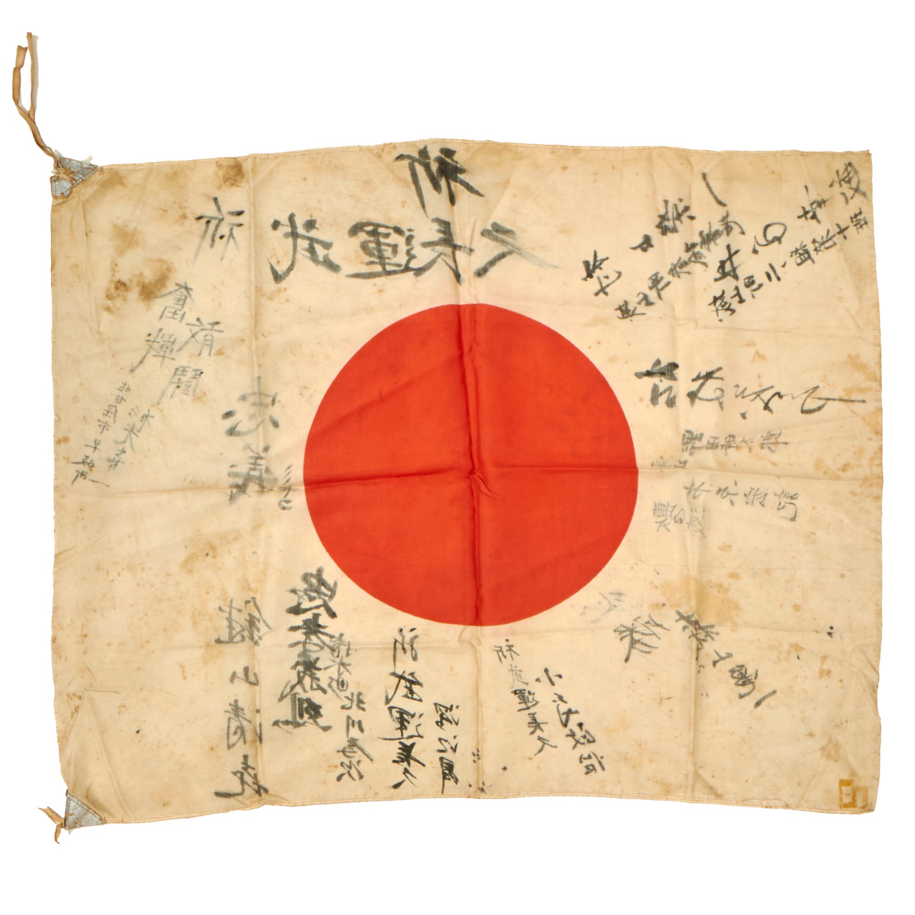 It is also signed with the names of many friends and family, radiating out from the center, and in various different styles of writing.. The flag measures approximately 23 x 27½”, and is made of what appears to be made from light silk or possibly rayon, with the red "sun" dyed into the middle. It shows staining and overall age toning, and definitely doesn’t look like a flag that spent its life in a drawer. Overall the flag is lovely and is the real deal: a genuine USGI "bring back"! The flag retains its two corner reinforcements with string attached, but they are in rough shape. This flag would look best in a frame!