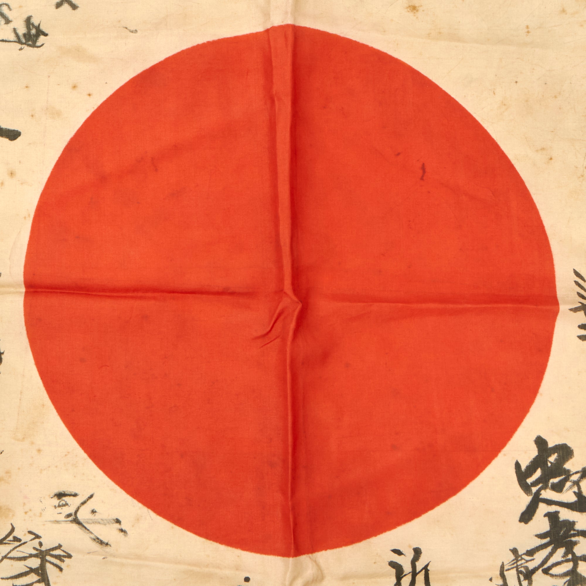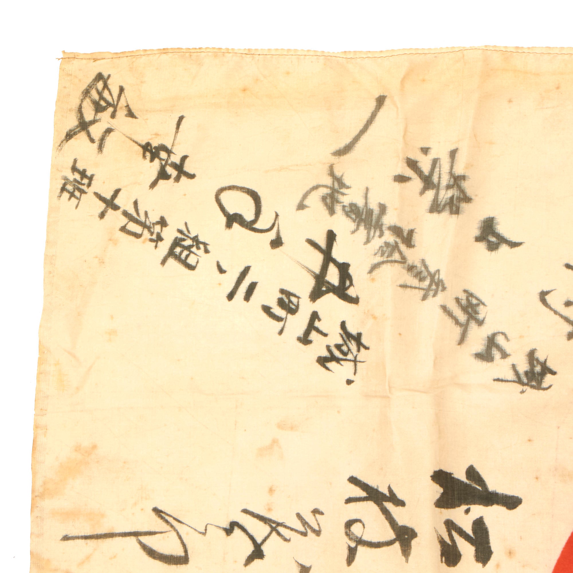 The Japanese call their country's flag hinomaru, which translates literally to "sun-round", referencing the red circle on a white field. When the hinomaru was signed, the Japanese characters were usually written vertically, and radiated outward from the edge of the red circle. This practice is referenced in the second term, yosegaki, meaning "sideways-writing". The phrase hinomaru-yosegaki can be interpreted as "To write sideways around the red sun", describing the appearance of the signed flag. This particular example completely unique is written in old KANJI the writing are mainly Japanese names of this soldier's family and friends with quotes and phrases.
