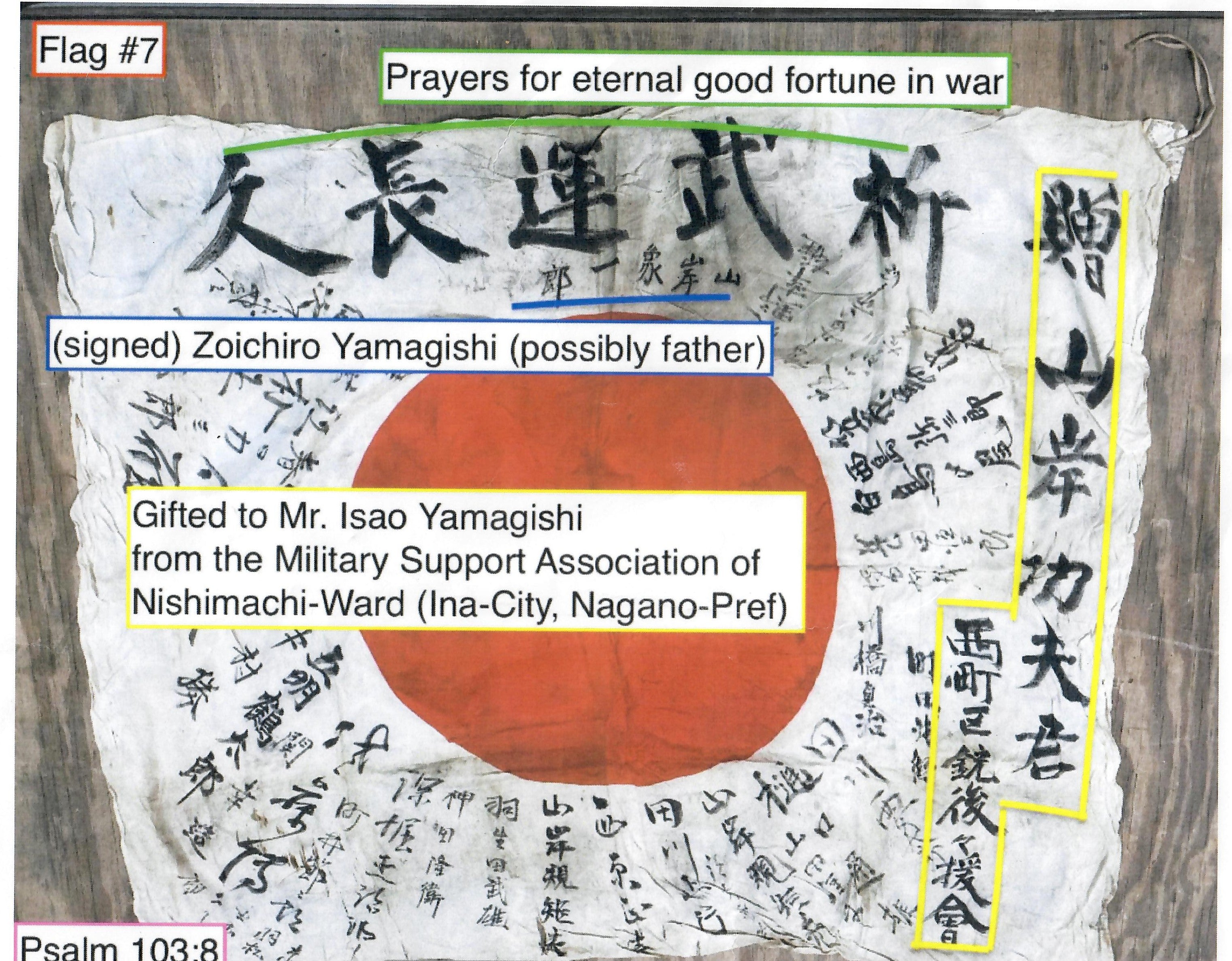 The flag comes with a page of partial translations. The name under the primary well wish reads Zoichiro Yamagishi, possibly the soldier’s father. On the right side of the flag is a long string of text reading Gifted to Mr. Isao Yamagishi from the Military Support Association of Nishimachi-Ward (Ina-City, Nagano Pref.), certainly the name of the soldier.