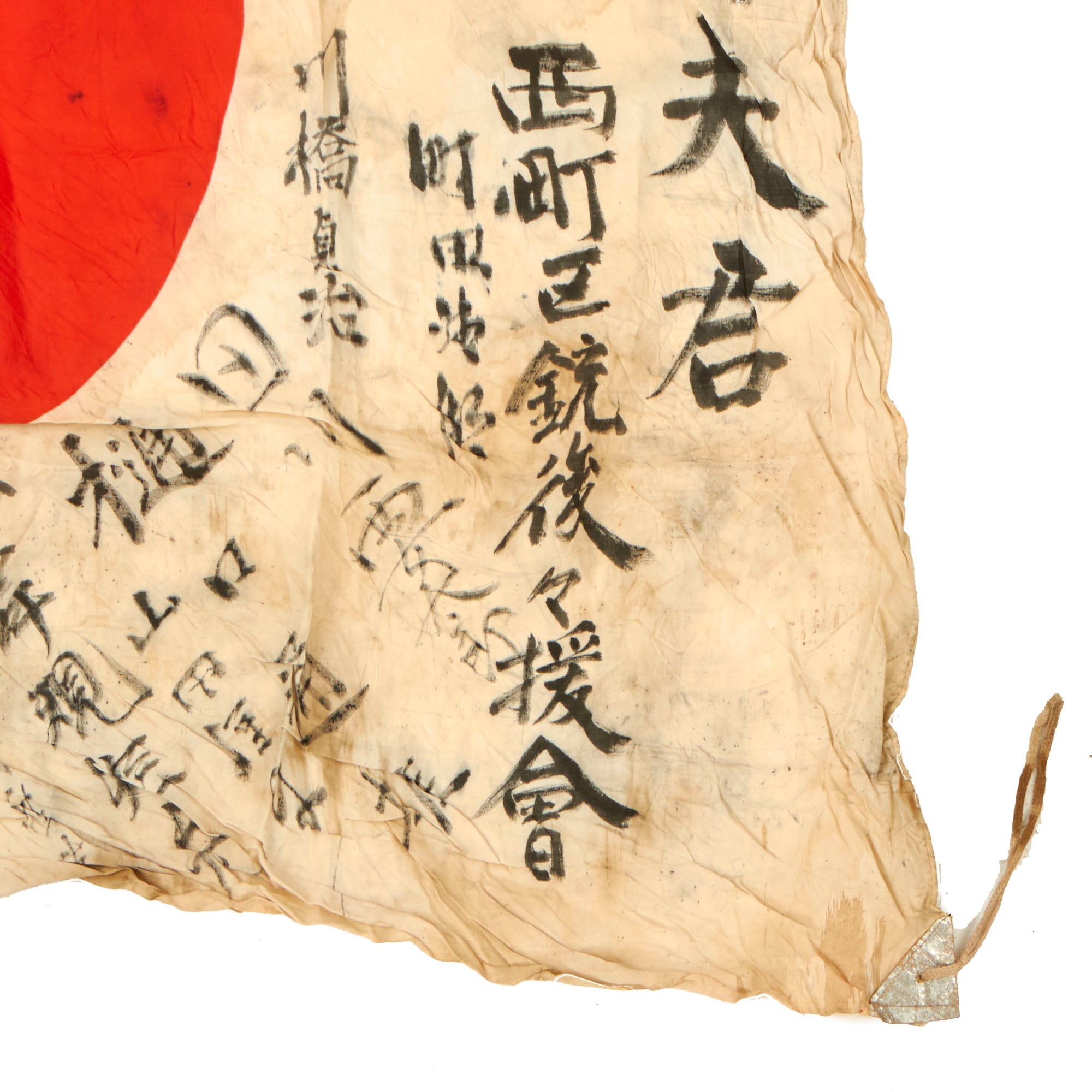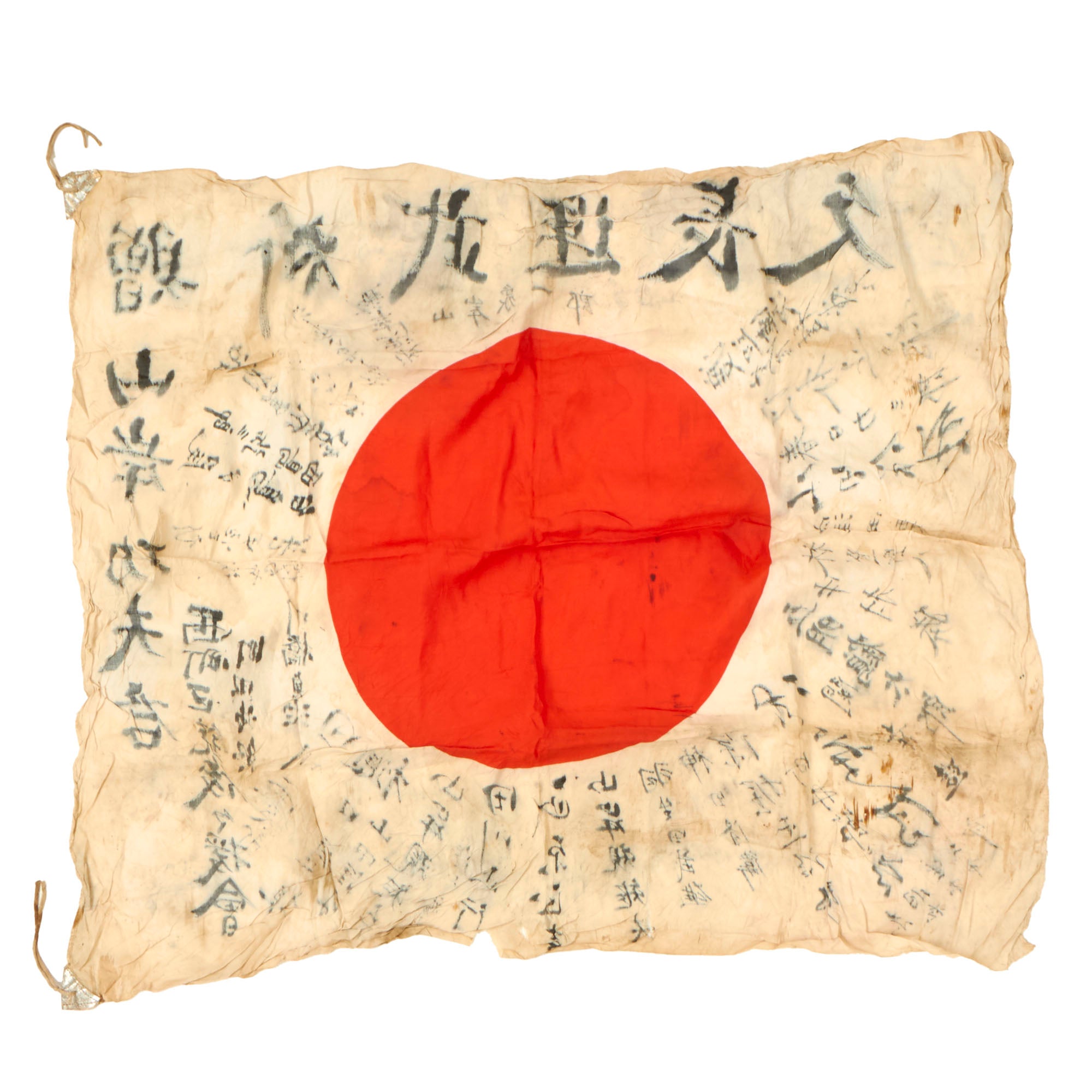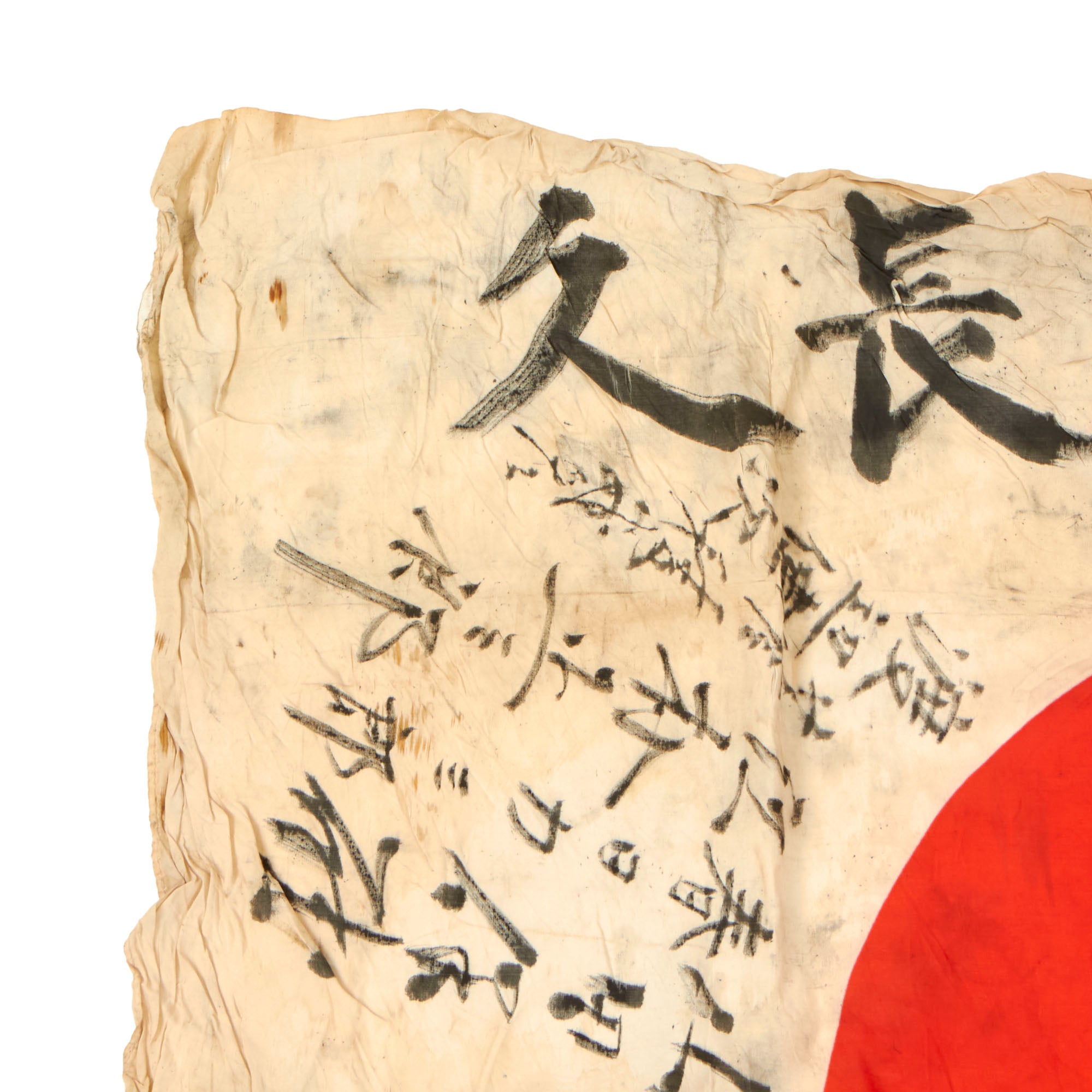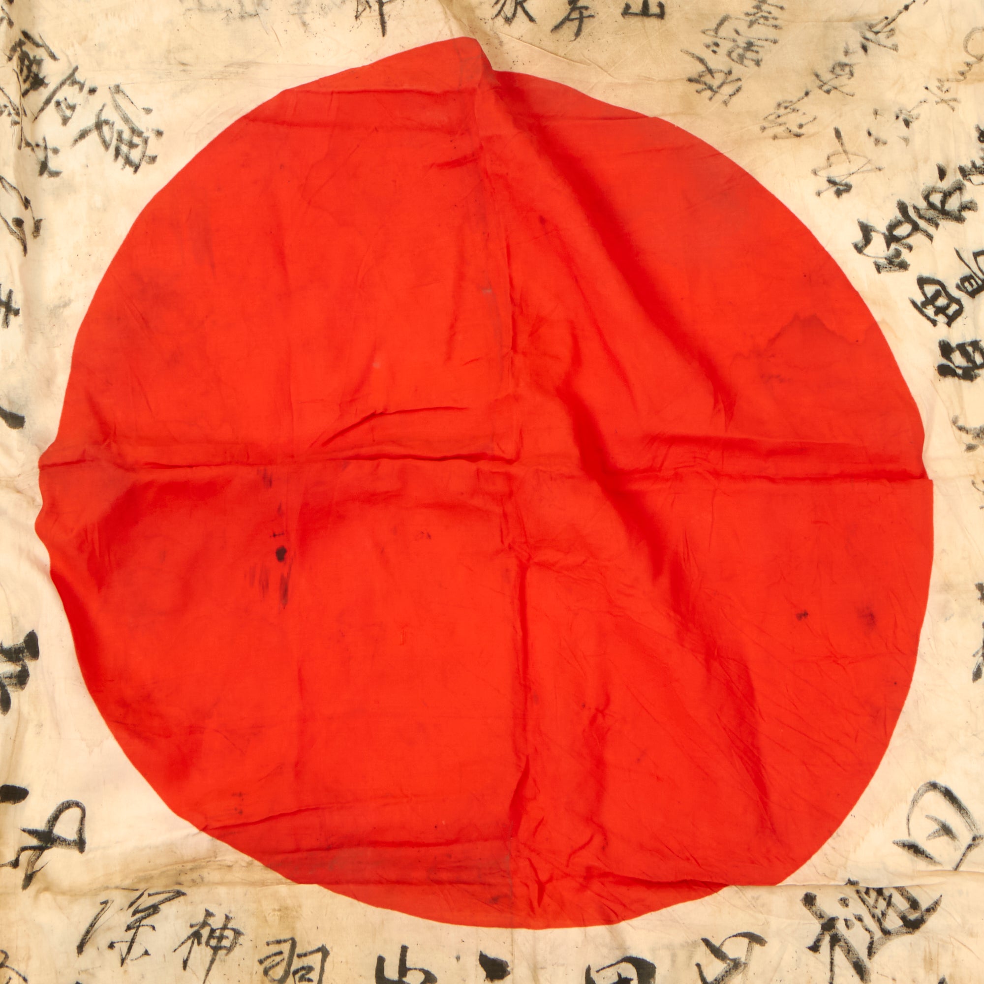 The Japanese call their country's flag hinomaru, which translates literally to "sun-round", referencing the red circle on a white field. When the hinomaru was signed, the Japanese characters were usually written vertically, and radiated outward from the edge of the red circle. This practice is referenced in the second term, yosegaki, meaning "sideways-writing". The phrase hinomaru-yosegaki can be interpreted as "To write sideways around the red sun", describing the appearance of the signed flag. This particular example completely unique is written in old KANJI the writing are mainly Japanese names of this soldier's family and friends with quotes and phrases.