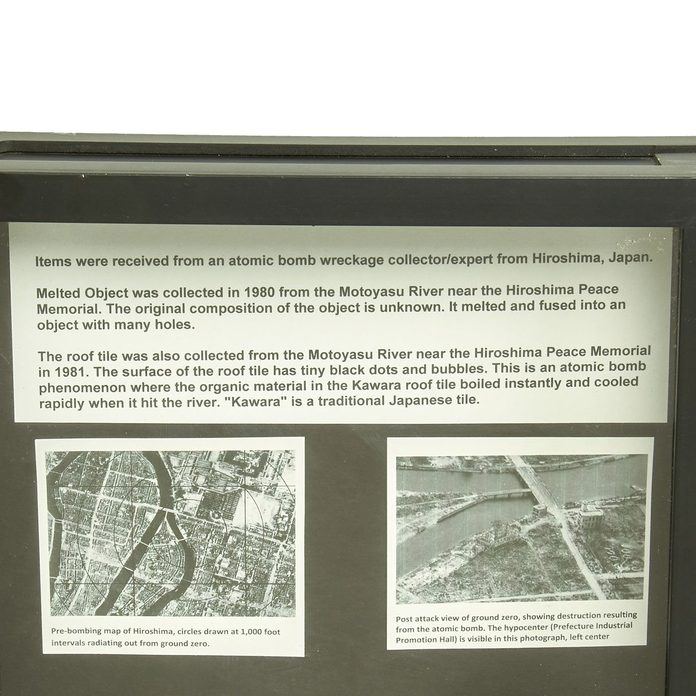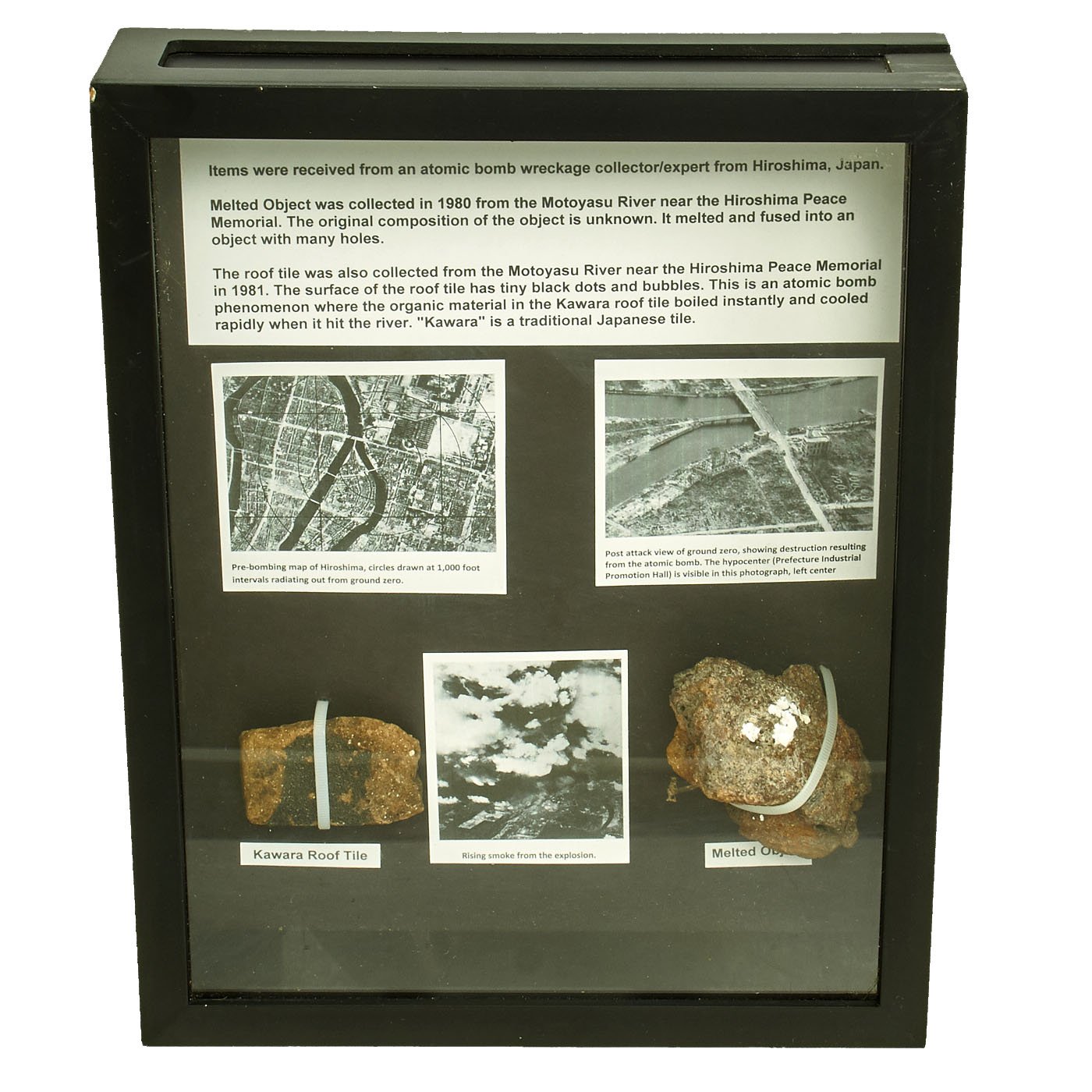 Original Items: One-of-a-kind set. These artifacts were collected in a river bed near ground zero of the atomic bomb explosion and we originally distributed by Hiroshima University’s Association for Sending Atomic-bombed Roof Tiles in order to perpetuate awareness of the devastating effects of the atomic bombings in Japan, and to oppose the use and proliferation of nuclear weapons. In a letter that accompanies the donation, Toshimasa Asahara, President of Hiroshima University, explains: