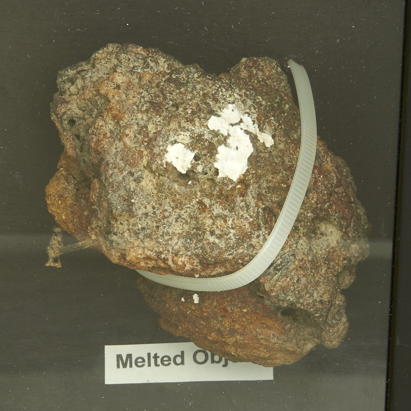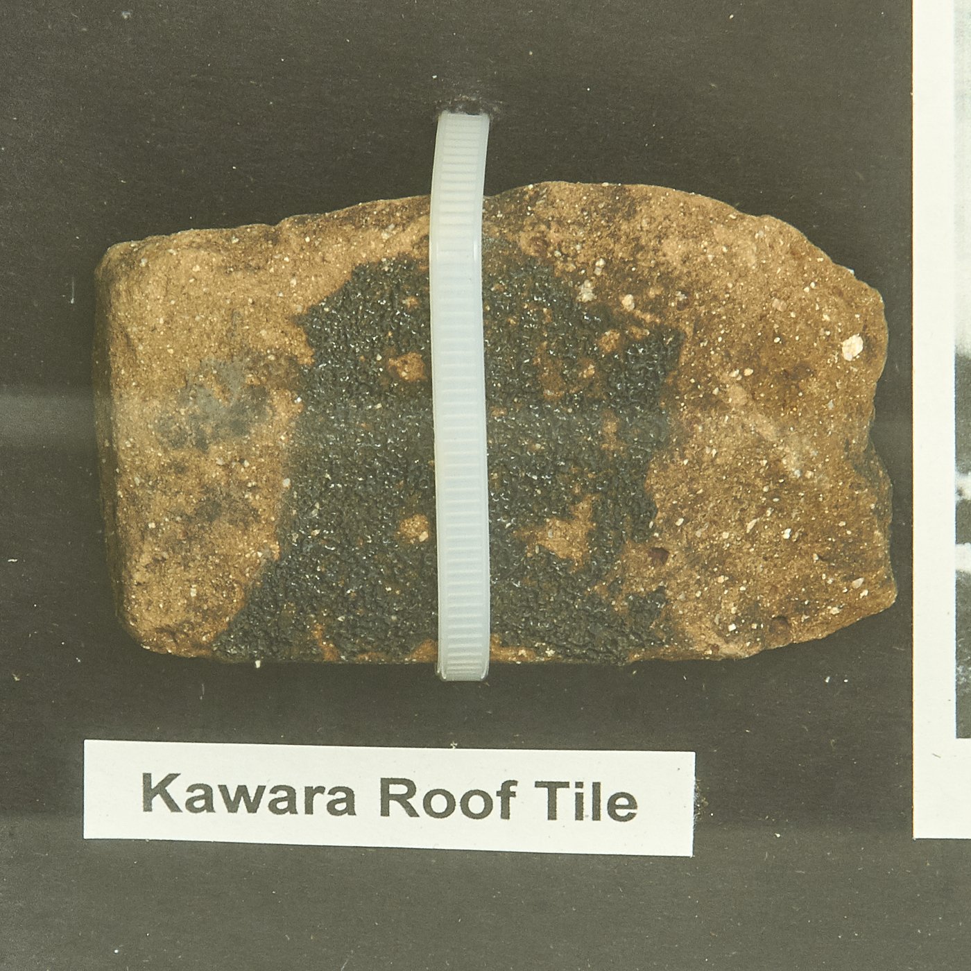 In addition to a small fragment of roof tile, there is an unknown melted object included which was also found in the river bed. Both are mounted in a river box with photos and explanations. This display was originally used for educational purposes.