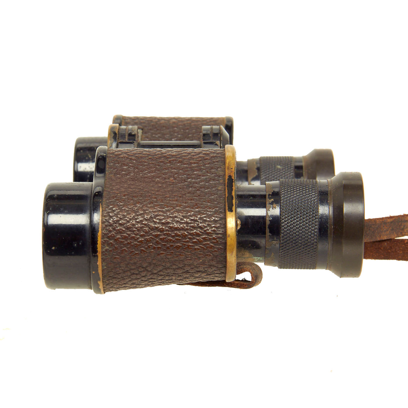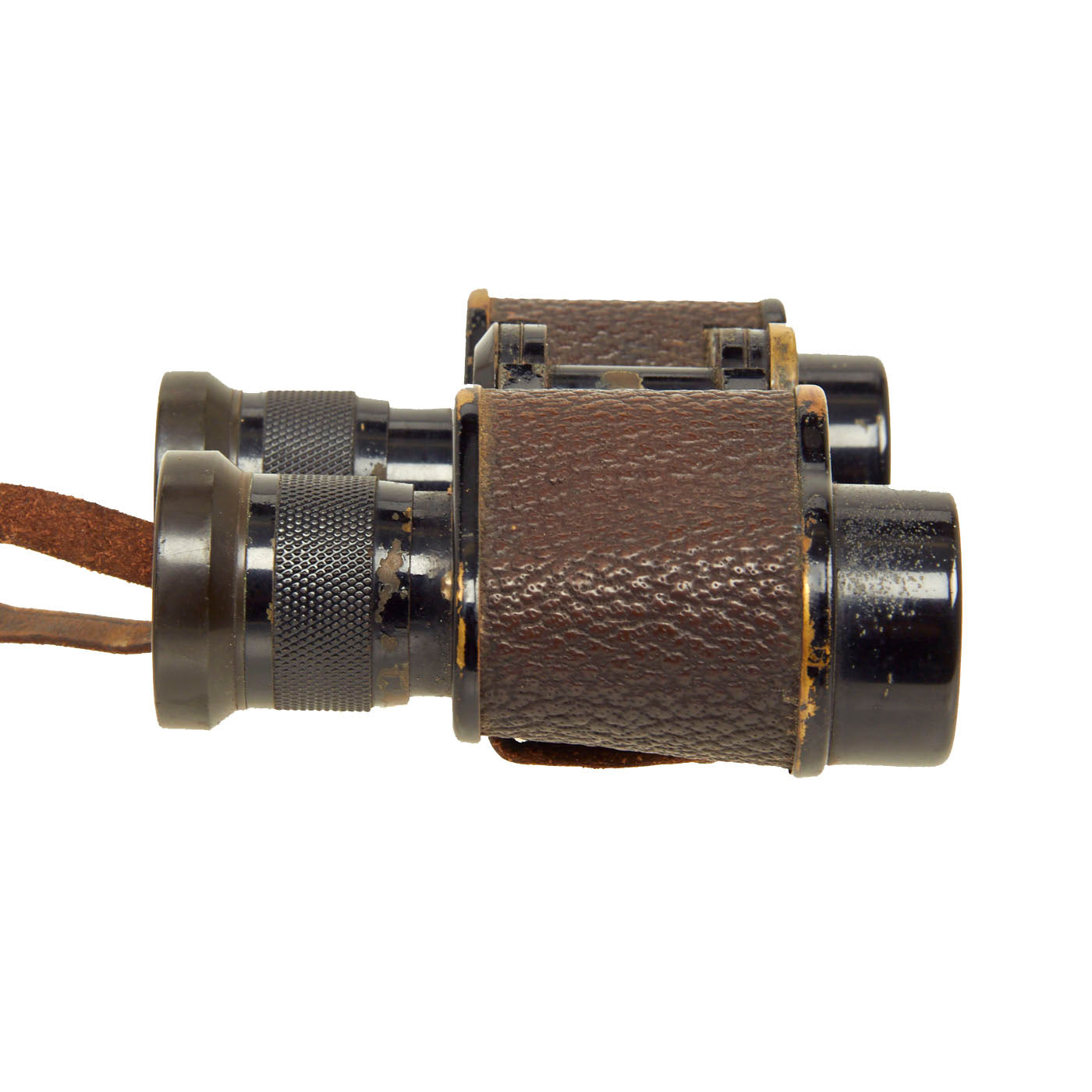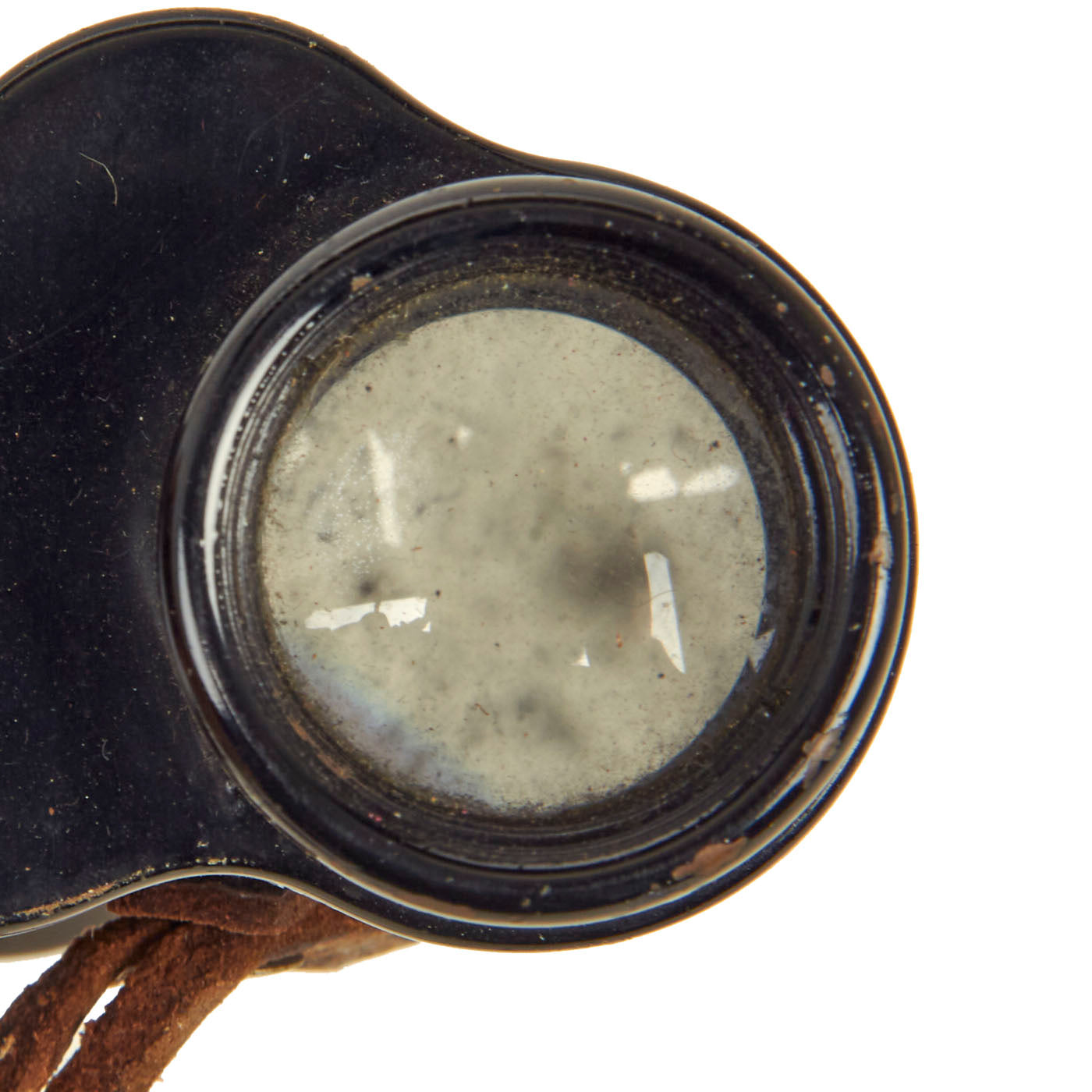 Optics have slight dirt specks, but overall very clear (we have made no attempt to clean). Original black painted finish is roughly 80% intact. Textured barrel covers are in fine shape. Original Bakelite Eyecups and bezels are perfect. Hinge is tight and swivels as it should. Nothing missing, replaced, repaired, broken or non-original. This is a rare find and a great piece of history.