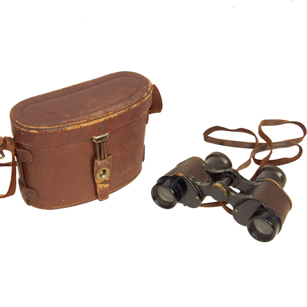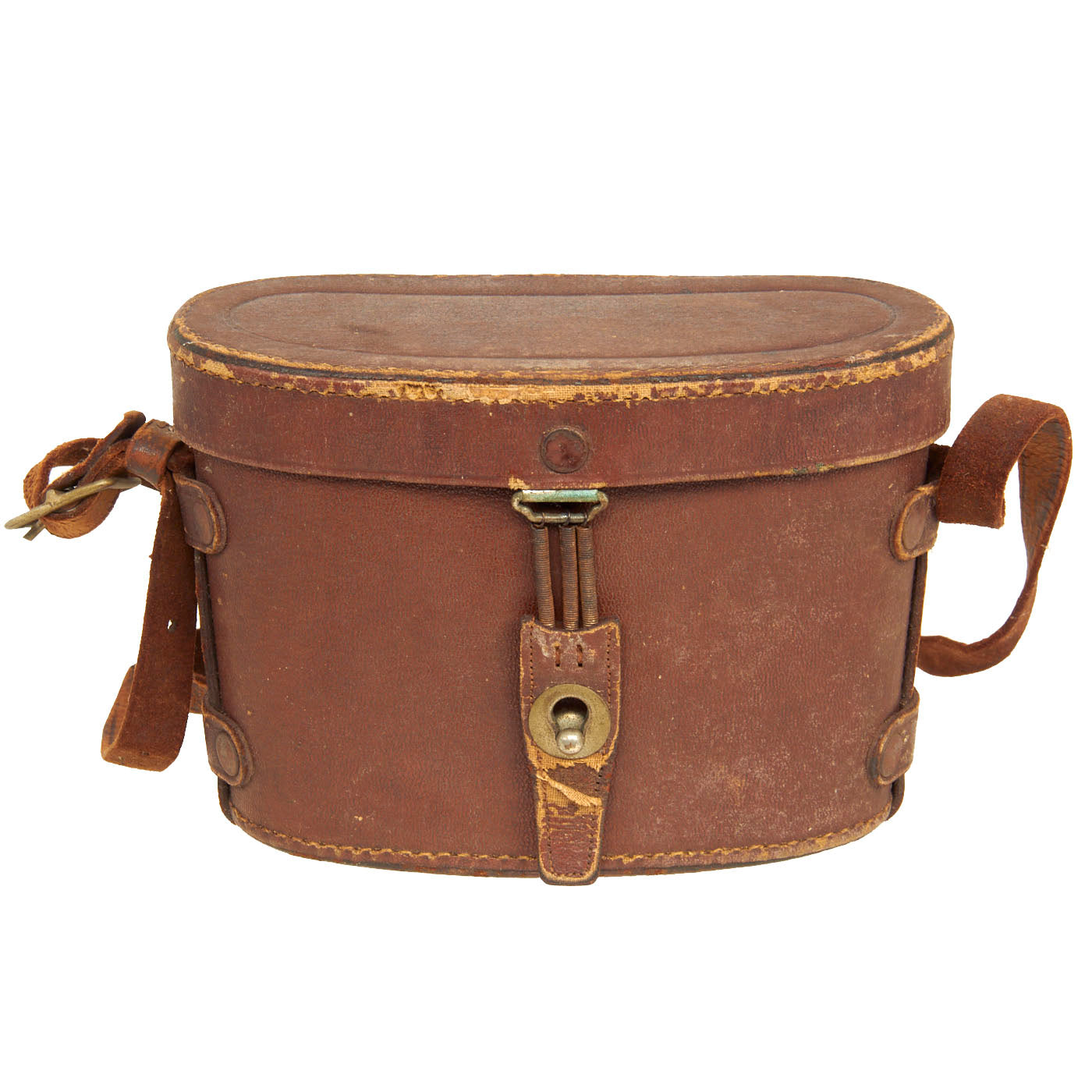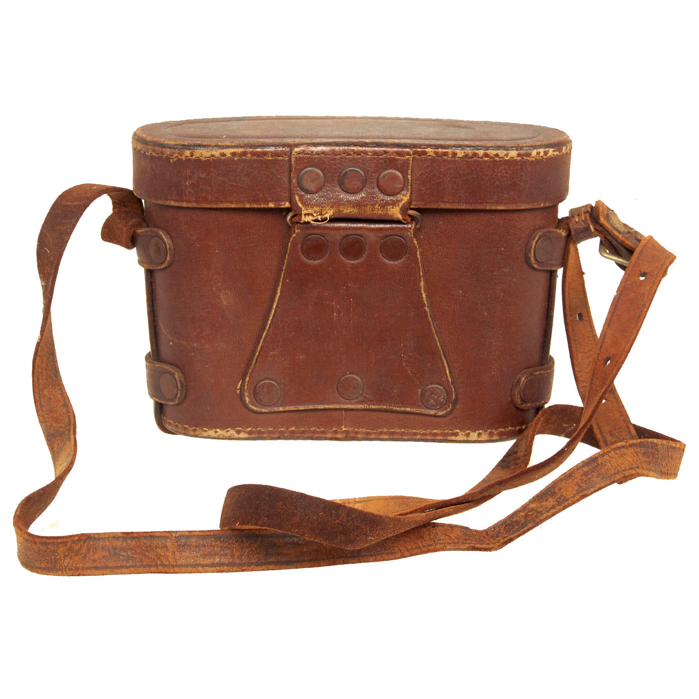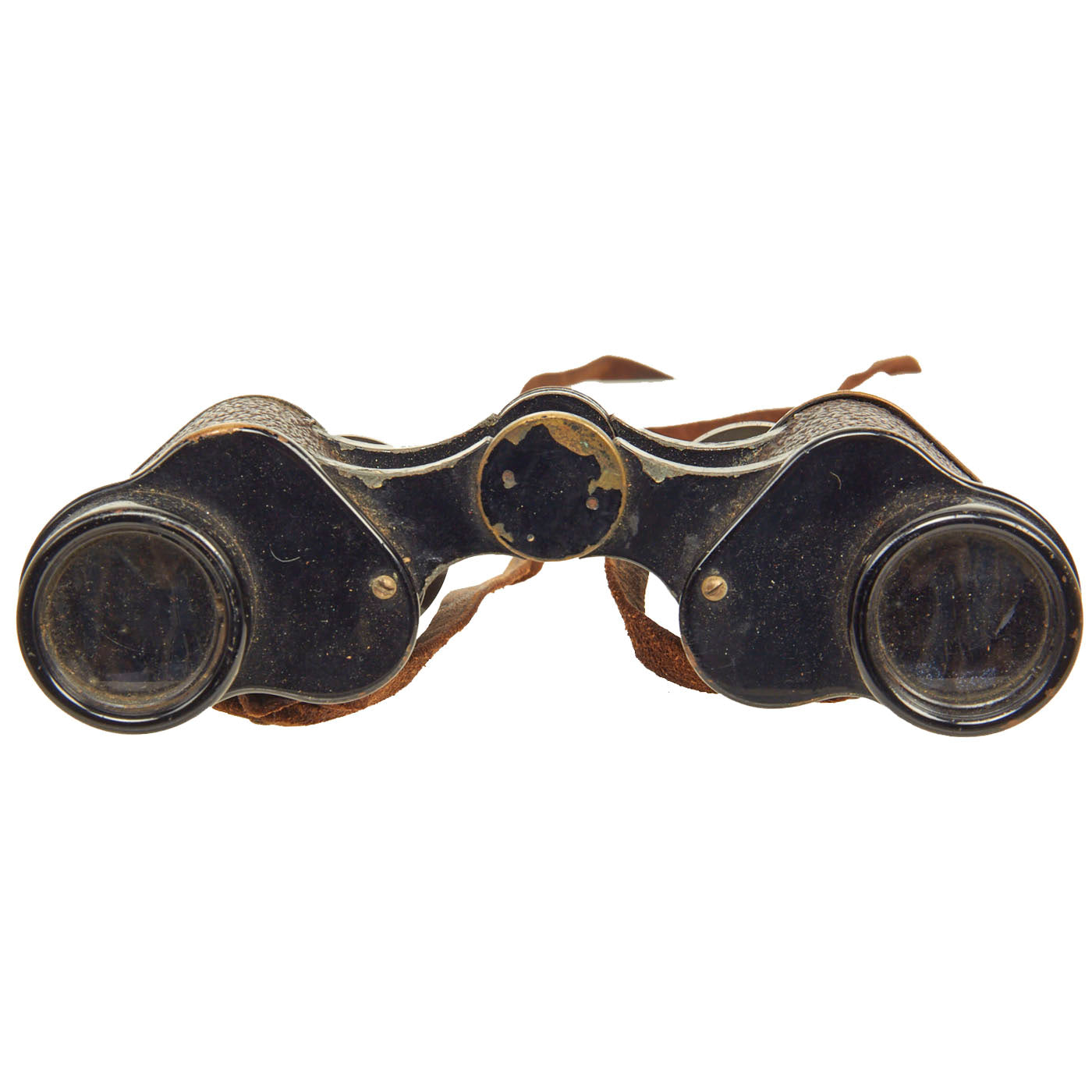 Optics have slight dirt specks, but overall very clear (we have made no attempt to clean). Original black painted finish is roughly 80% intact. Textured barrel covers are in fine shape. Original Bakelite Eyecups and bezels are perfect. Hinge is tight and swivels as it should. Nothing missing, replaced, repaired, broken or non-original. This is a rare find and a great piece of history.