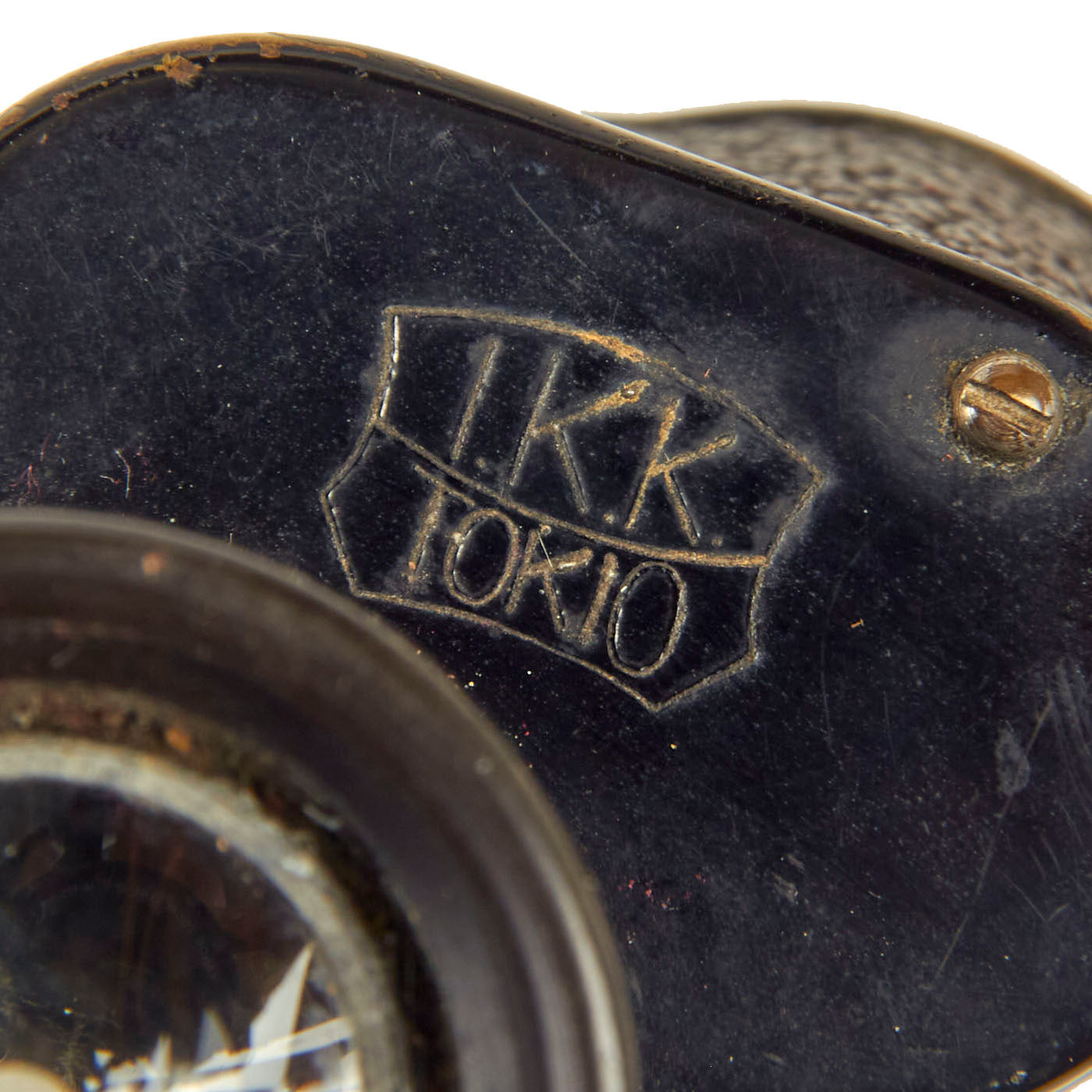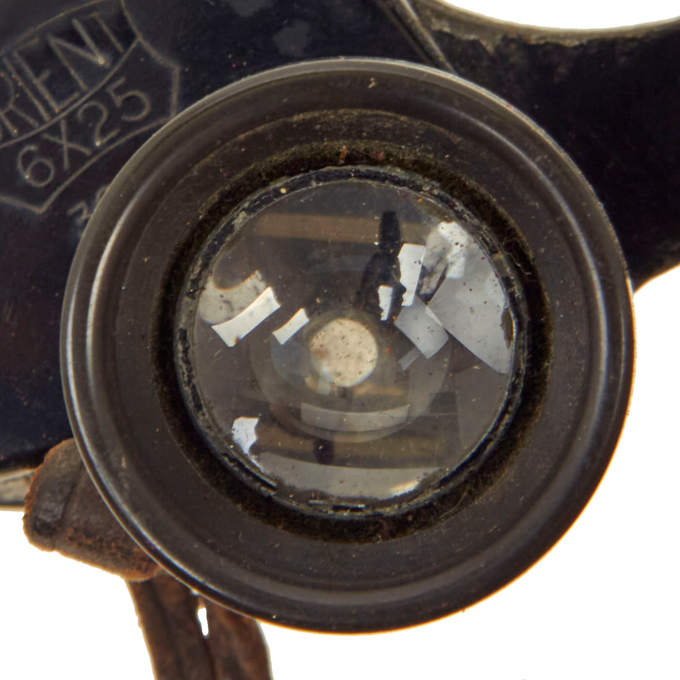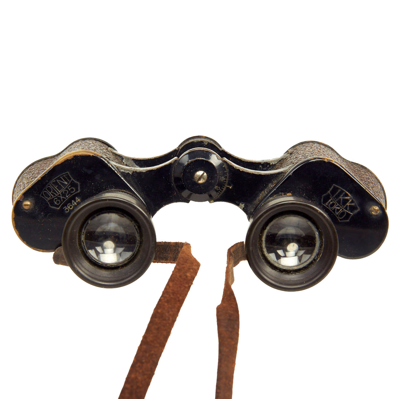 Original Item: Only One Available. An original pair of WWII Japanese Military Binoculars in excellent overall condition . Maker marked "ORIENT" on the left plate and “IKK TOKIO” on the right in a symbol that looks like a “squashed” shield. Power is marked as: 6 x 25. Numbered; No. 3644.