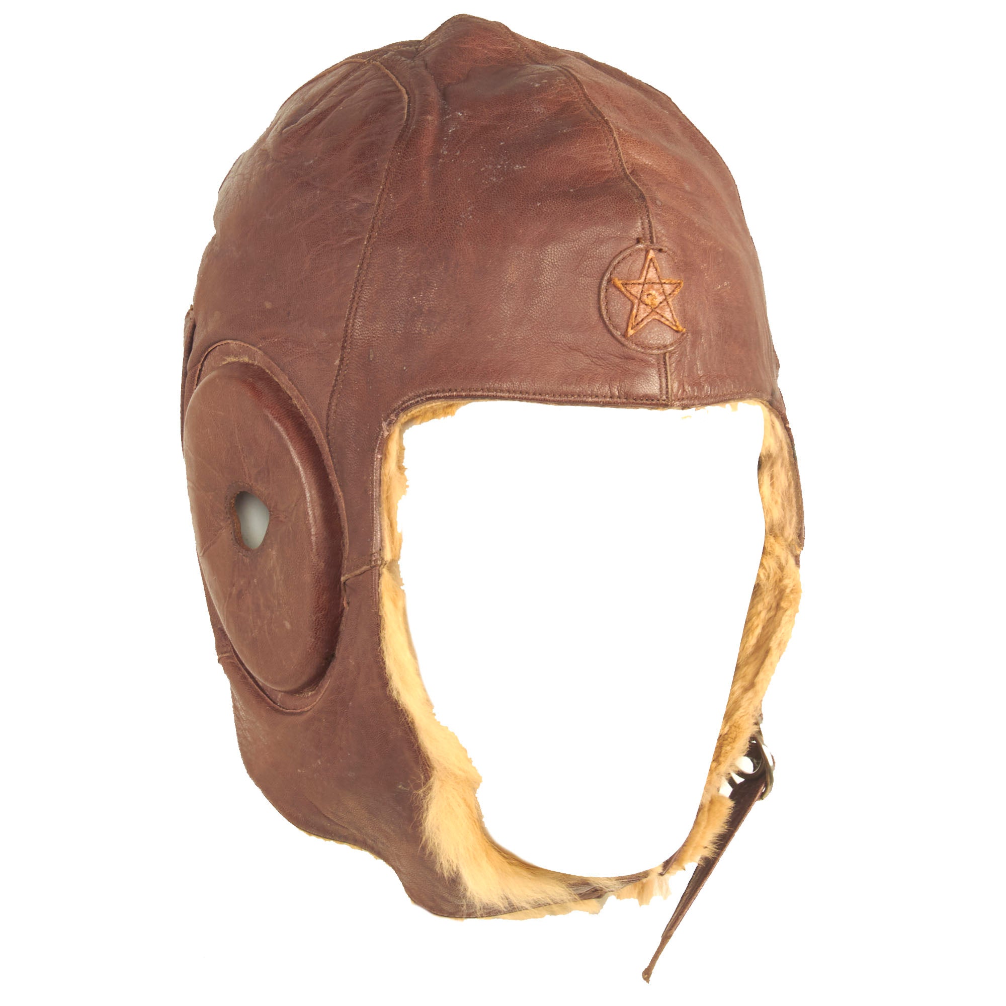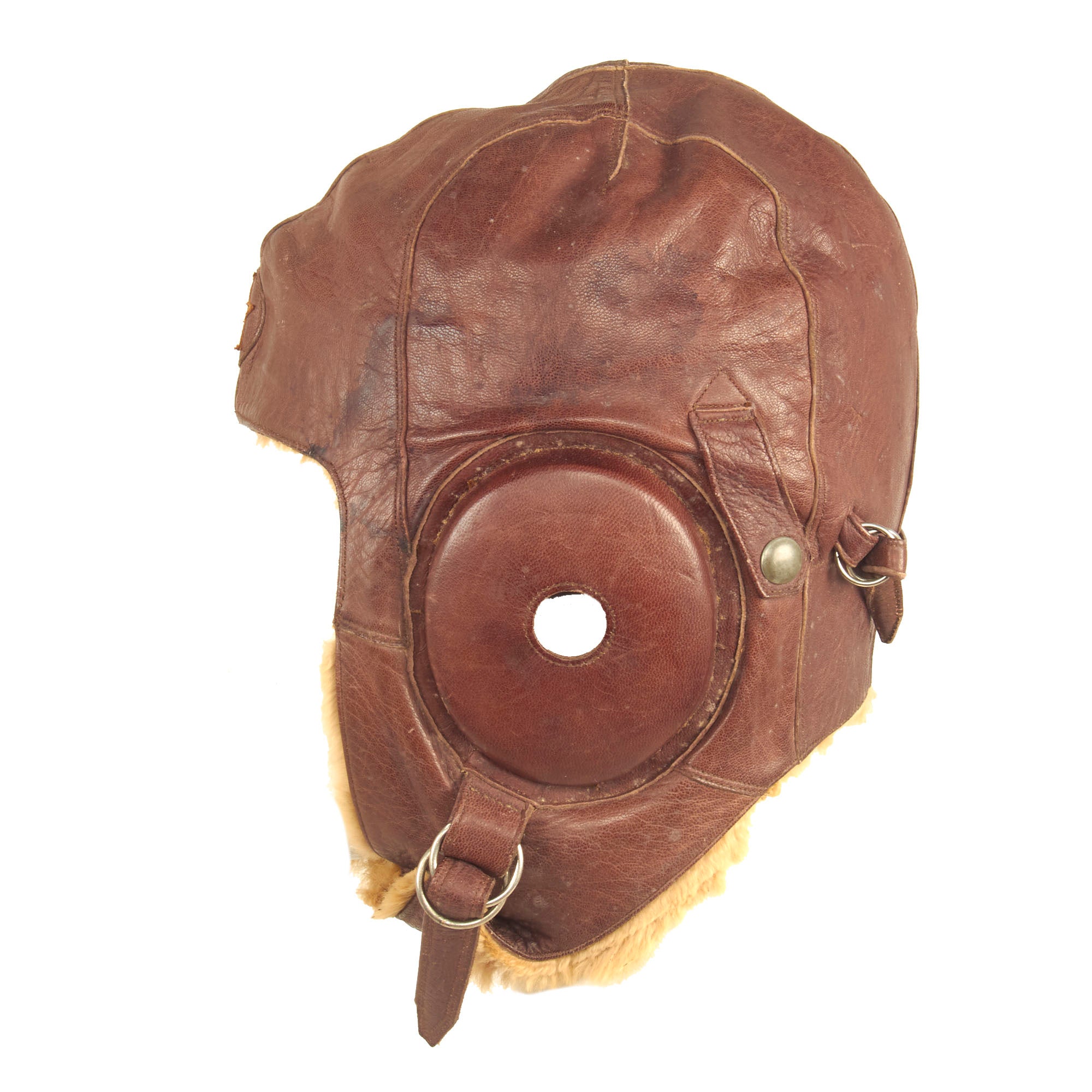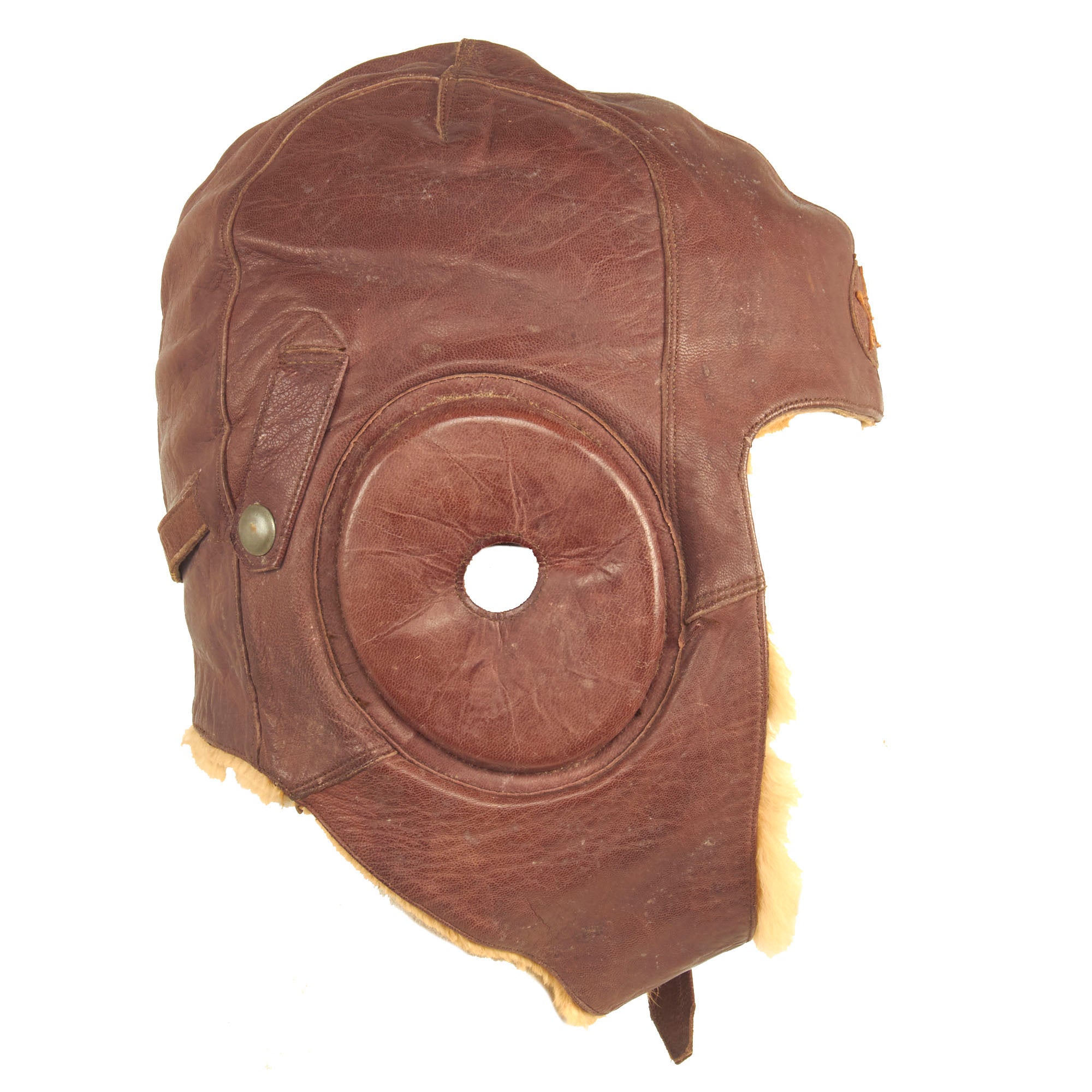 This is the standard helmet which began use in the early 1930s and was issued through to the end of the war. The soft helmet is constructed of approximately eight pieces of brown leather, is completely lined in cotton twill and brown rabbit fur. A beautiful, solid example.