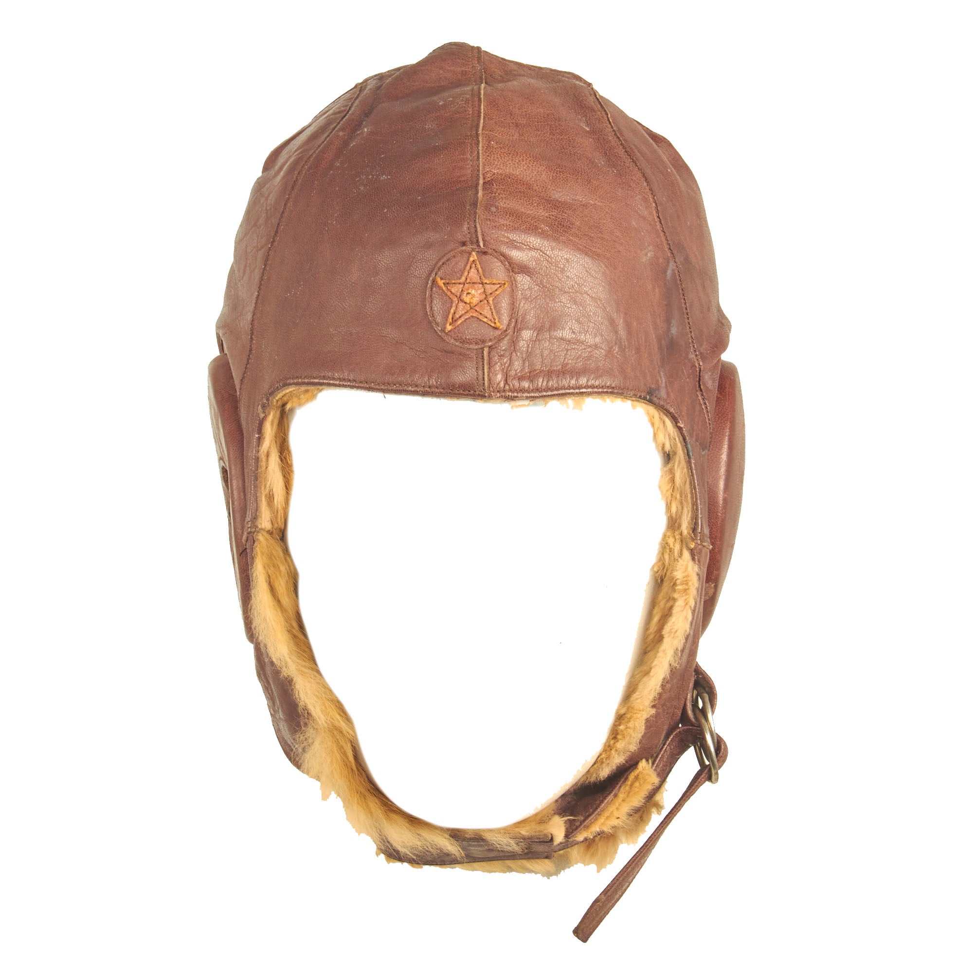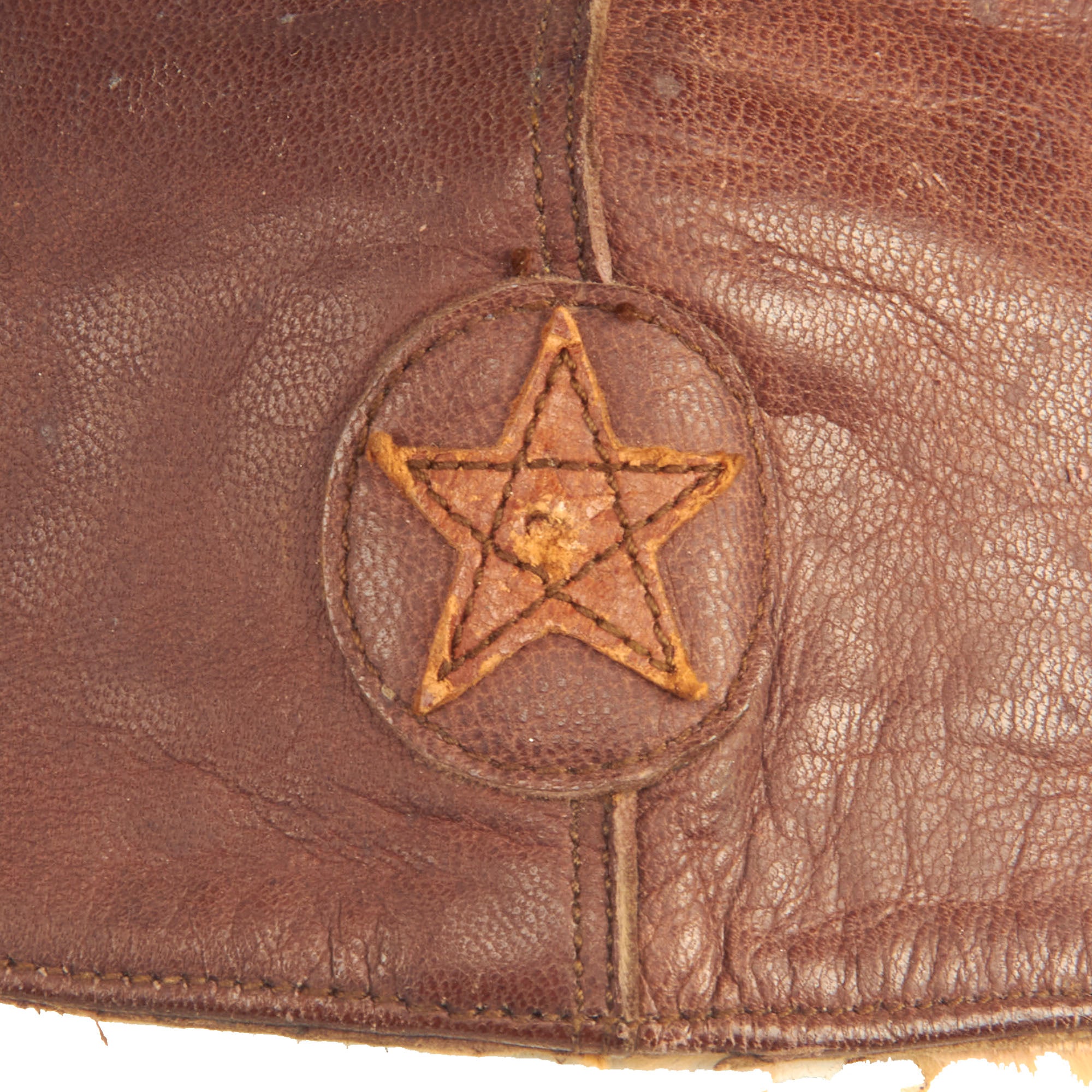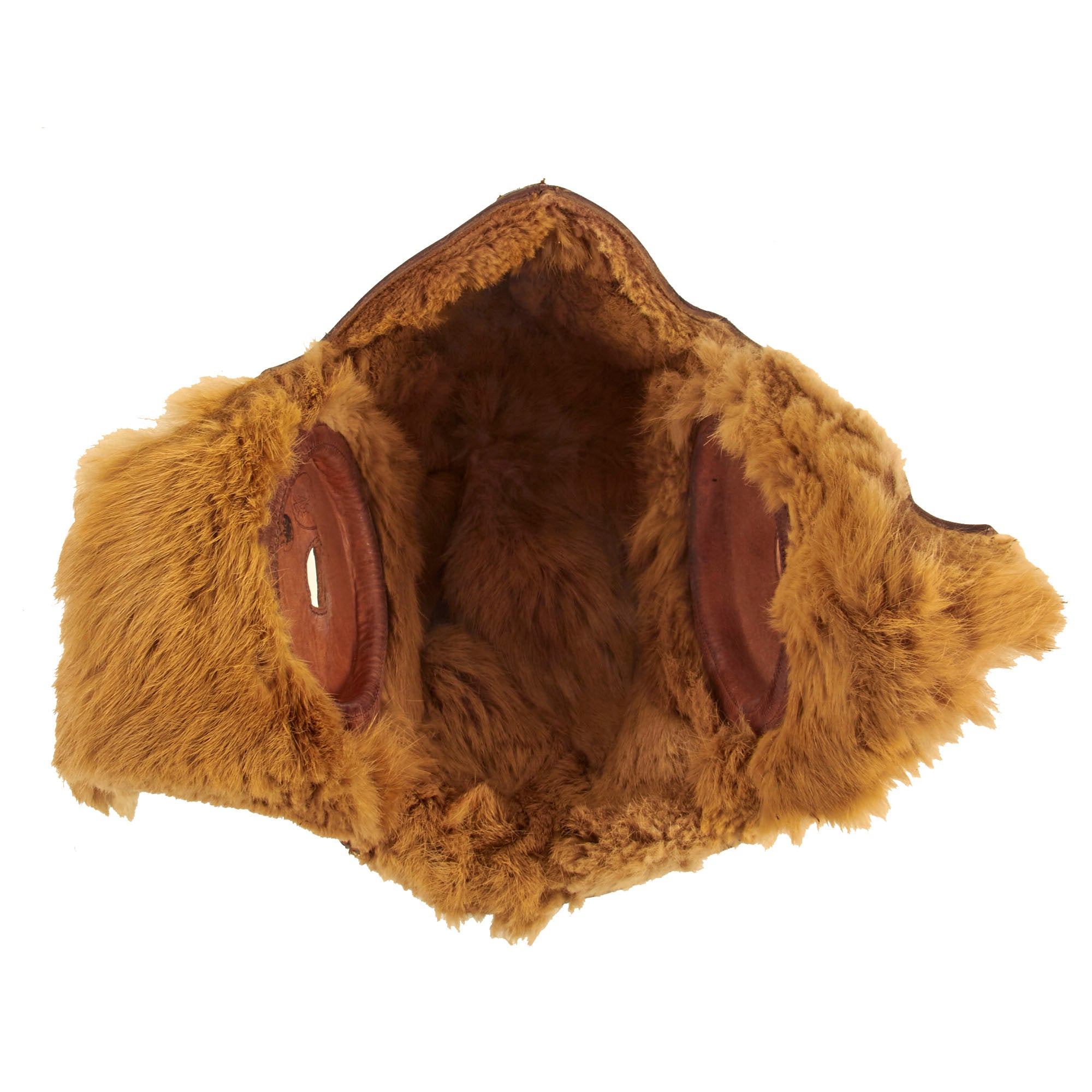 This is the standard helmet which began use in the early 1930s and was issued through to the end of the war. The soft helmet is constructed of approximately eight pieces of brown leather, is completely lined in cotton twill and brown rabbit fur. A beautiful, solid example.