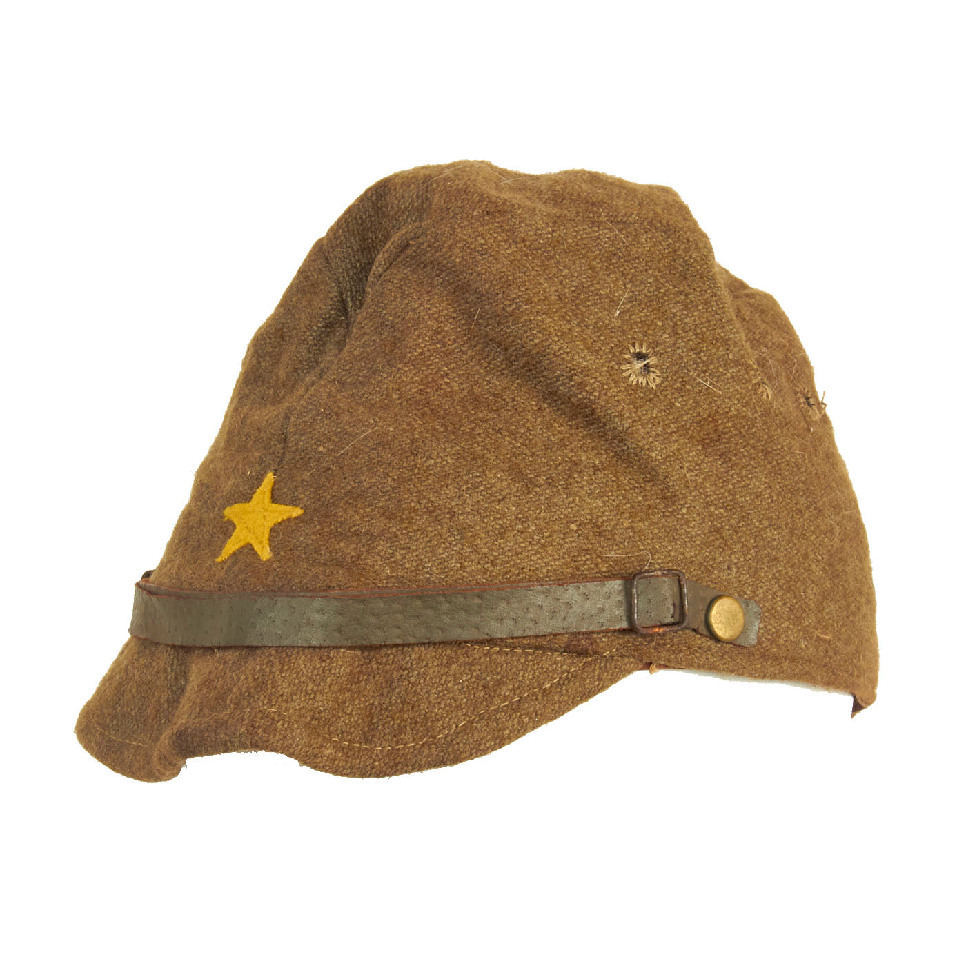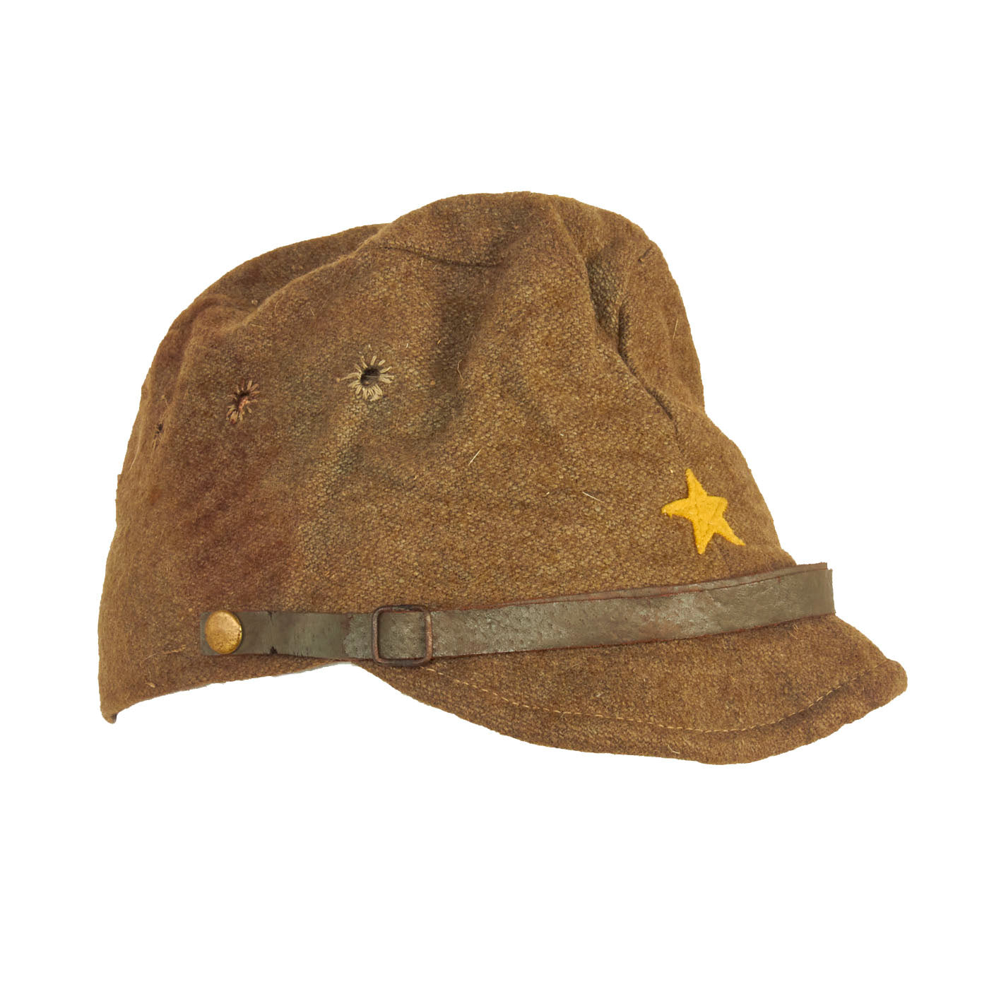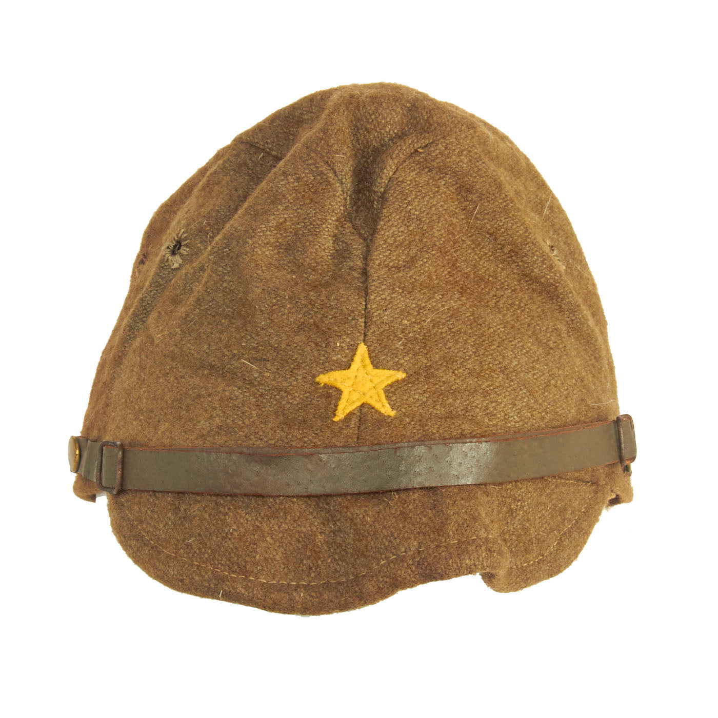 Original Item: Only One Available. This is a lovely, worn example of a wool enlisted man’s forage cap. Fully lined with leather sweatband. Features the classic string closure eyelits to the back with closure string. The front features a lovely yellow wool five-pointed imperial Japanese star cap badge without background. The leather chinstrap is still present with minimal cracking in the finish. The leather sweatband has quite a bit of cracking to it and has degraded from wear and time, but still in lovely condition.