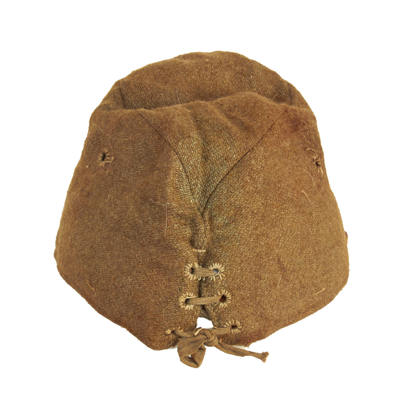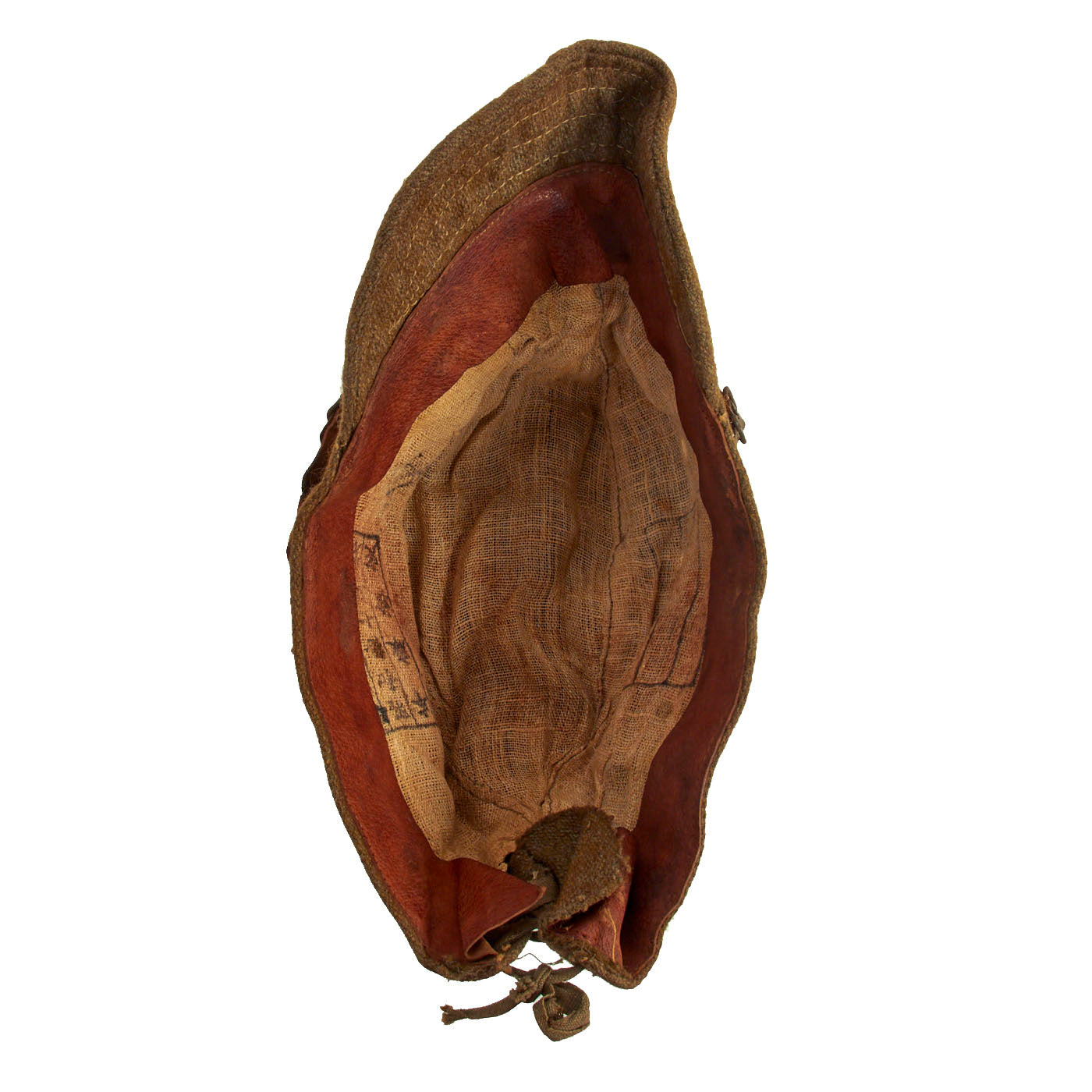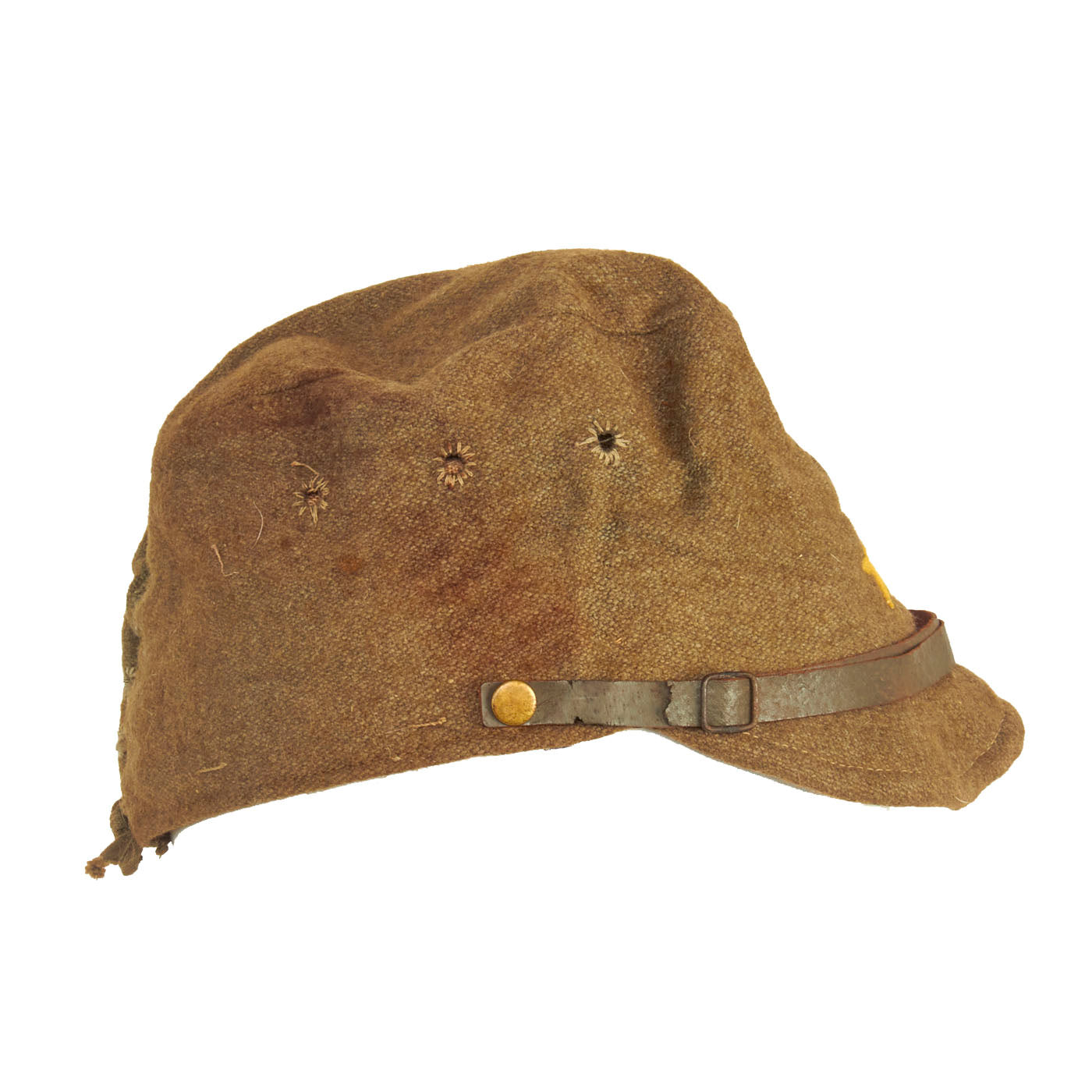 Original Item: Only One Available. This is a lovely, worn example of a wool enlisted man’s forage cap. Fully lined with leather sweatband. Features the classic string closure eyelits to the back with closure string. The front features a lovely yellow wool five-pointed imperial Japanese star cap badge without background. The leather chinstrap is still present with minimal cracking in the finish. The leather sweatband has quite a bit of cracking to it and has degraded from wear and time, but still in lovely condition.
