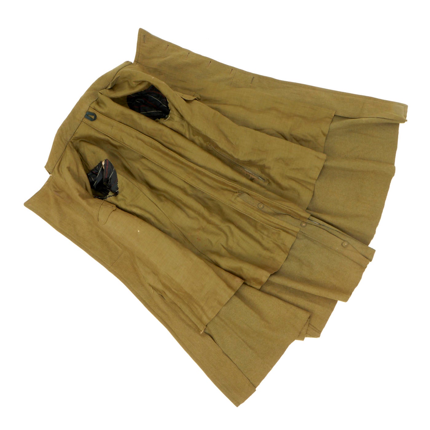 The jacket is in good condition but does display the expected wear from long service and many years of storage. There are a few moth nips throughout, but nothing too serious. All buttons are present and still function properly. The wool is rough to the touch and is no longer soft. This is an excellent example of an Imperial Japanese Army officer’s service worn wool coat.