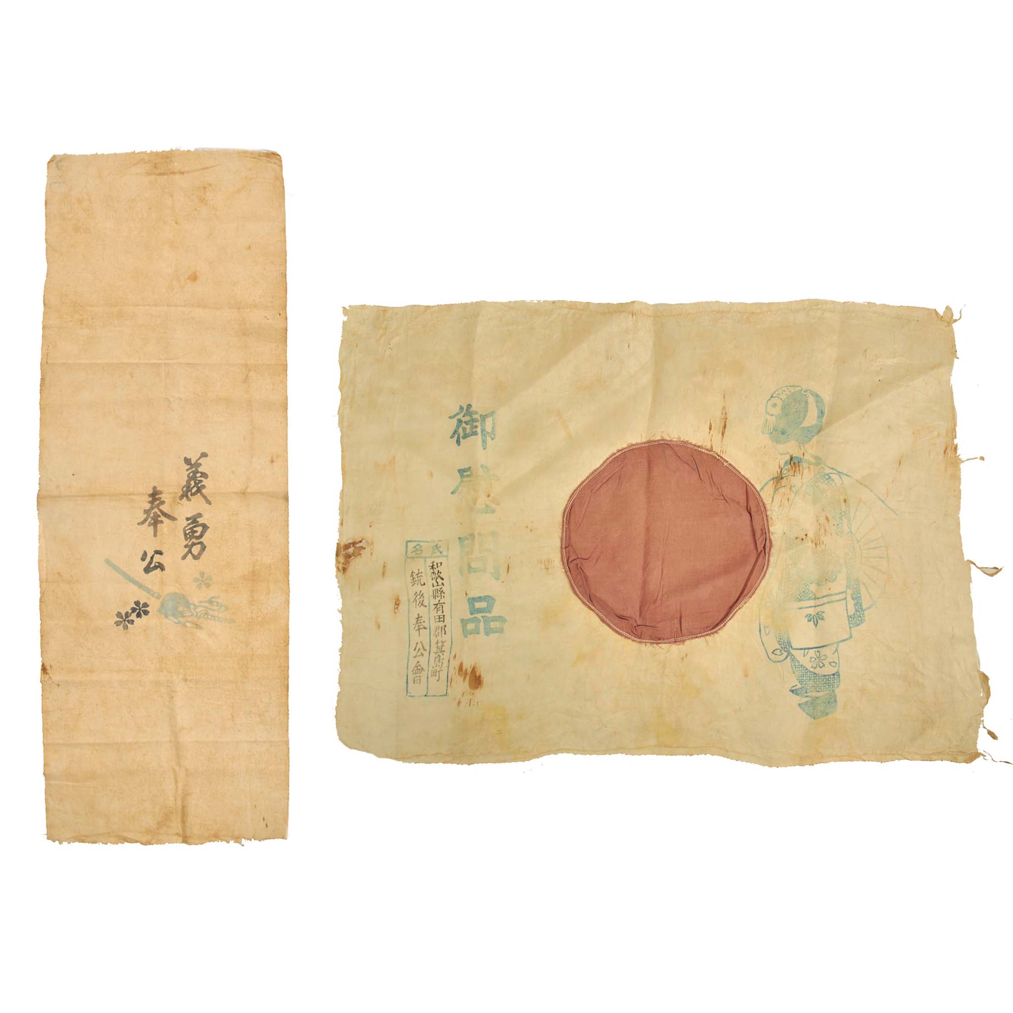 Original Japanese WWII Imperial Japanese Army Shussei Nobori Cotton Banner and Small Japanese Flag From an Imon-Bukuro (Comfort Bag) Featuring an Image of a Geisha - 2 Items