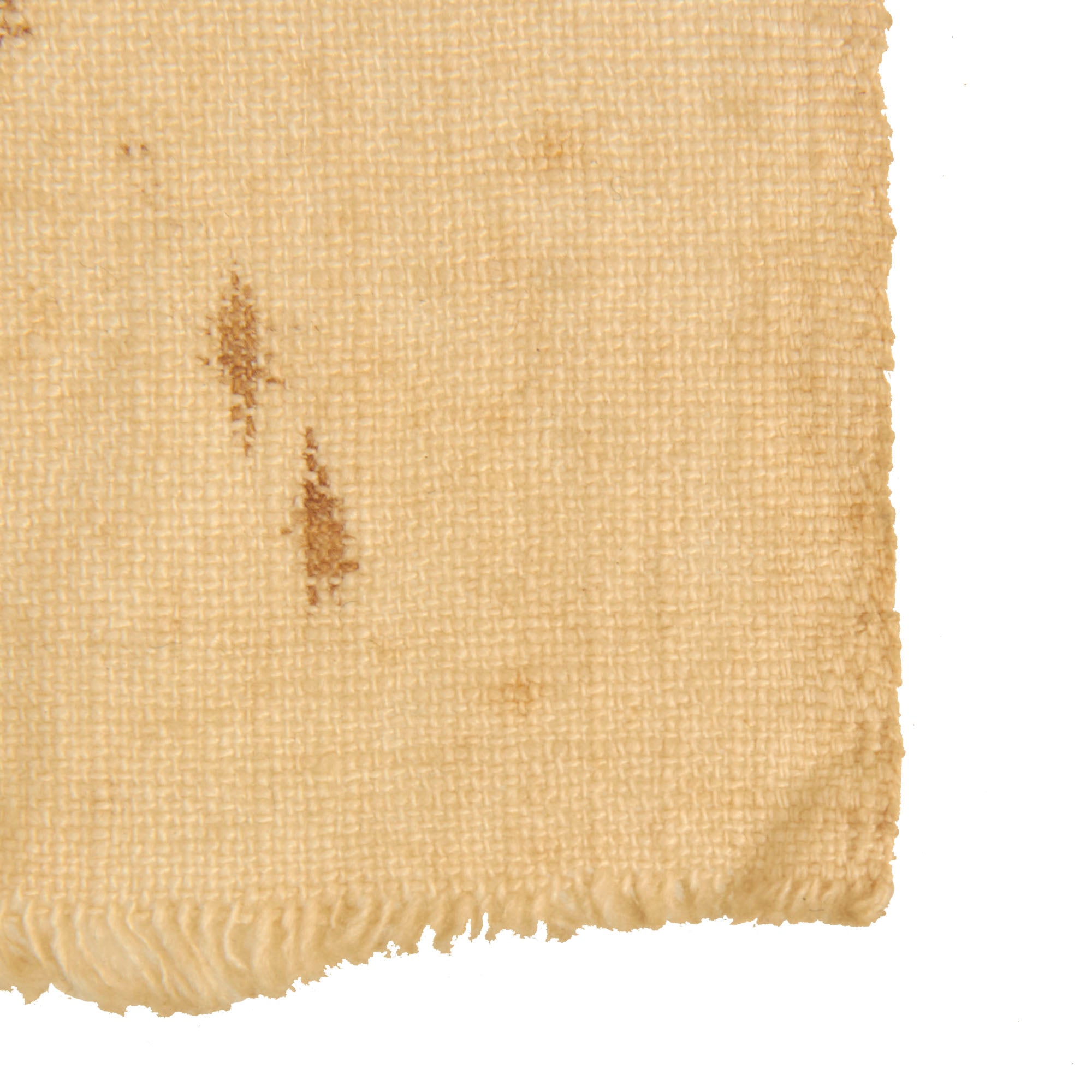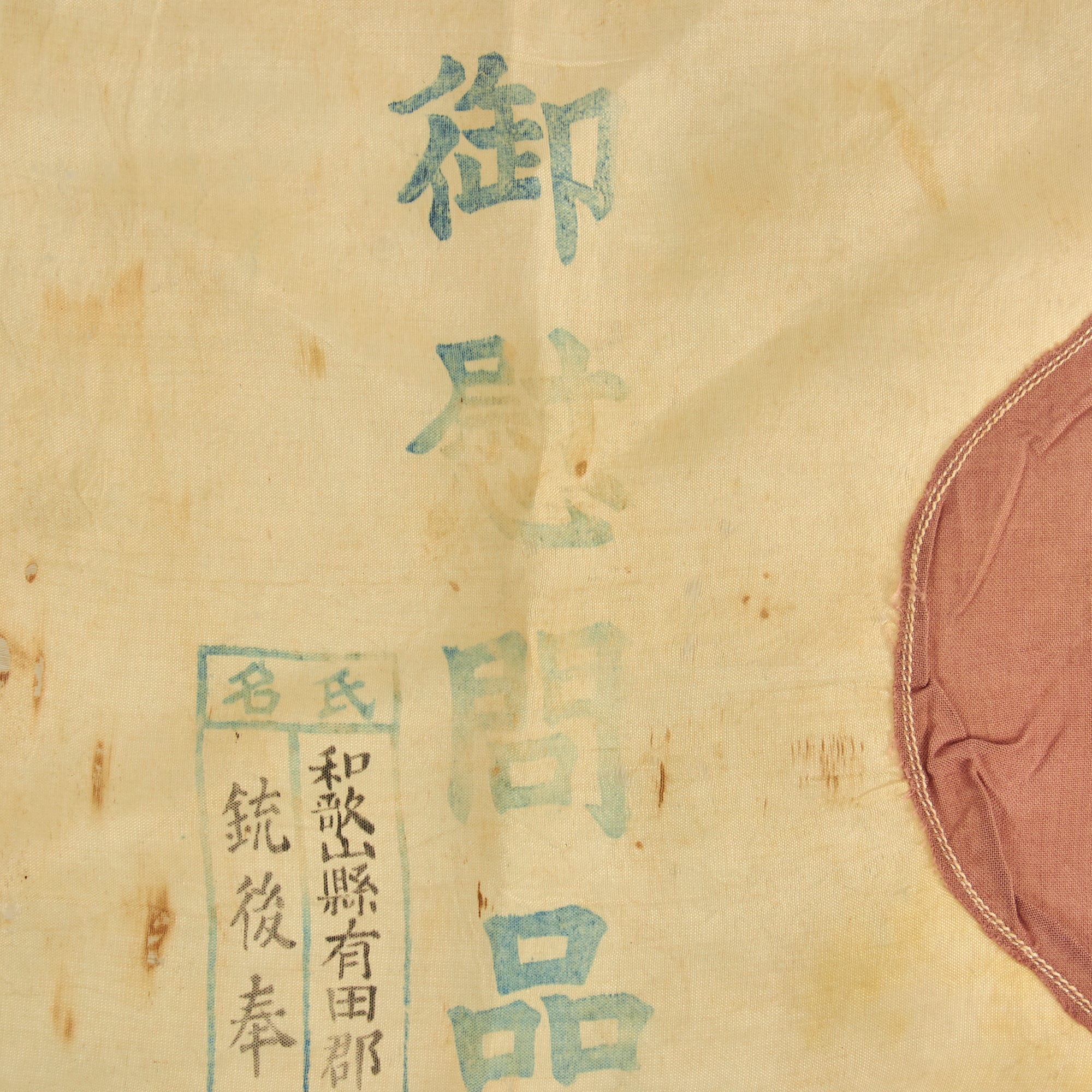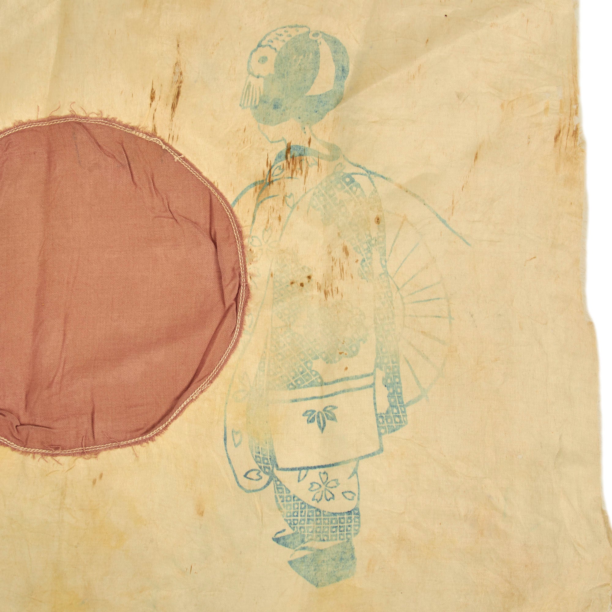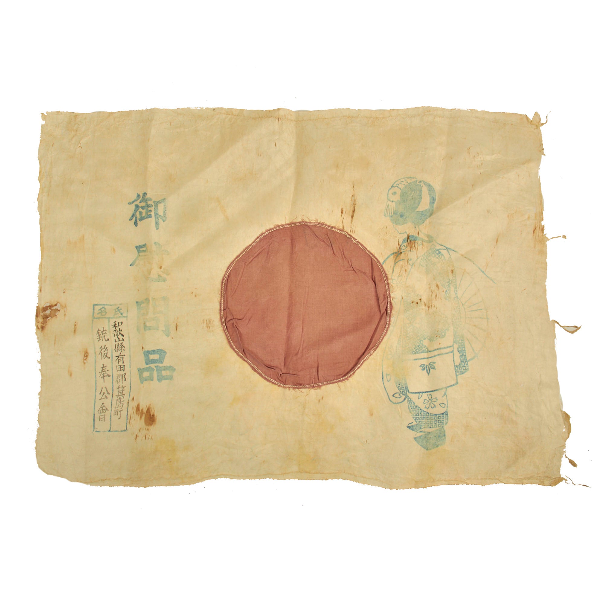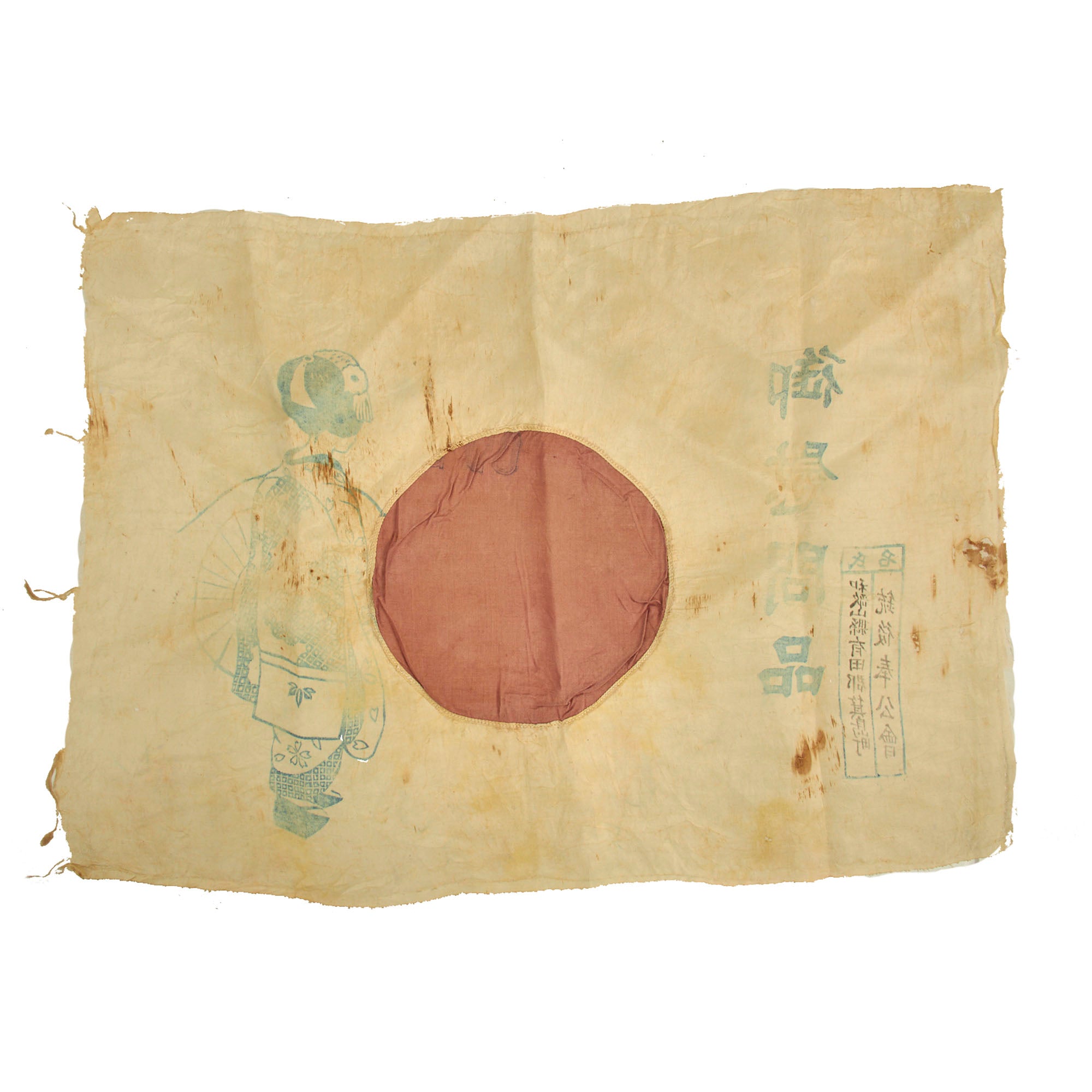 - Rayon Silk Flag of Japan (19 ½” x 14”): This is a lovely little flag of Japan which appears to have been a part of the Imon-Bukuro comfort bag kits that were sent to soldiers on the frontlines. The flag, which also features the same rust colored stains as the banner, may have been carried by the same soldier. There are other stains, tearing and fraying along the edges with evidence of it having been possibly stitched to something else. The flag is of two piece construction with the “sun” being sewn into the center. There are faint temple stamps and other Kanji markings present but the best feature is the lovely Geisha that is present on the left side of the flag. The word geisha comes from the Japanese word “gei” meaning art and “sha” meaning person. Geishas are artisans and purveyors of traditional Japanese culture. Geisha women dedicate their lives to Japanese traditional arts and put their talents to use to entertain customers.