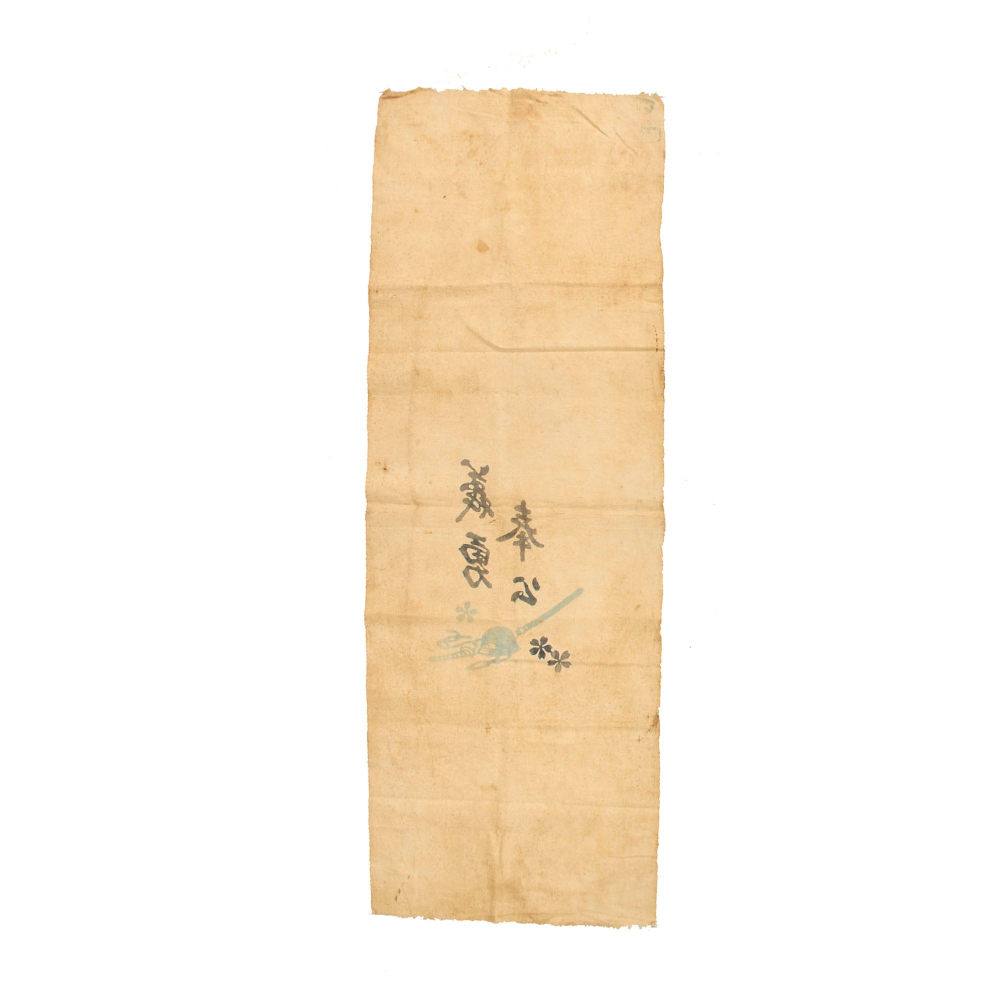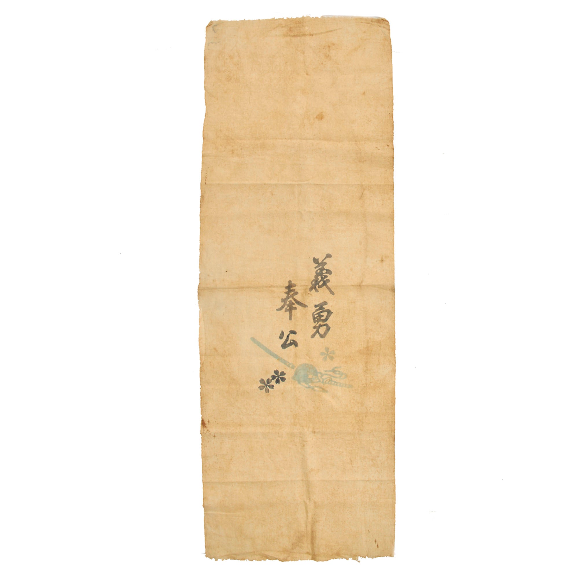 - Imperial Japanese Army “Off To War” Banner (36” x 12”): This appears to be a “generic” type of off to war banners. Many of these were produced to purchase and or to send to the young soldiers off, it was up to the presenter to write the names on them. The banner is in wonderful condition and features a faint, but beautiful image of a Japanese Helmet and Katana, a widely popular image to use on patriotic items. There are stains present on the banner, stains that coincide with an item having been carried by a person who fell on the battlefield. We cannot confirm the stains, but they are now faded to a rust colored hue.