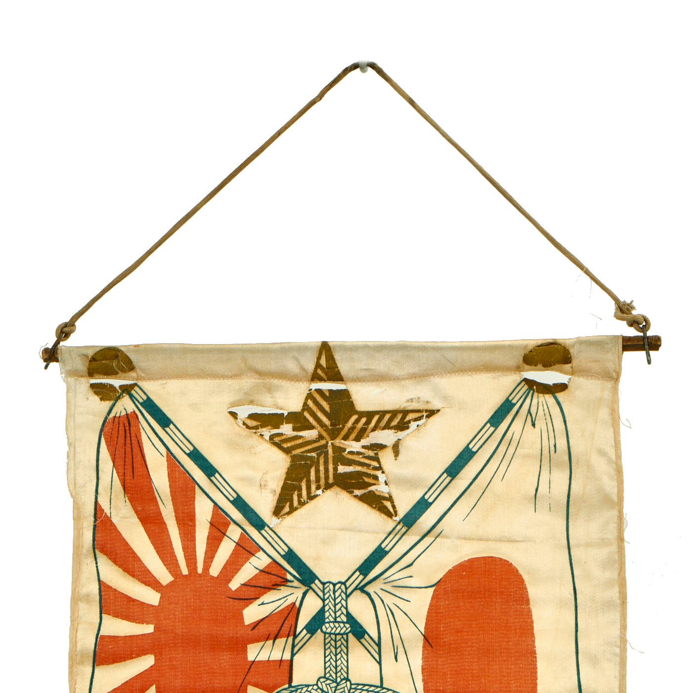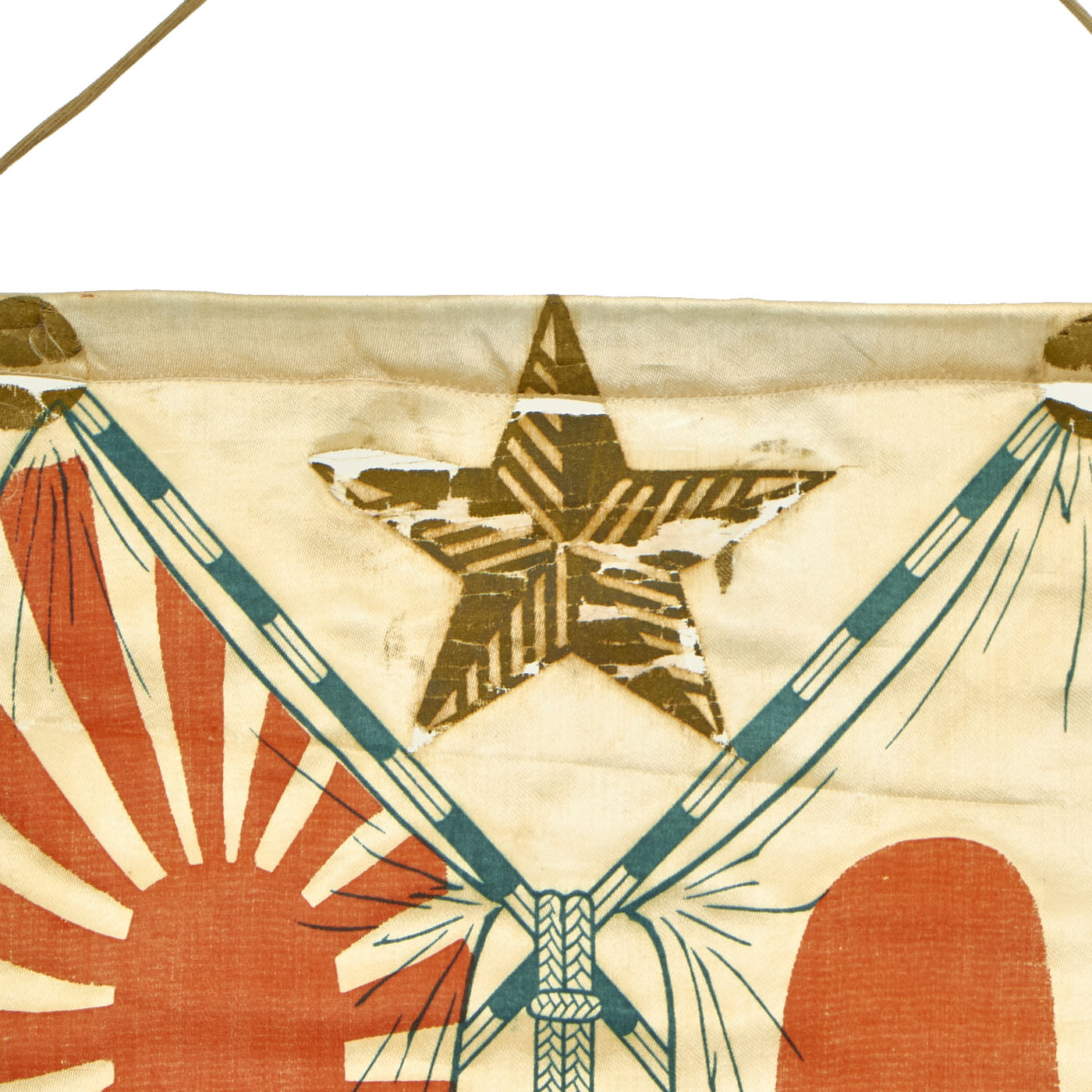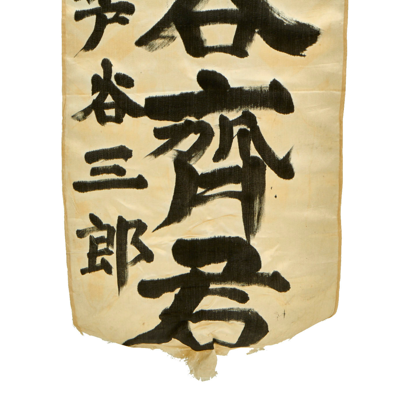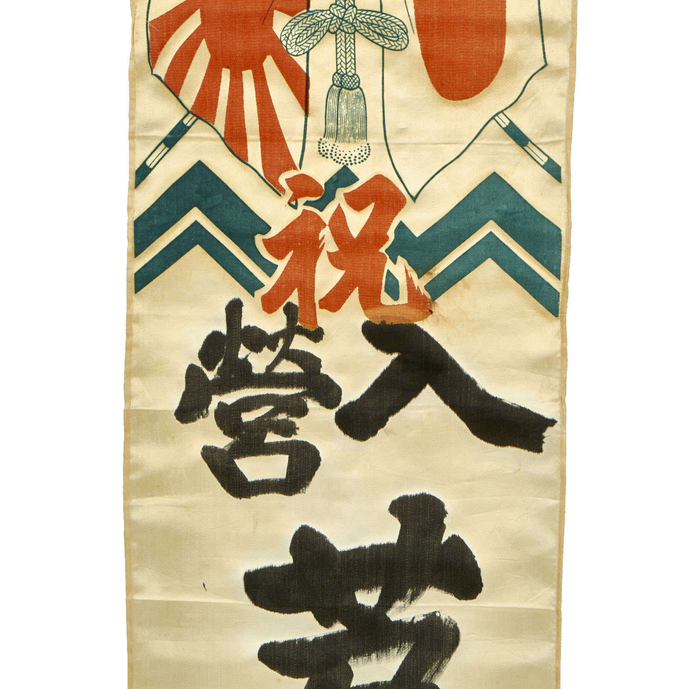 Original Item: One-Of-A-Kind. When Japanese men left for their military service, community organizations such as the local branch of the Imperial Reservists Association (teikoku zaigo gunjinkai) and the Greater Japan National Defense Women’s Association (dai nippon kokubo fujinkai) organized various celebrations, culminating in send-off parades to wish the troops well as they marched off to the local railway stations or ports. These send-off ceremonies were called sokokai and the participants in parades carried banners with the names of the recruits on them. The Japanese term for banner is nobori, and the exact Japanese name for them depends on the slogan. Here we refer to them as a “shussei nobori” or “Off To War Banners”.