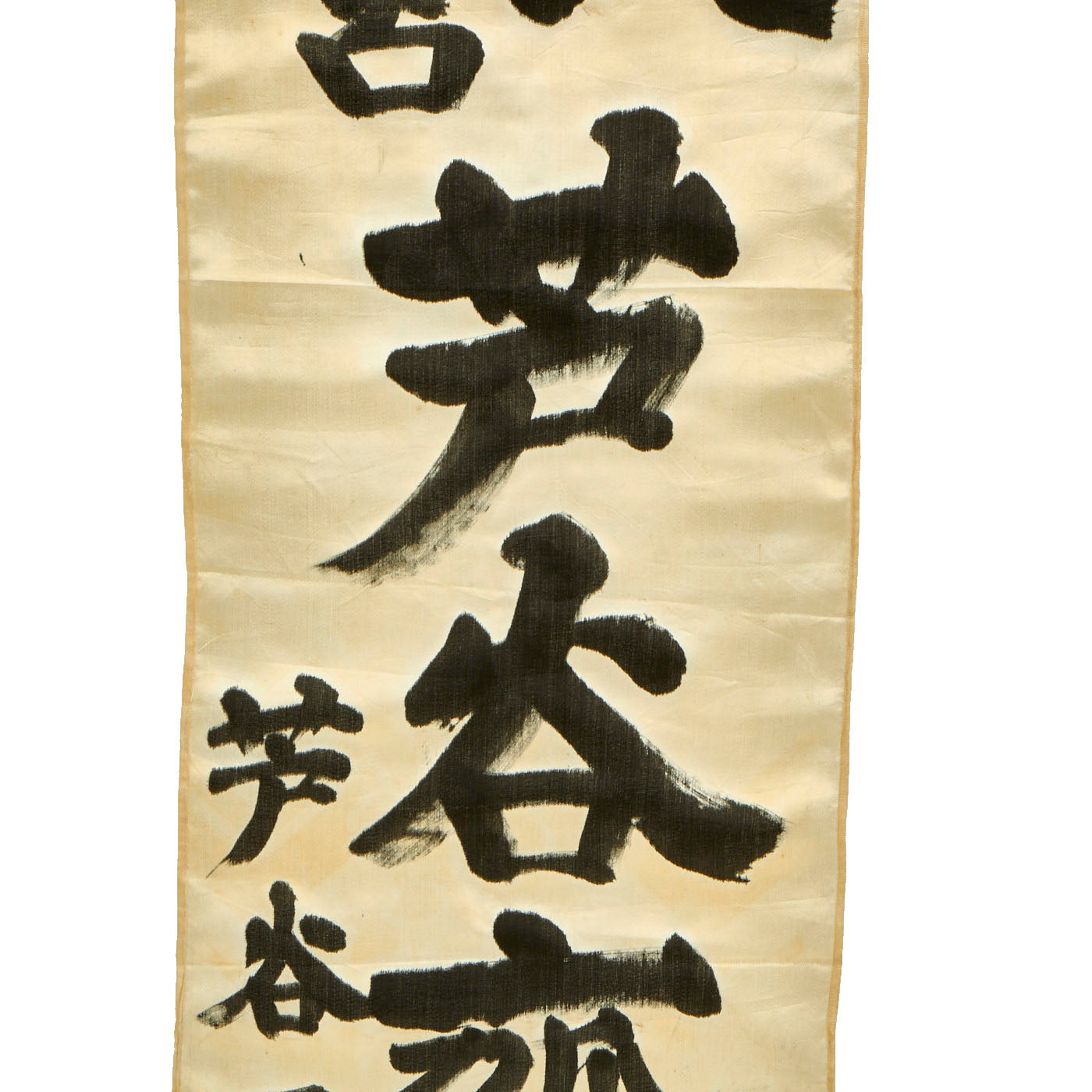 This example is approximately 52” in length with a 13” width. Unfortunately it is torn at the bottom. We have been unable to translate the Kanji that is painted on it, making for a great research opportunity.