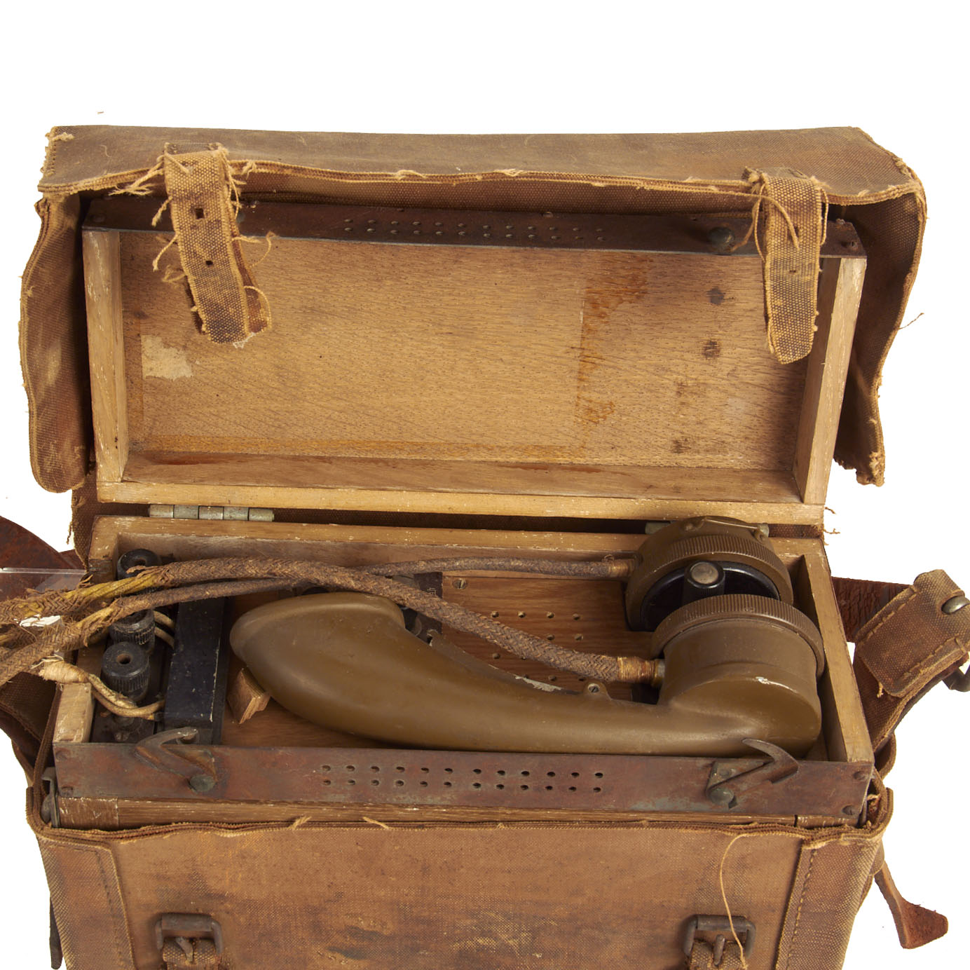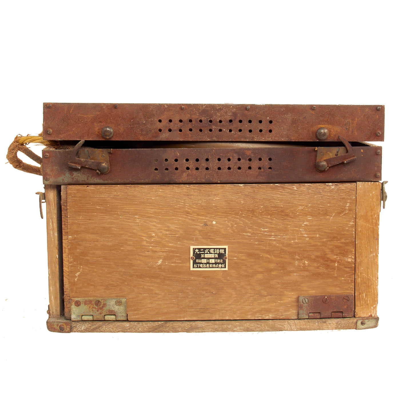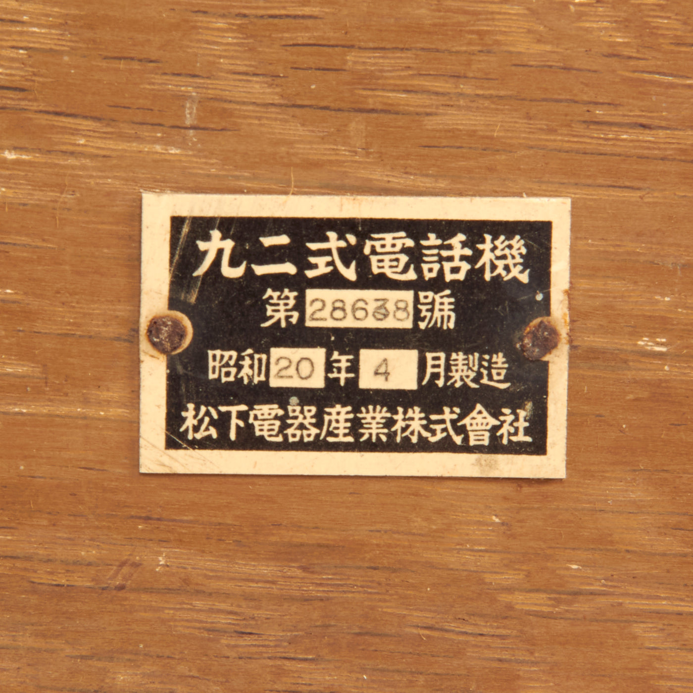 From the data plate visible on the back of the one unit, without the rubberized canvas case, these radios are a 九二式電話機 (Type 92 telephone). We did not attempt to remove the other phone unit from the case due to its fragile state. The Type 92 without the case is identical and has the following information located on the small data plate on the front:
