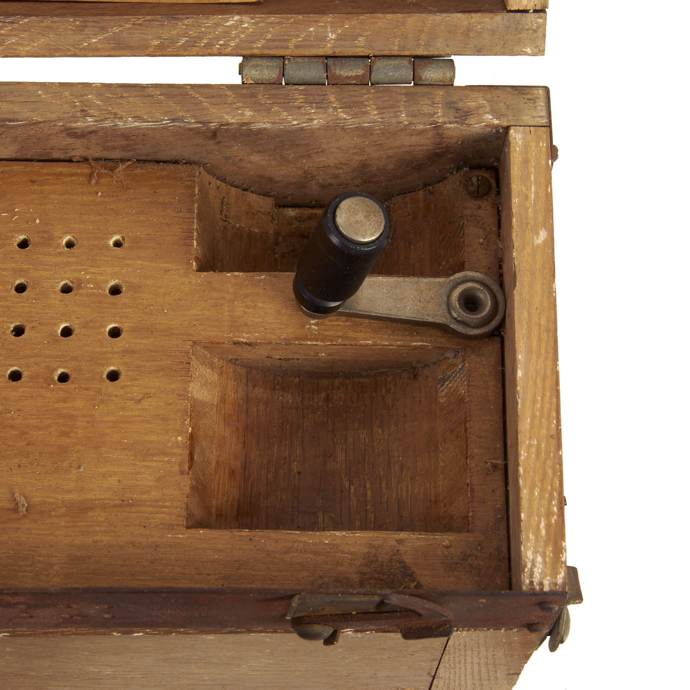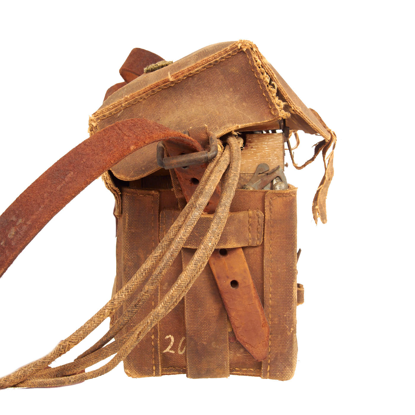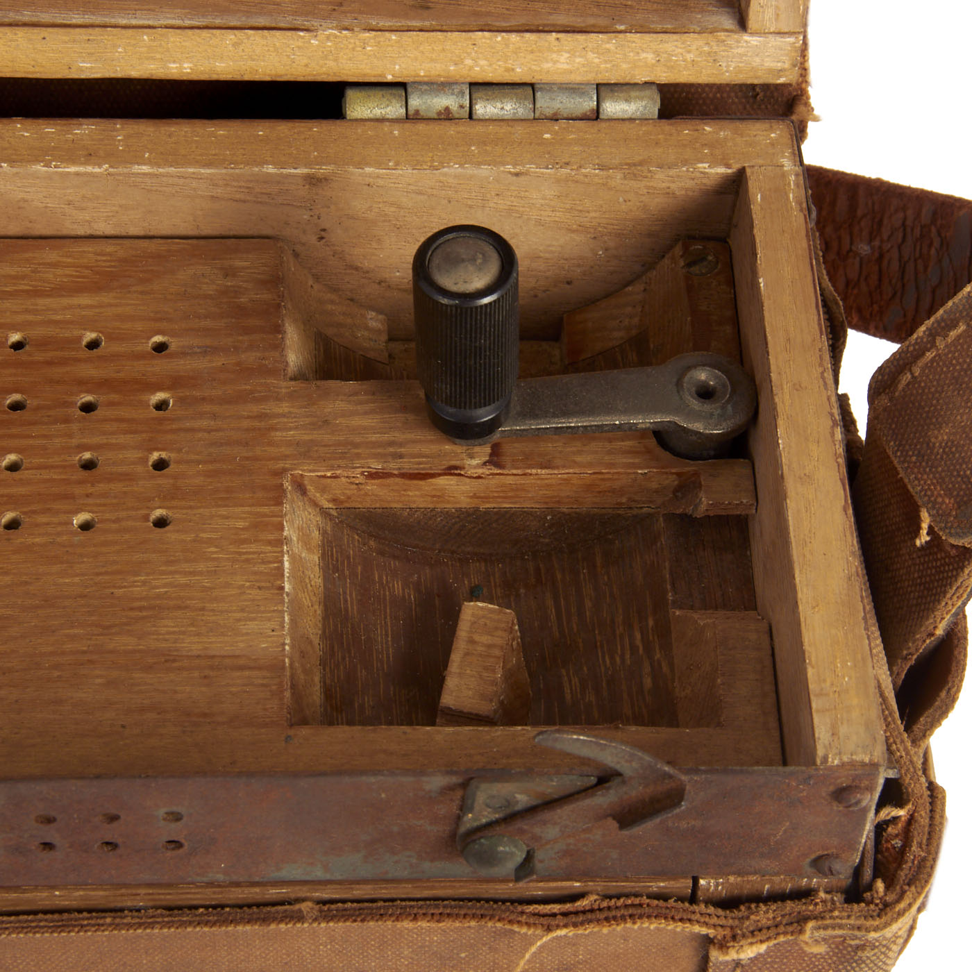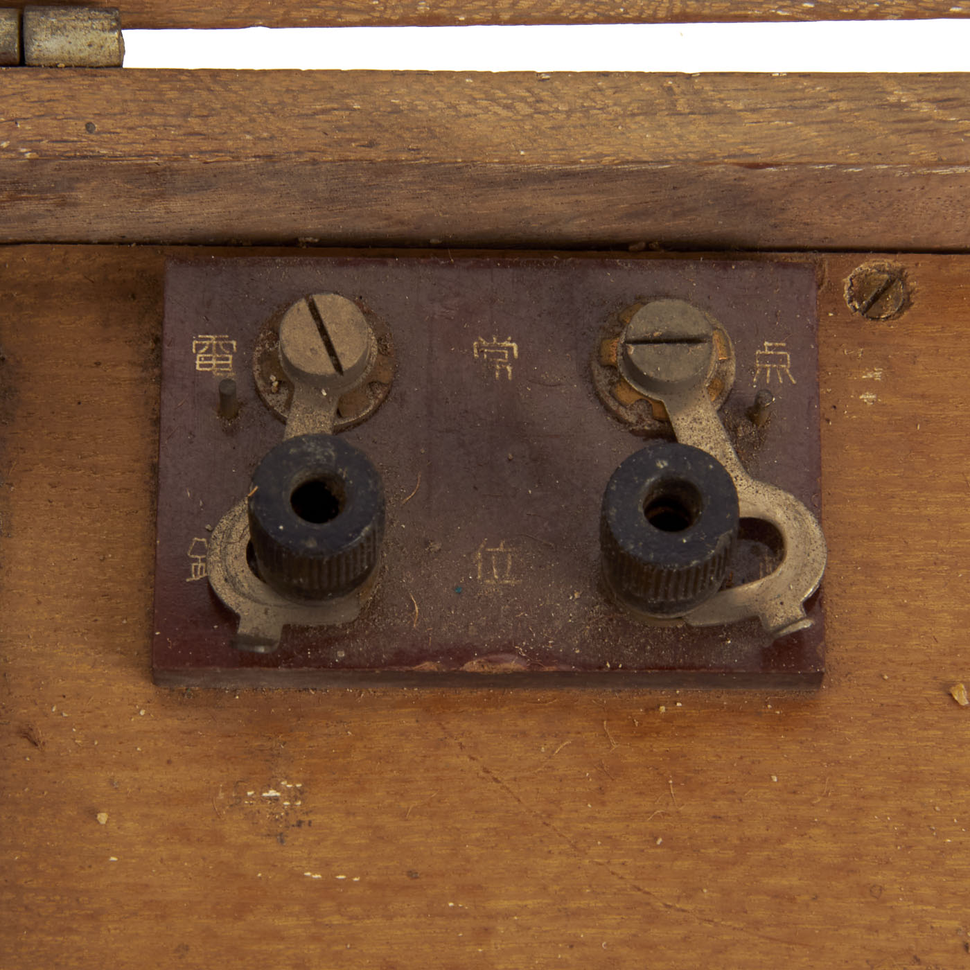 From the data plate visible on the back of the one unit, without the rubberized canvas case, these radios are a 九二式電話機 (Type 92 telephone). We did not attempt to remove the other phone unit from the case due to its fragile state. The Type 92 without the case is identical and has the following information located on the small data plate on the front: